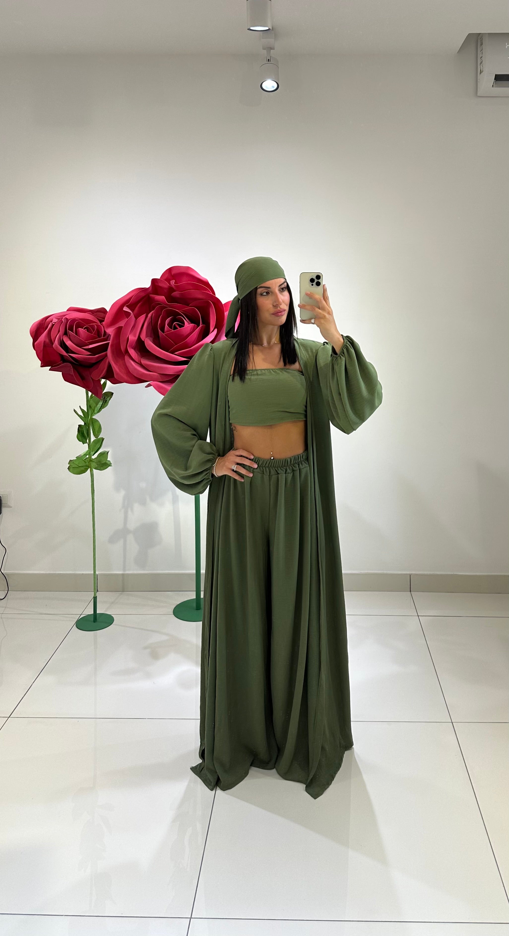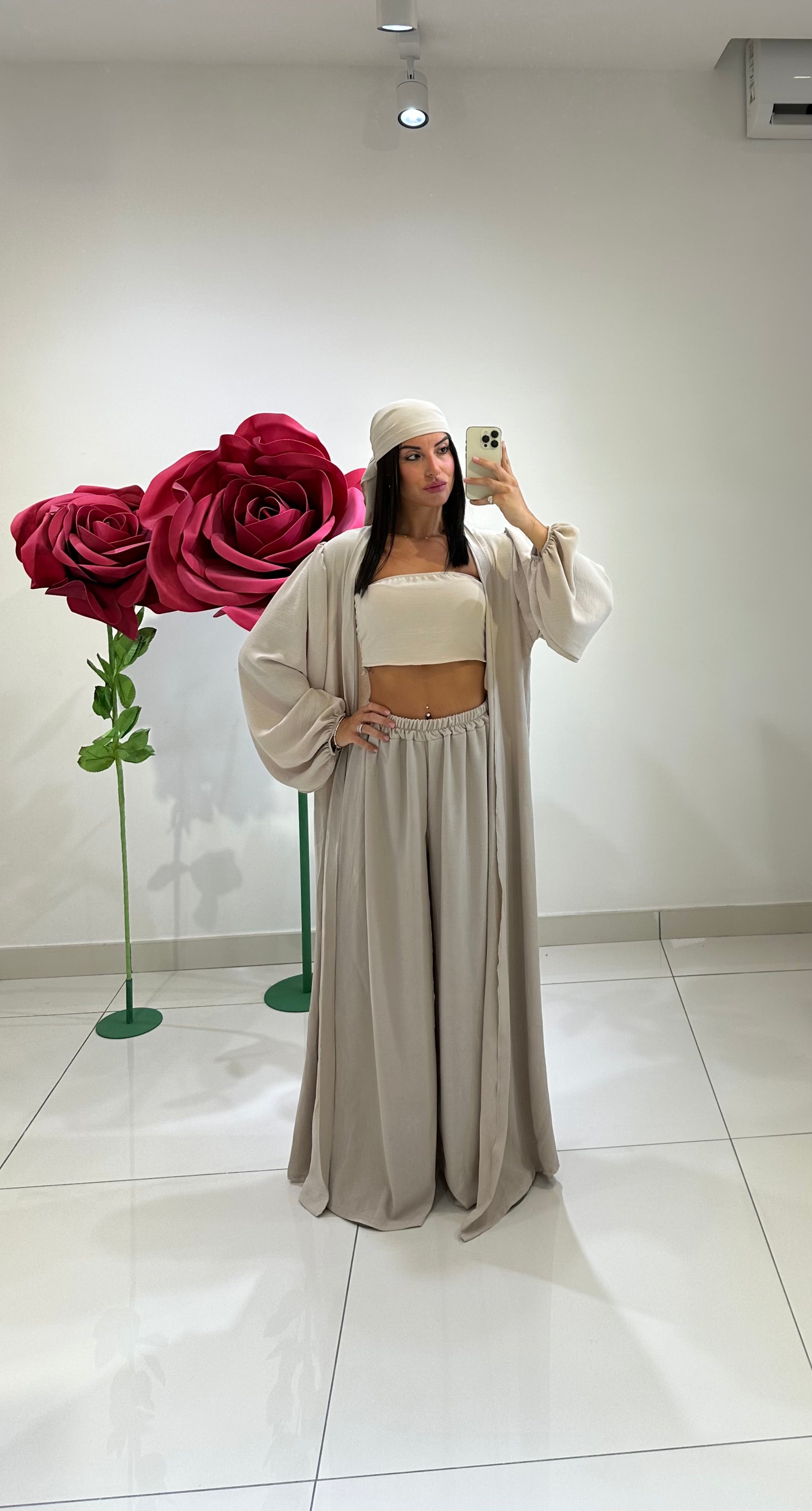 SET IN SIMIL LINO, TOP A FASCIA, PANTALONE GAMBA LARGA, CARDIGAN LUNGO CON MANICA A SBUFFO, BANDANA. IN VARI COLORI