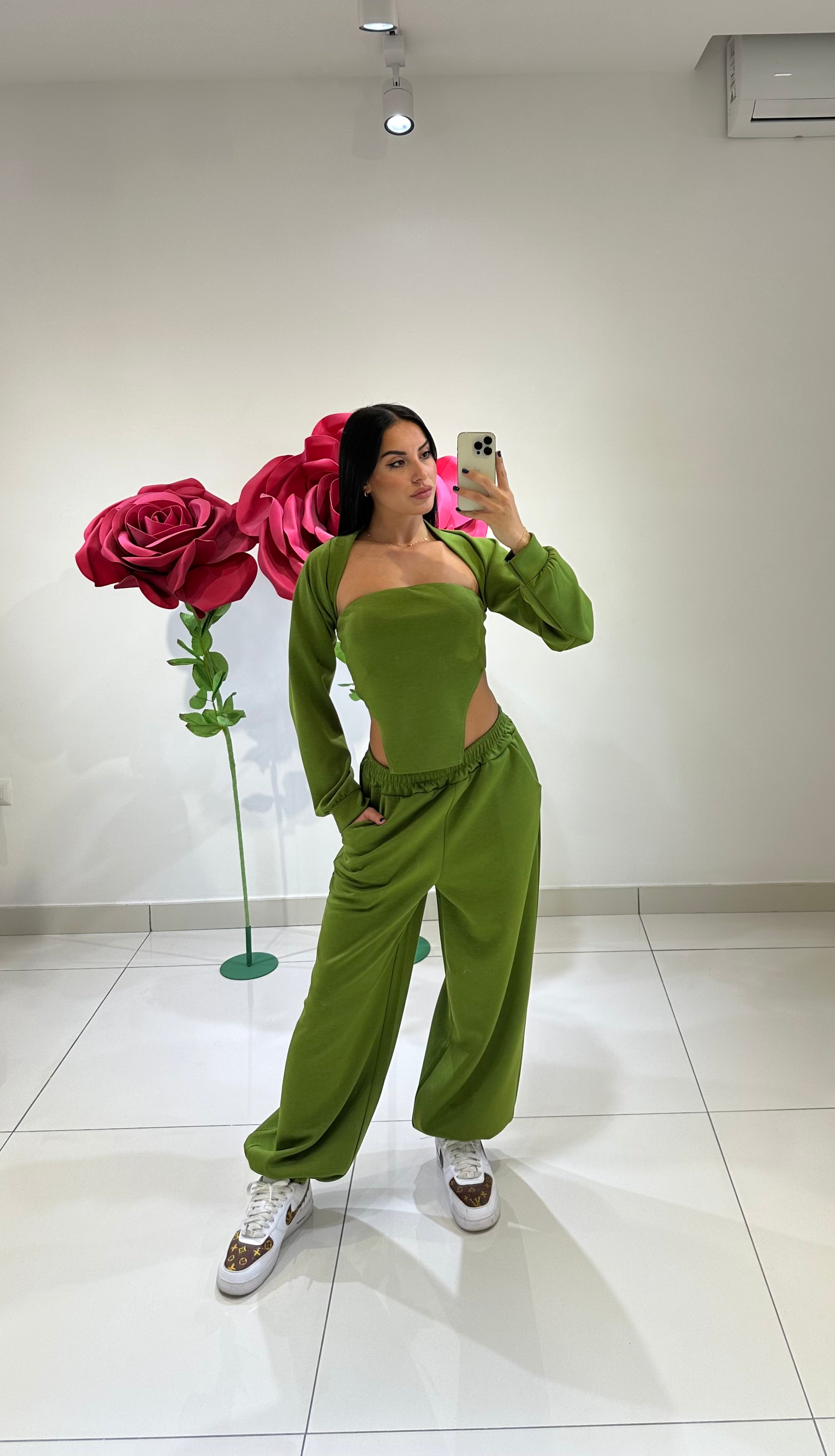 SET IN FELPA, COMPOSTO DA CORSETTO CON COPPE PREFORMATE, PANTALONE BALLOON E COPRISPALLE. IN VARI COLORI