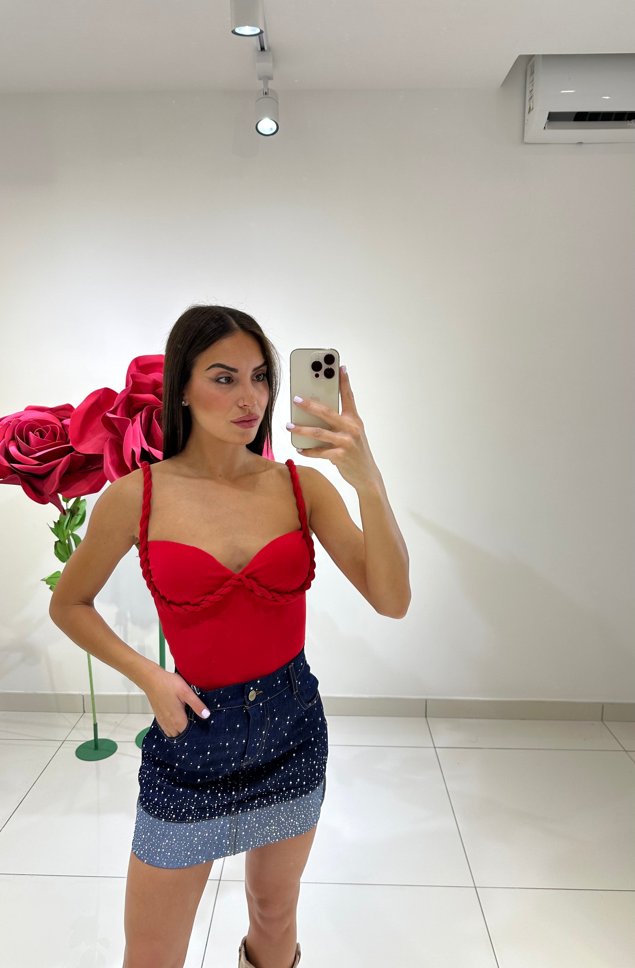 BLAZER OVER, PARTE SUPERIORE IN DENIM CON APPLICAZIONI FIORI STRASS, FODERATO ALL’INTERNO CON SPALLINE. IN VARI COLORI