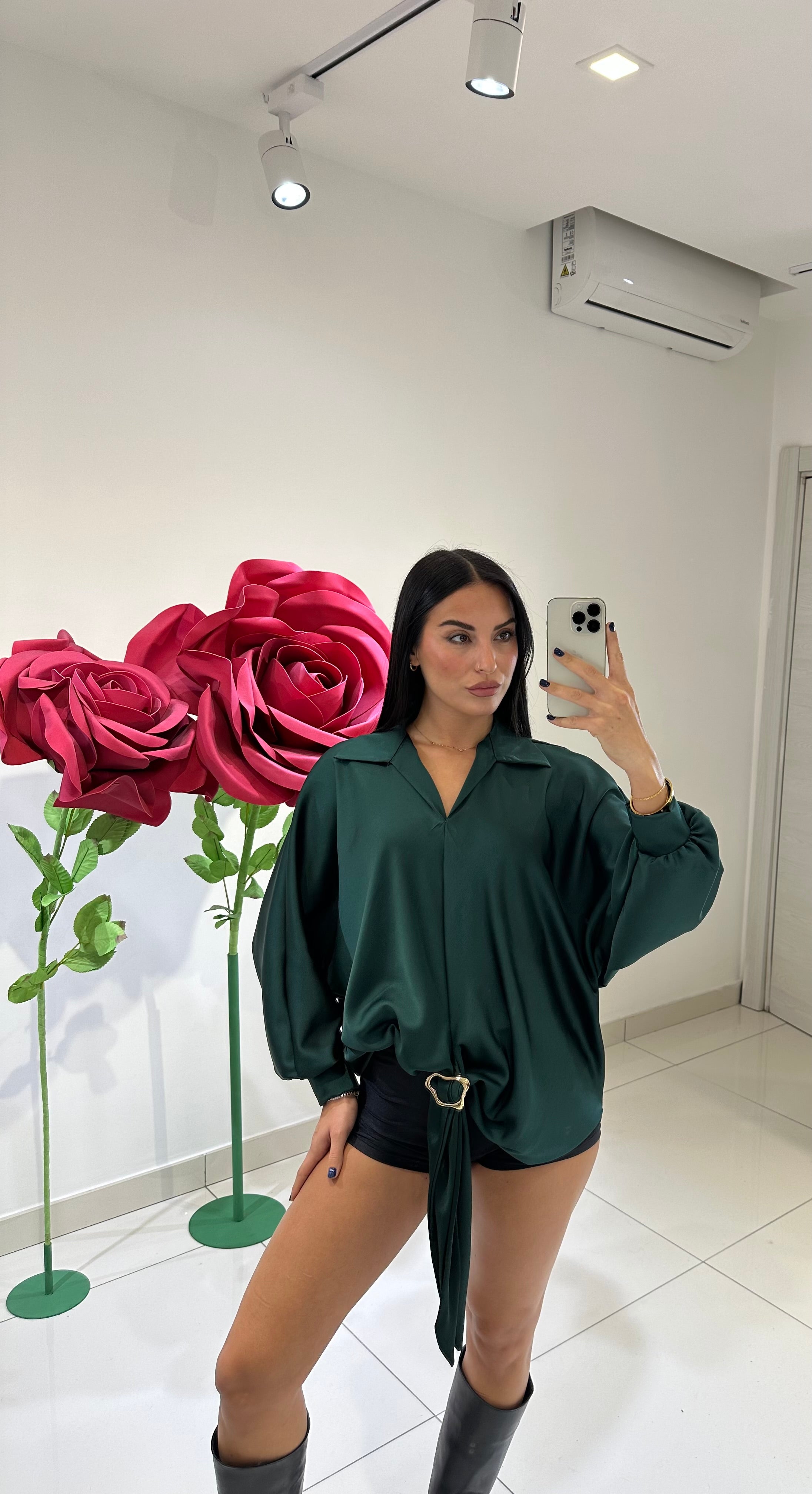 BLUSA IN RASO, VESTIBILITÀ MORBIDA, COLLETTO E SCOLLO A V, MANICA A SBUFFO E DETTAGLIO ORO. IN VARI COLORI