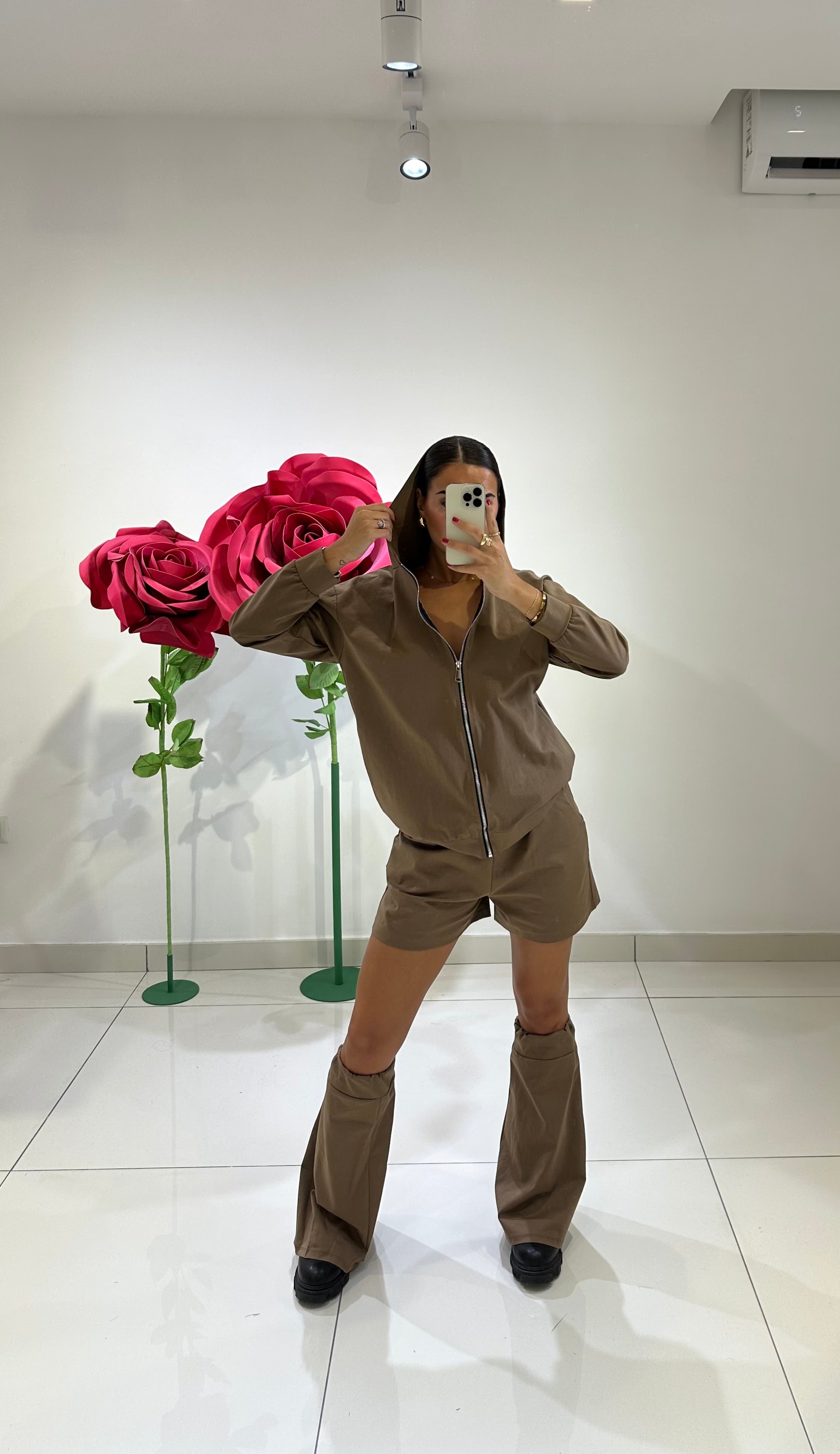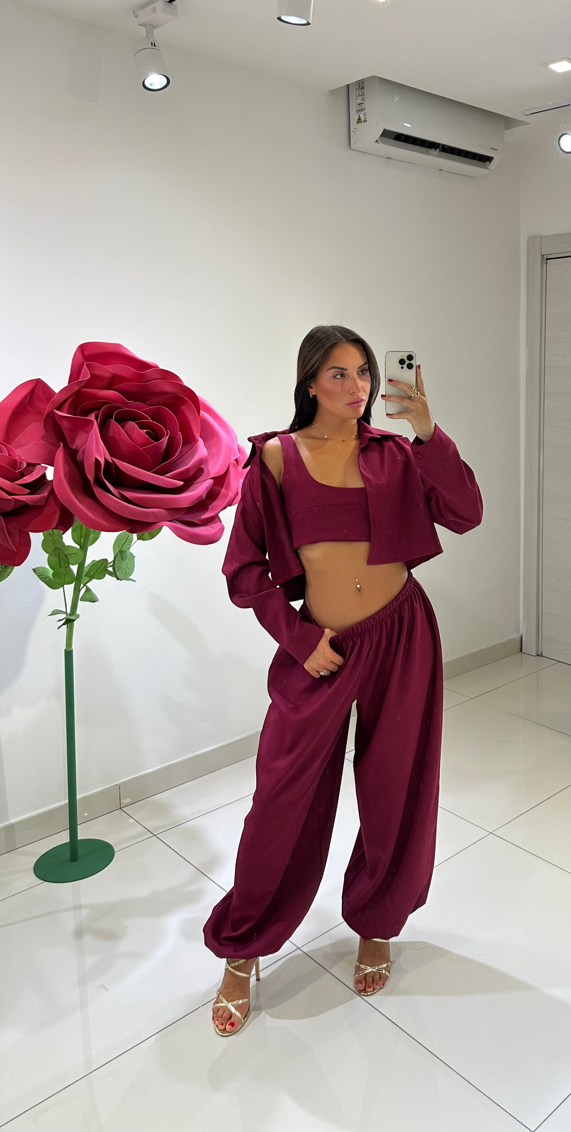 COORDSET COMPOSTO DA TOP CON AMPIO SCOLLO E FASCIA ELASTICA SUL RETRO, JACKET CROP E PARACUTE BALLON. IN VARI COLORI