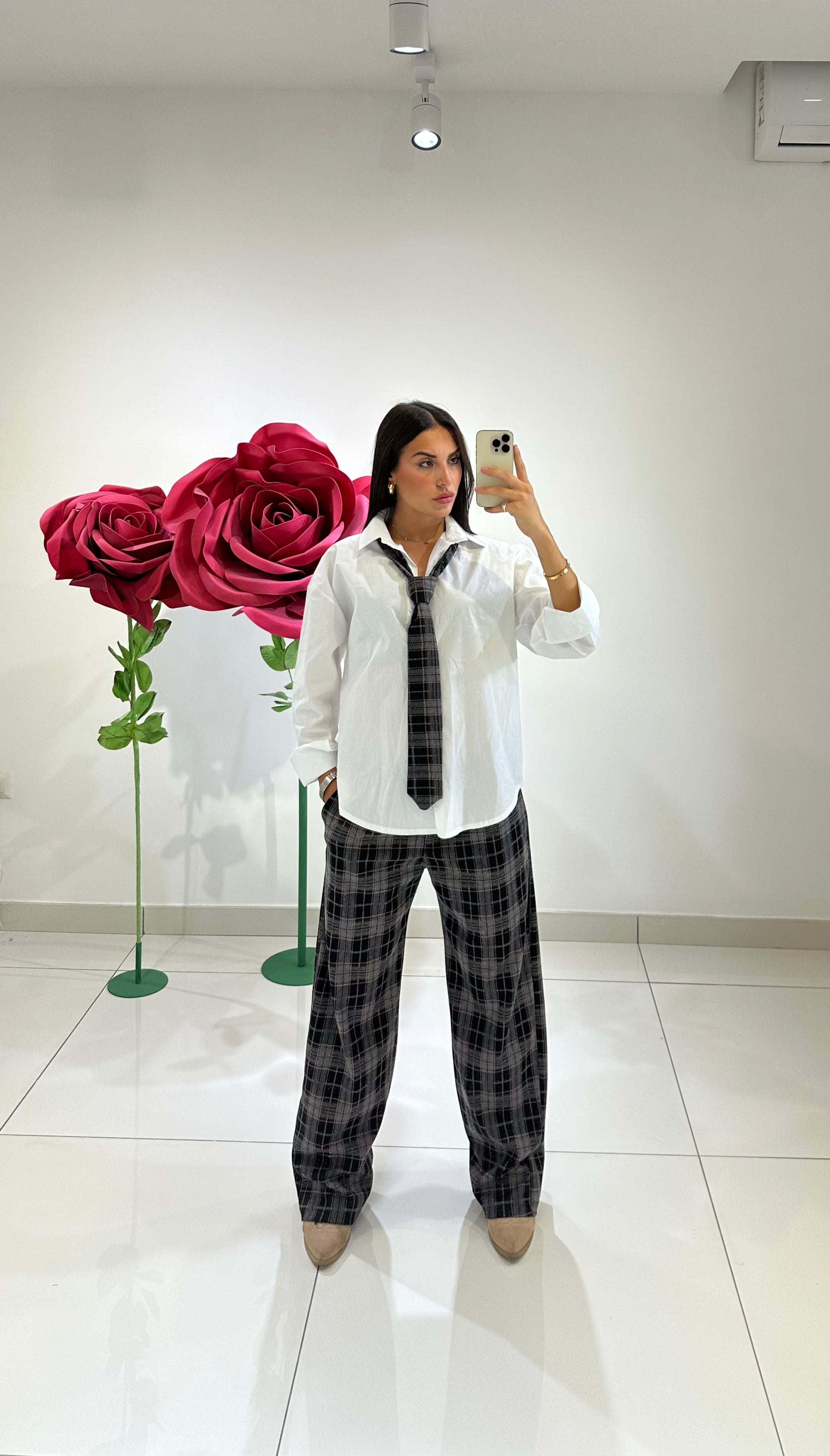 COORDSET COMPOSTO DA CAMICIA OVER CON CRAVATTA A QUADRI IN FLANELLA DELLA STESSA COLORAZIONI DEL PANTALONE PALAZZO. IN VARI COLORI