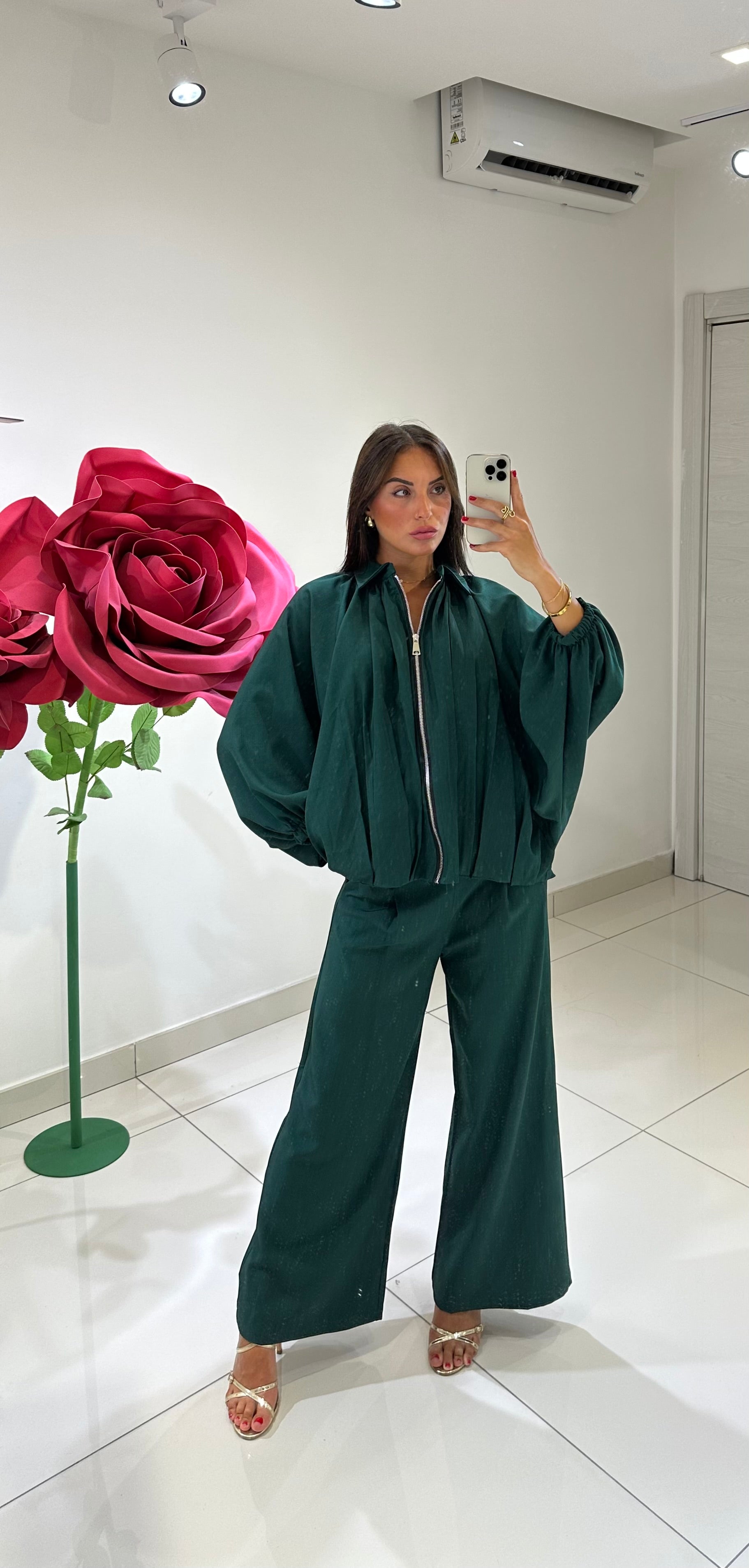 COORDSET CON GIACCA ZIP, PIEGHE SUL DAVANTI MANICA LUNGA A SBUFFO, EFFETTO OVER, PANTALONE PALAZZO CON ELASTICO SUL RETRO E TASCHE. IN VARI COLORI