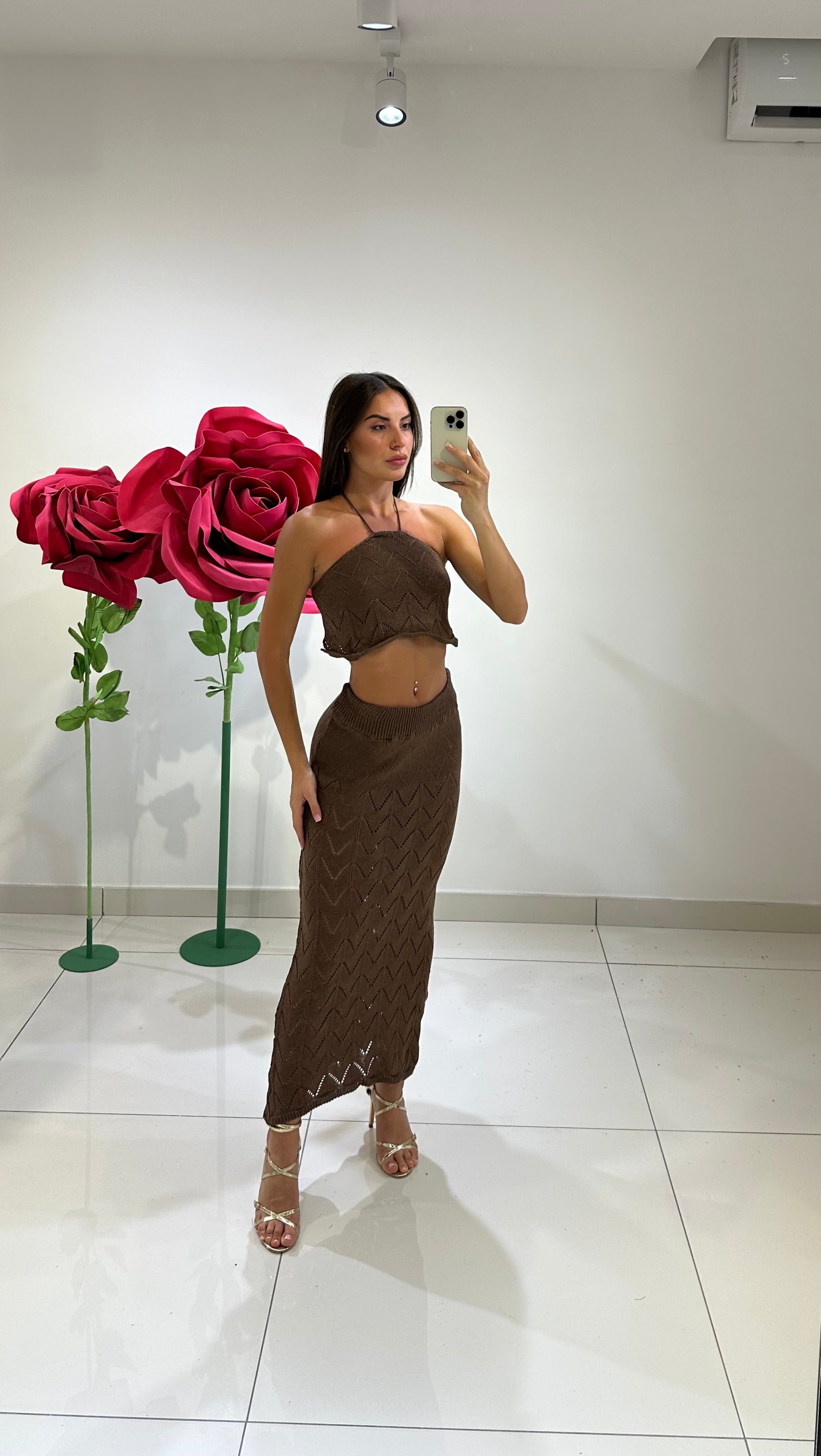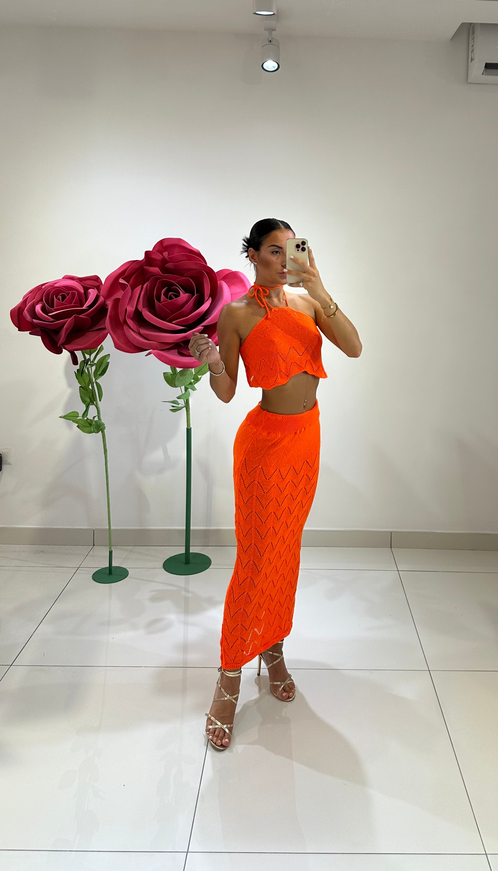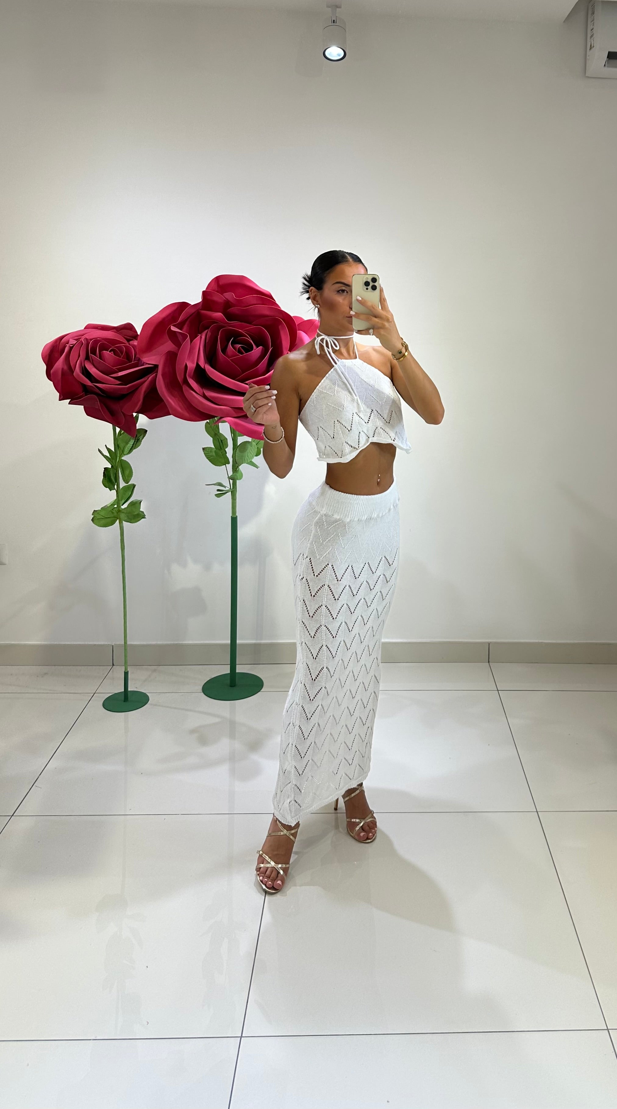 COORDSET IN MAGLIA TUTTA TRAFORATA, TOP SCOLLO ALL’AMERICANA CON SCHIENA SCOPERTA, GONNA LUNGA VITA ALTA CON ELASTICO, IN VARI COLORI