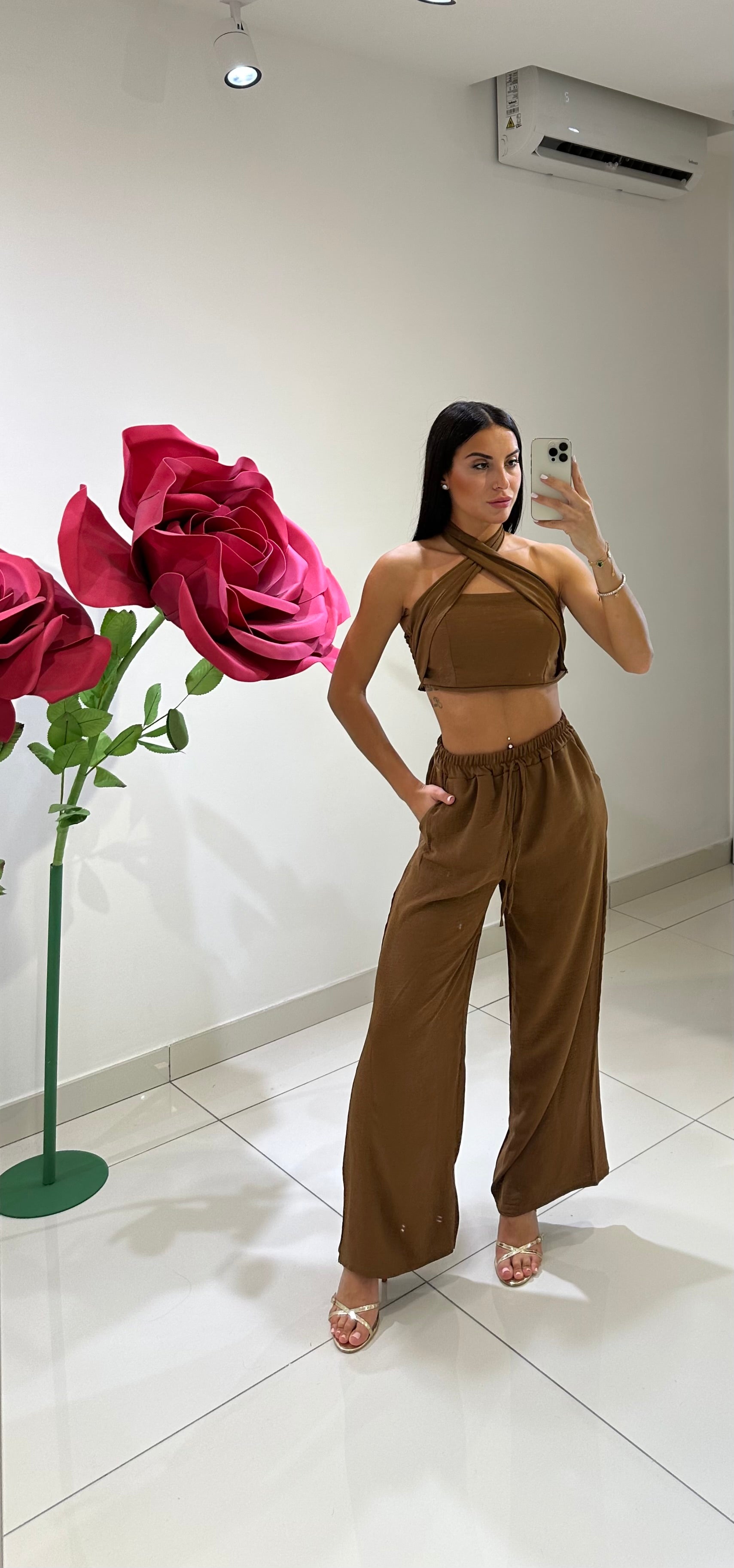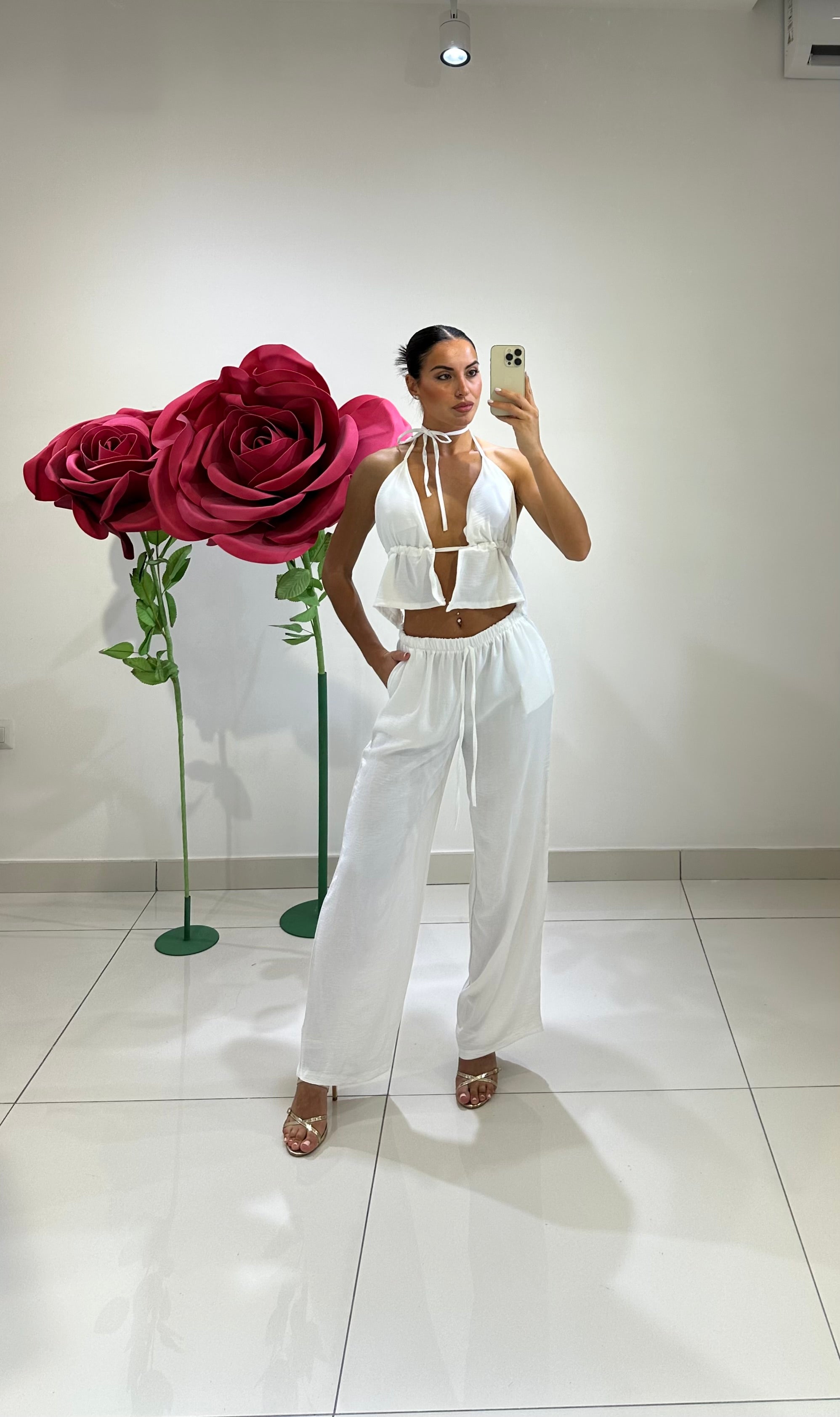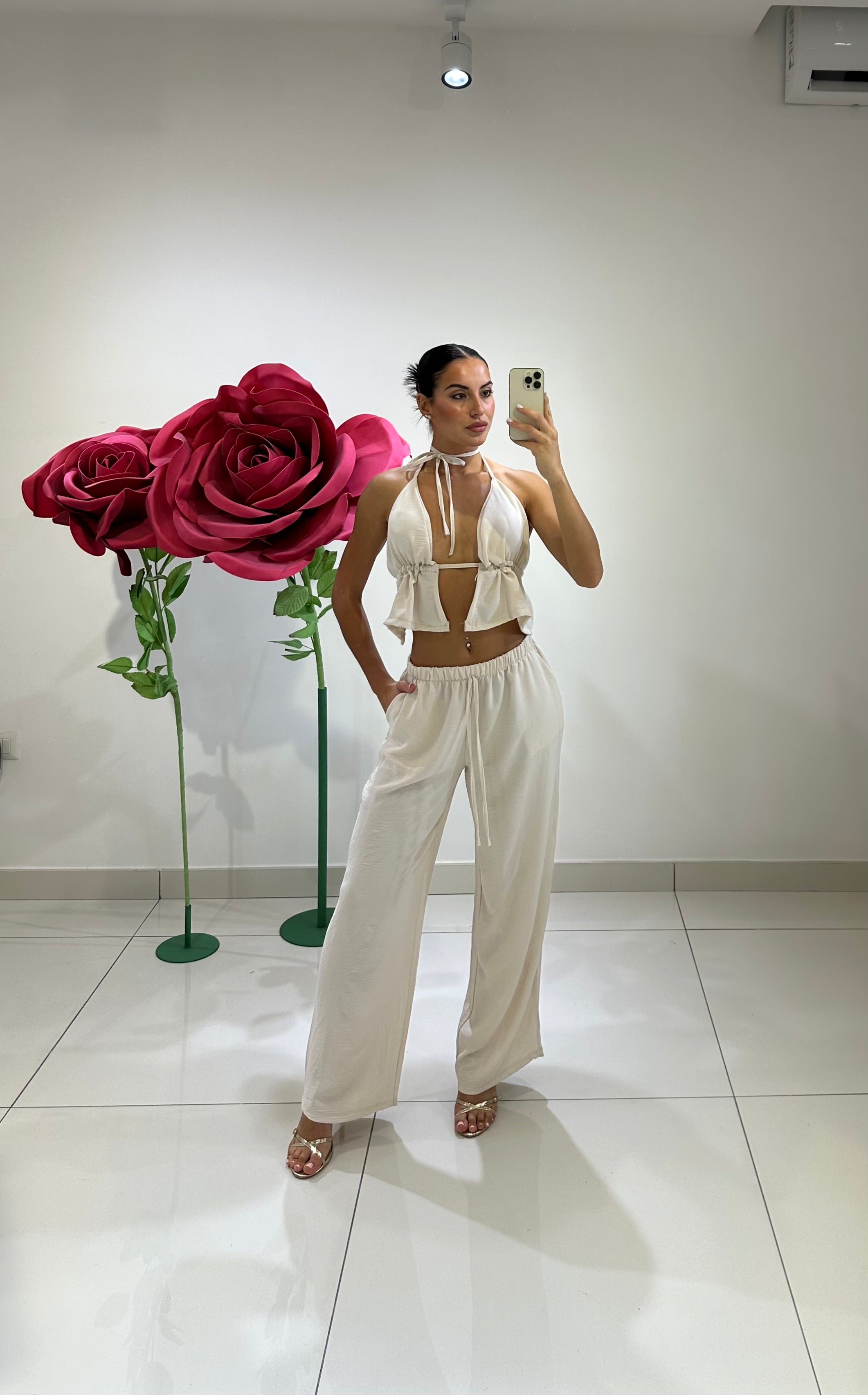 COORDSET IN SIMIL LINO, CORSETTO CON COPPE INCLUSE E FASCE CHE SI LEGANO DIETRO AL COLLO, PANTALONE PALAZZO VITA ALTA ELASTICA, IN VARI COLORI