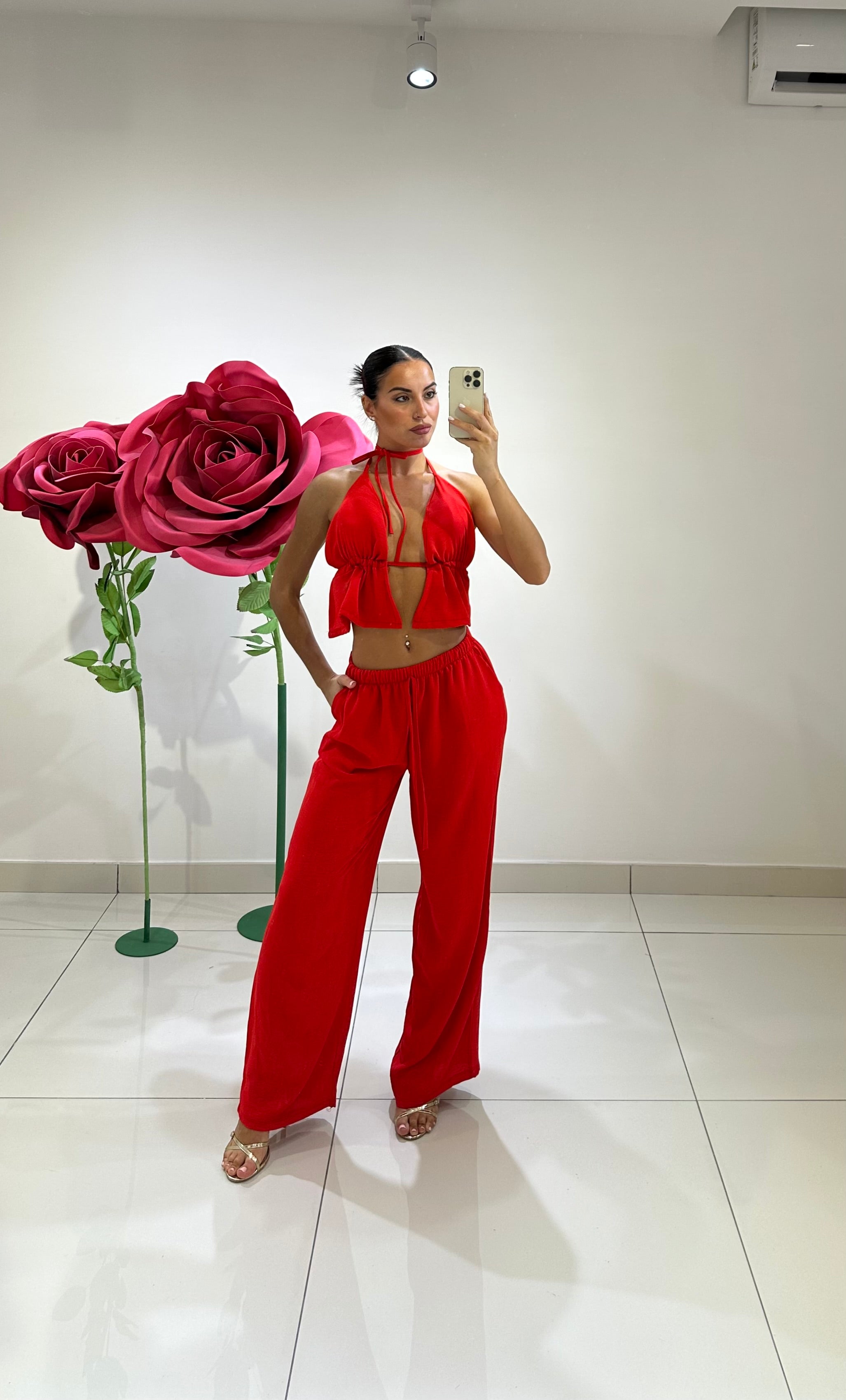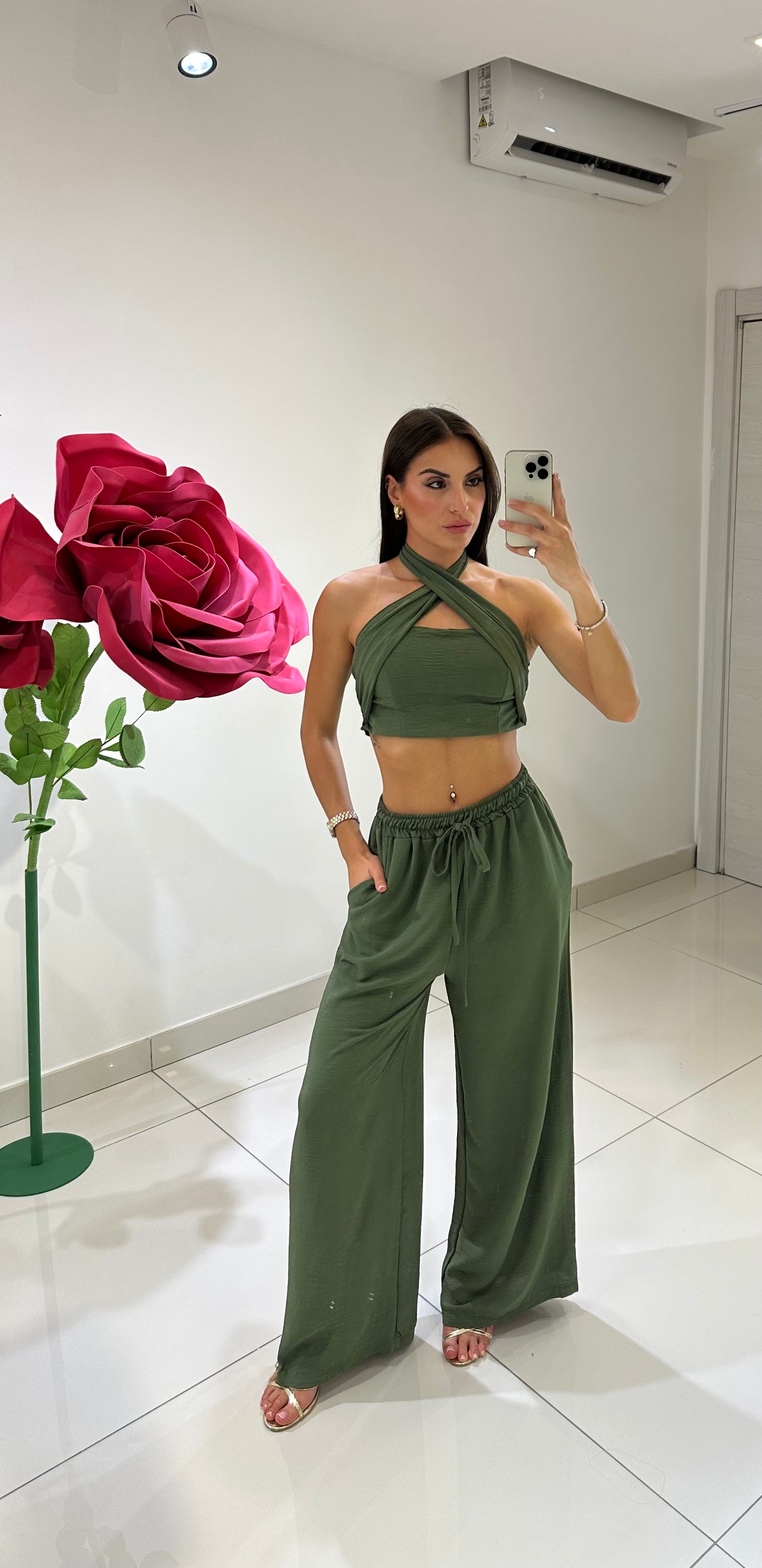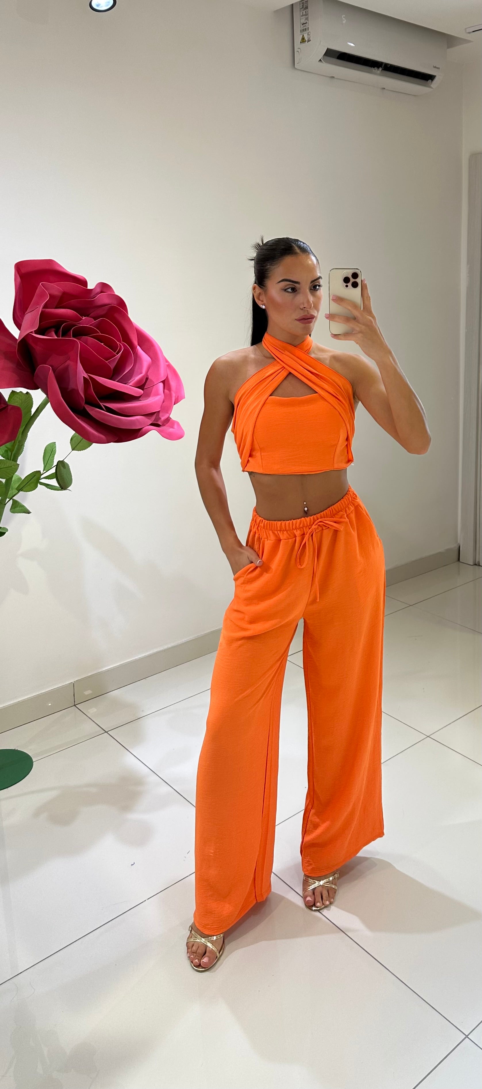 COORDSET IN SIMIL LINO, CORSETTO CON COPPE INCLUSE E FASCE CHE SI LEGANO DIETRO AL COLLO, PANTALONE PALAZZO VITA ALTA ELASTICA, IN VARI COLORI
