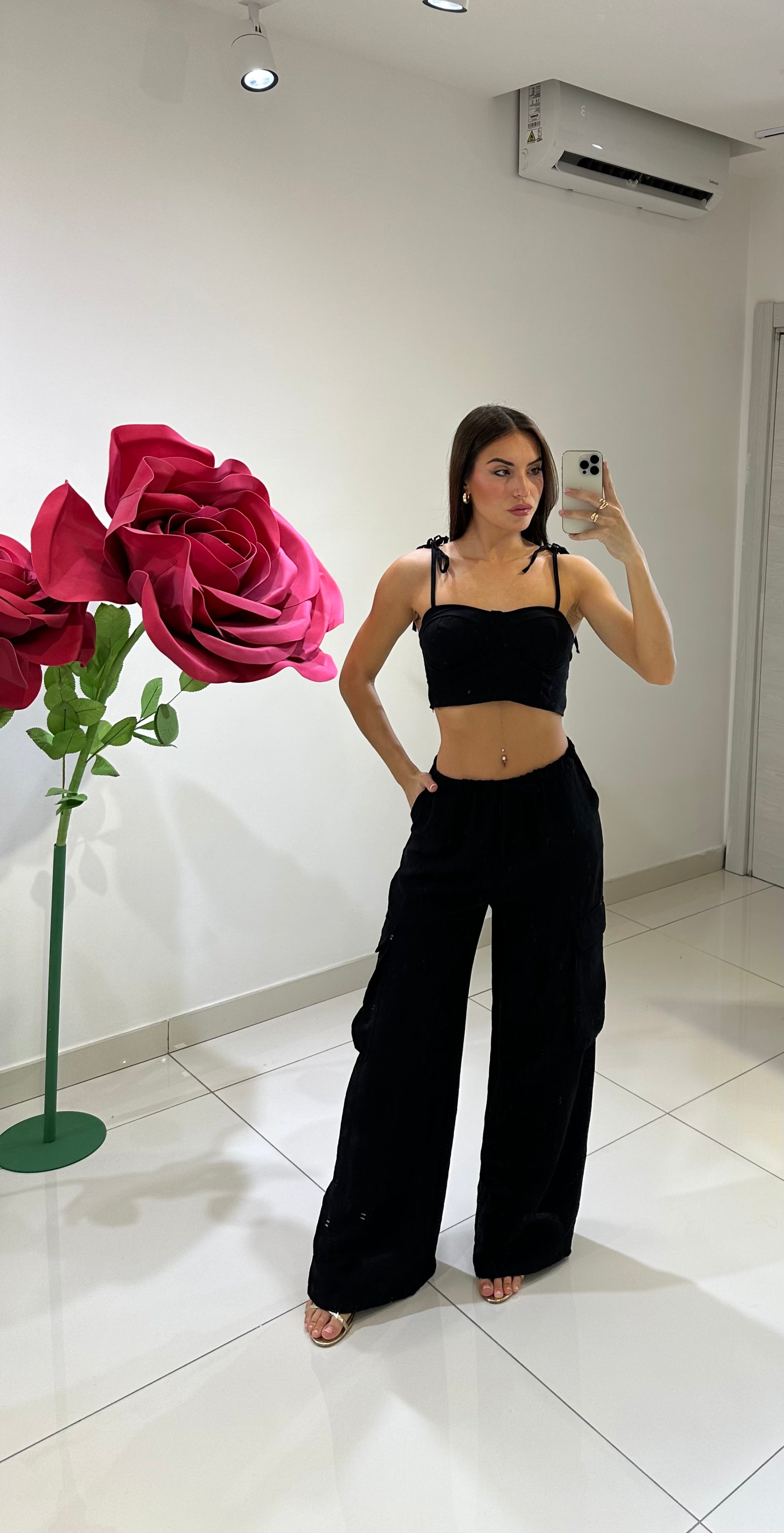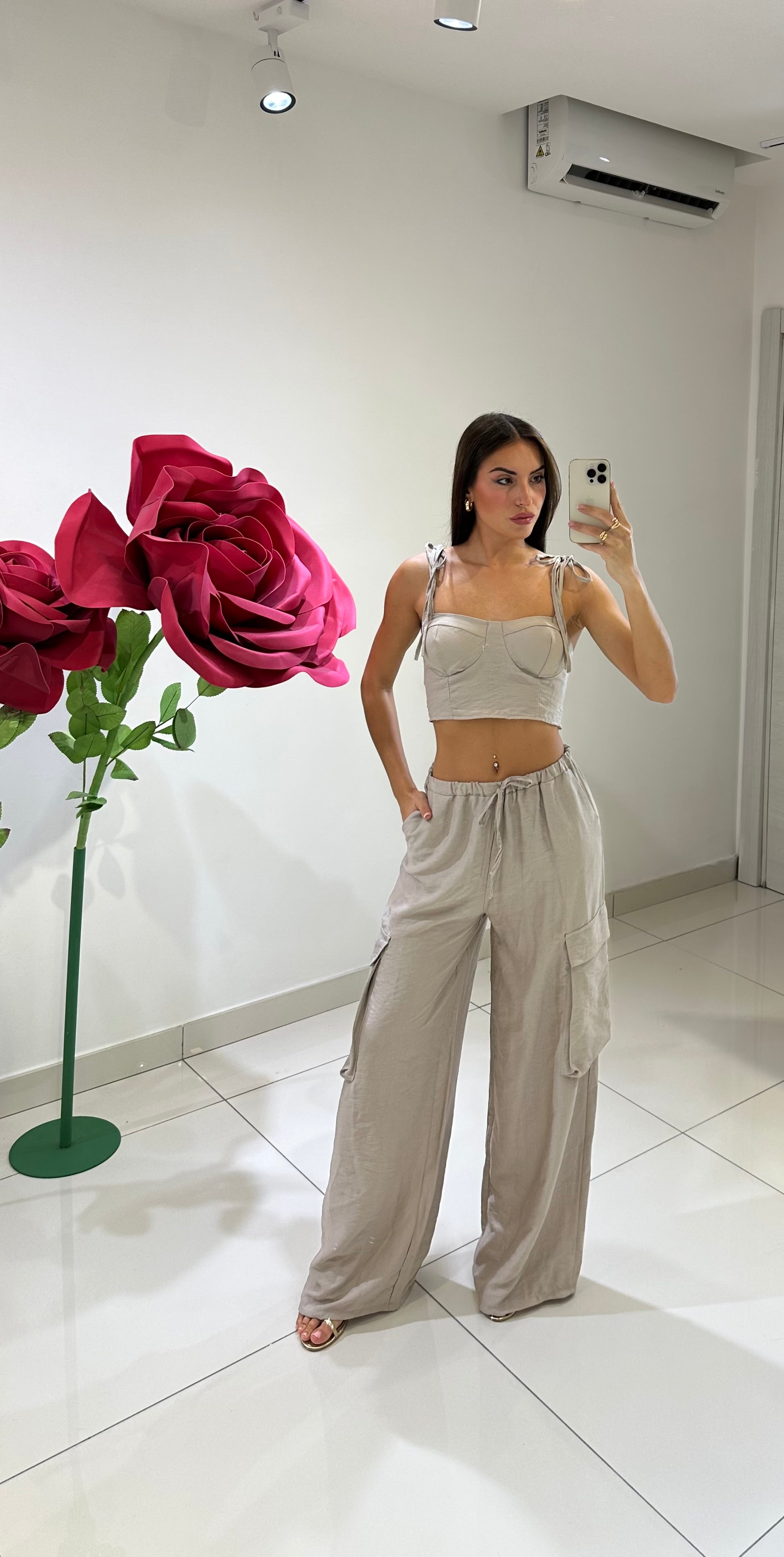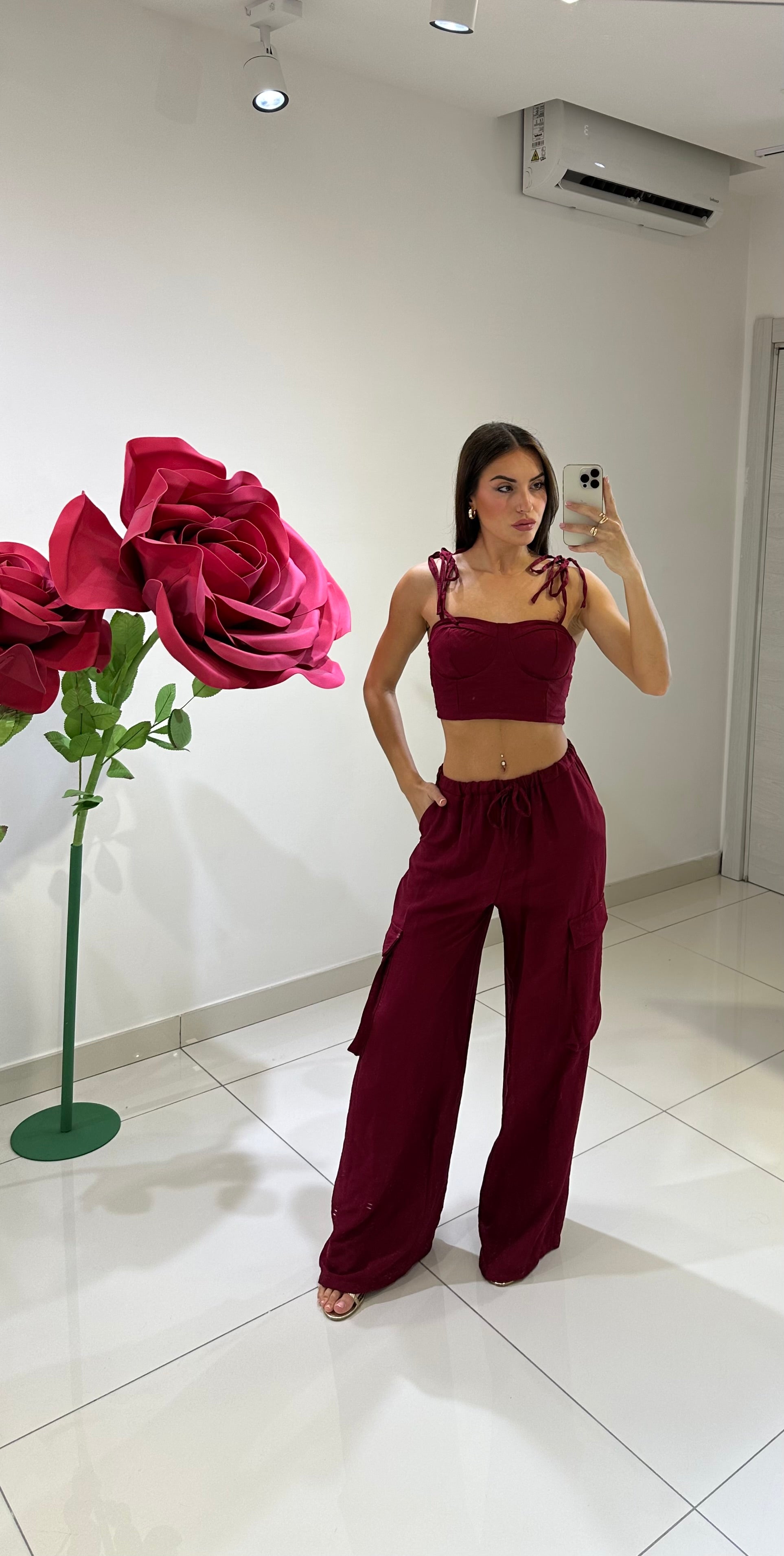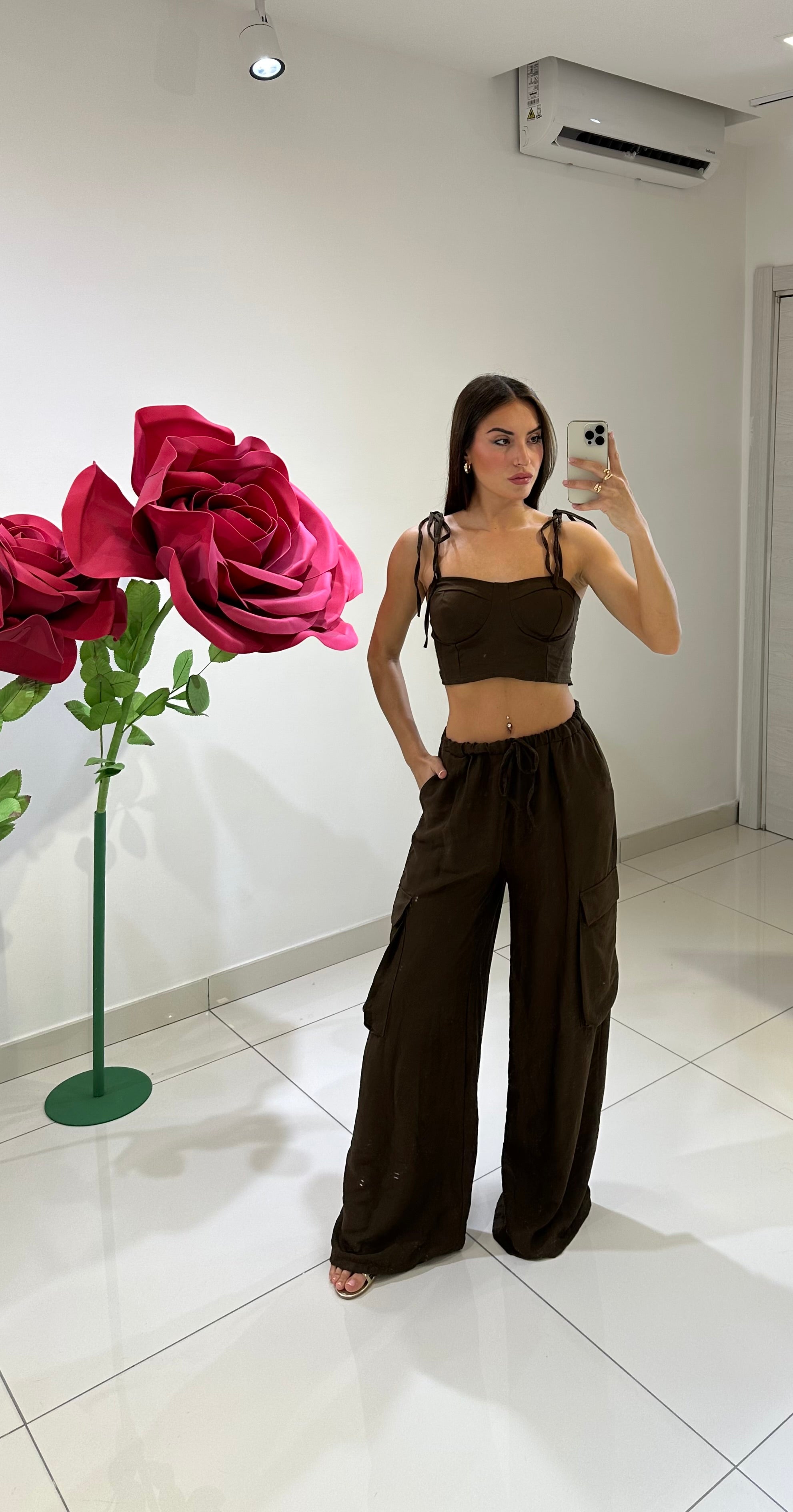 COORDSET IN SIMIL LINO, CORSETTO CON COPPE E PANTALONE CARGO, VITA ALTA CON ELASTICO, IN VARI COLORI