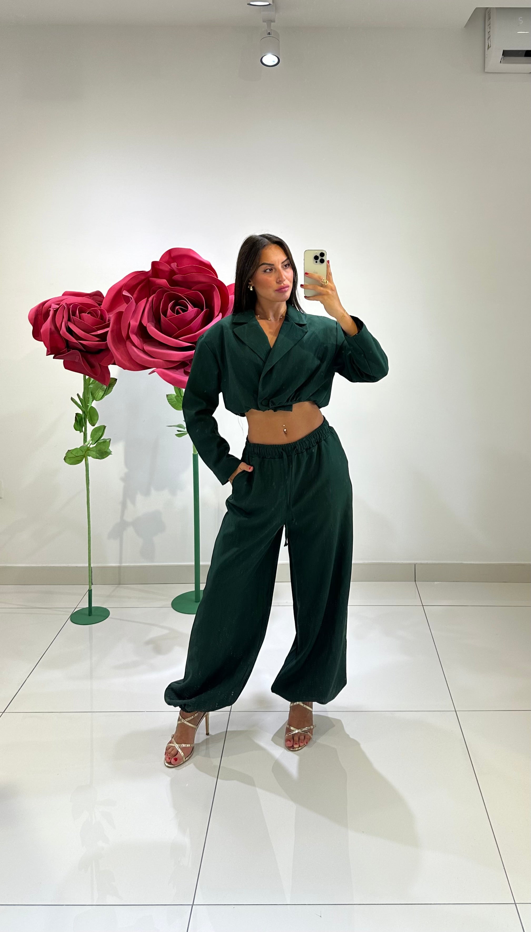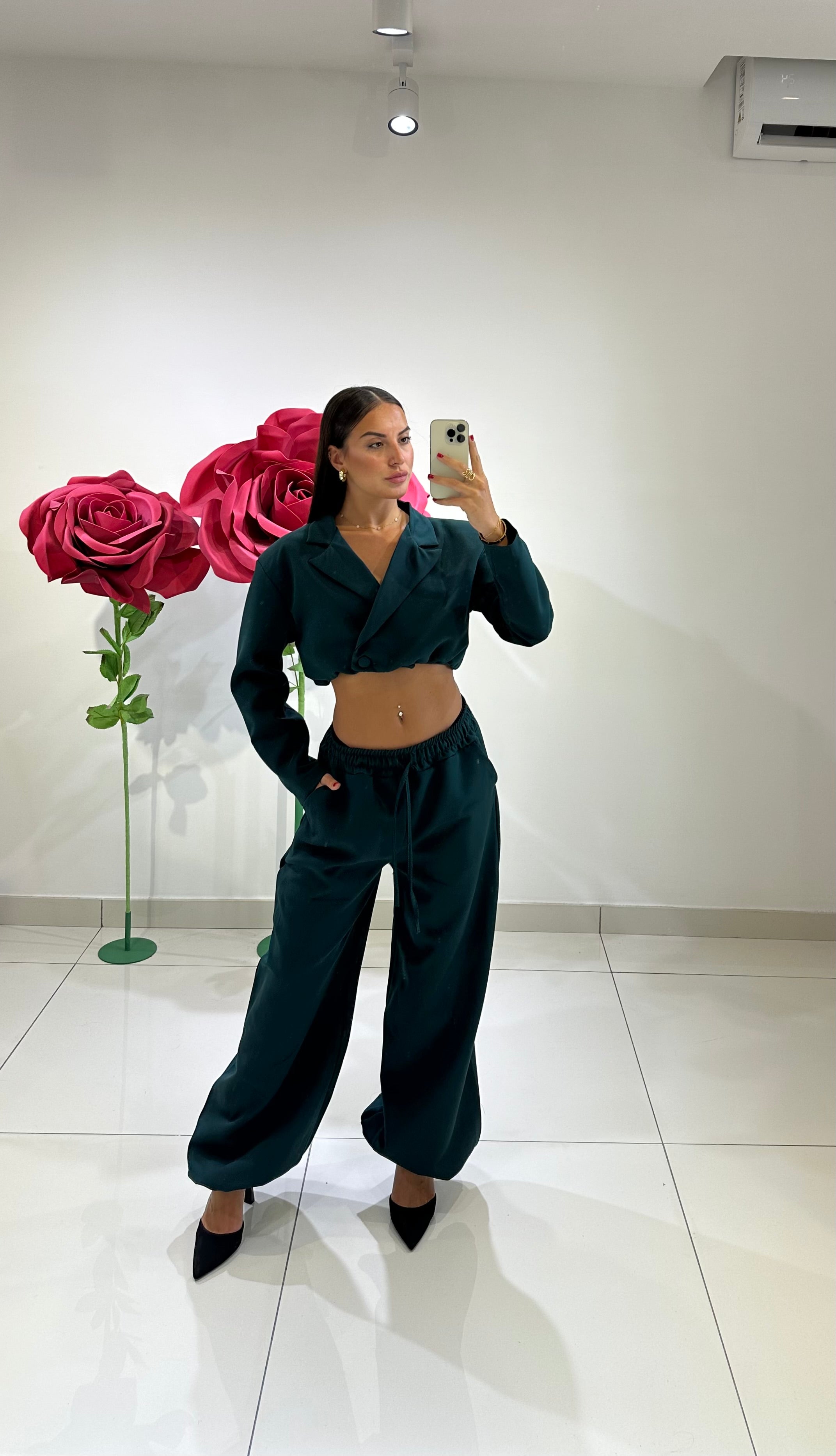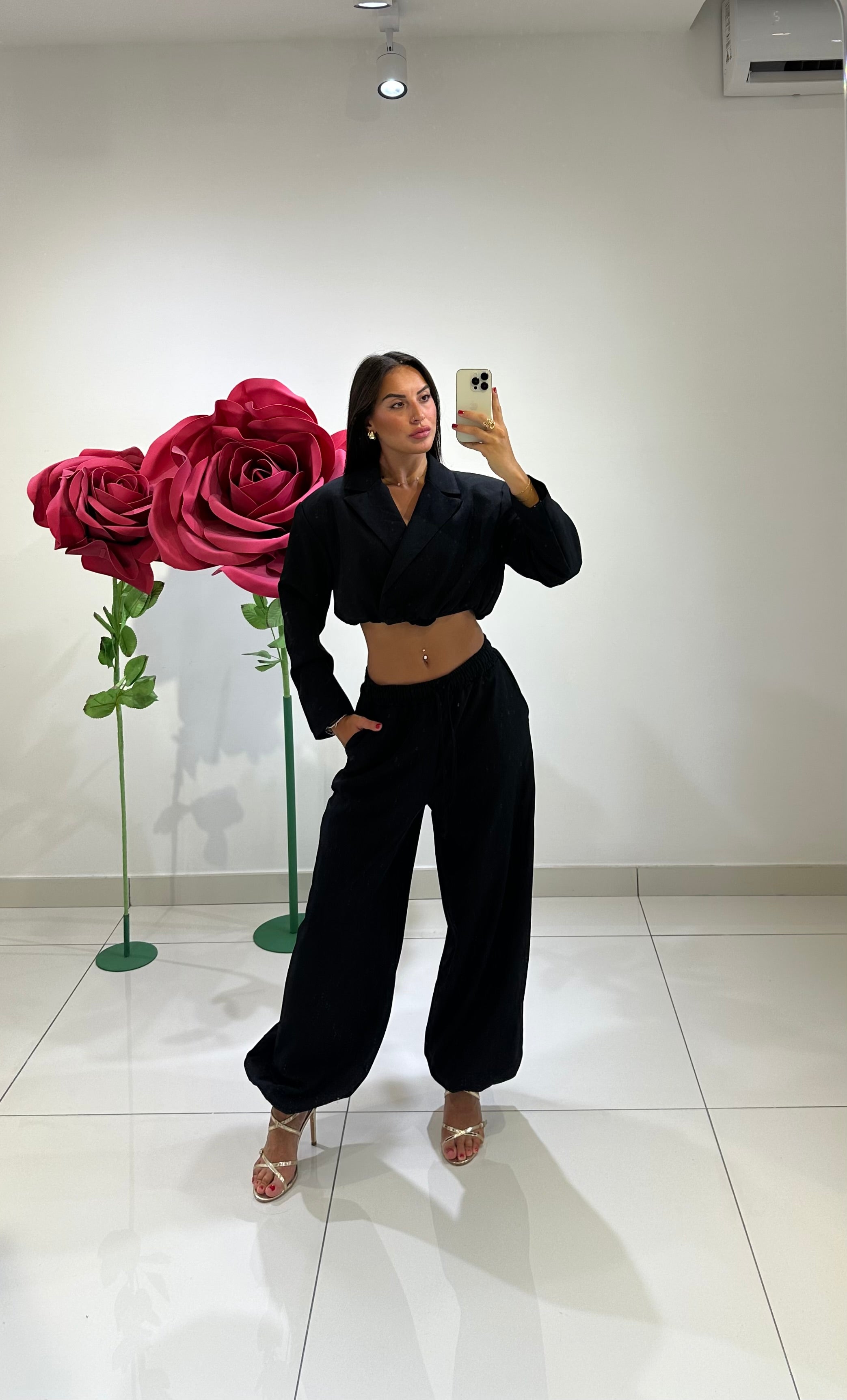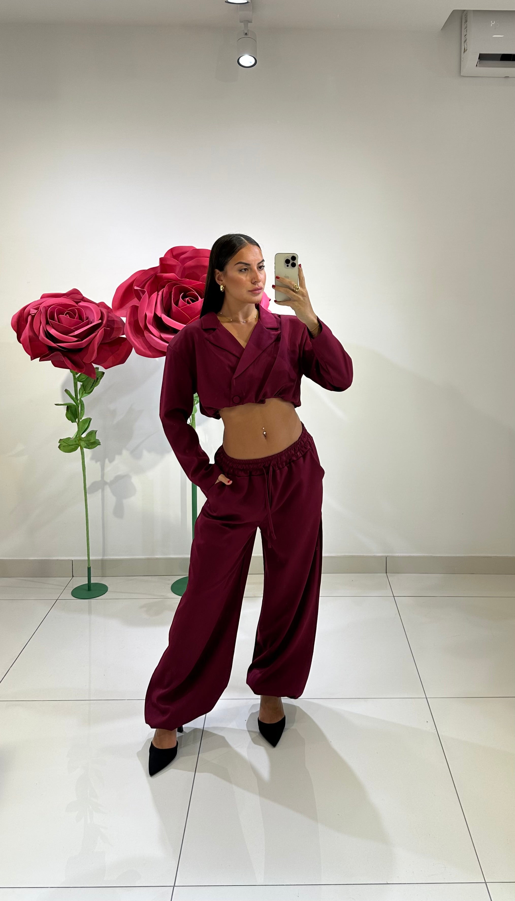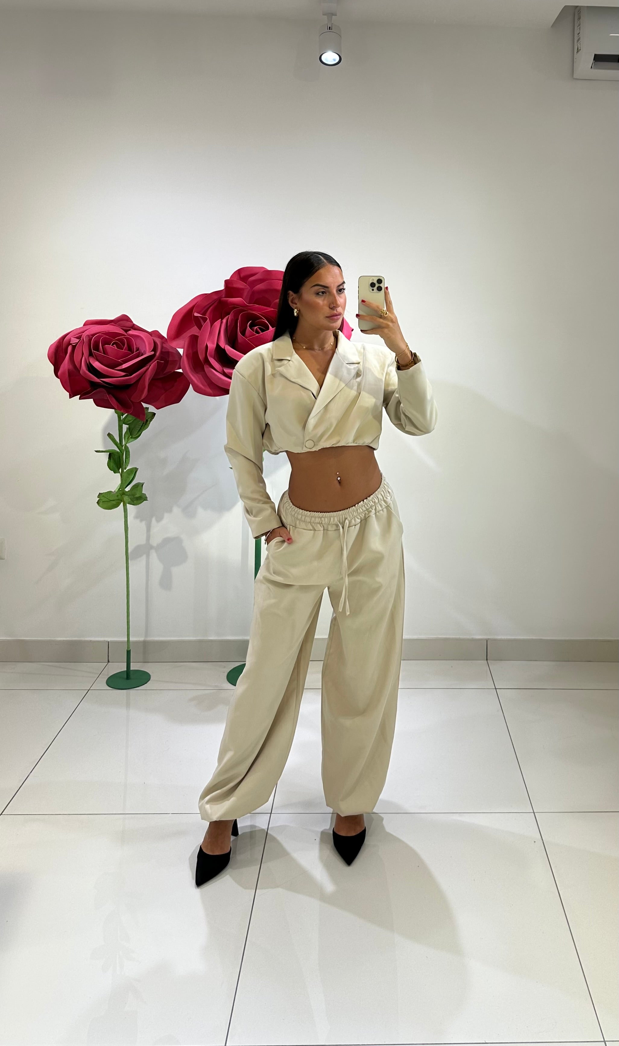 COORDSET CON JACKET CROP, COLLO EFFETTO CAMICIA, TASCHE LATERALI. PANTALONE DI TUTA GAMBA DRITTA, CON ELASTICO IN VITA E TASCHE. IN VARI COLORI