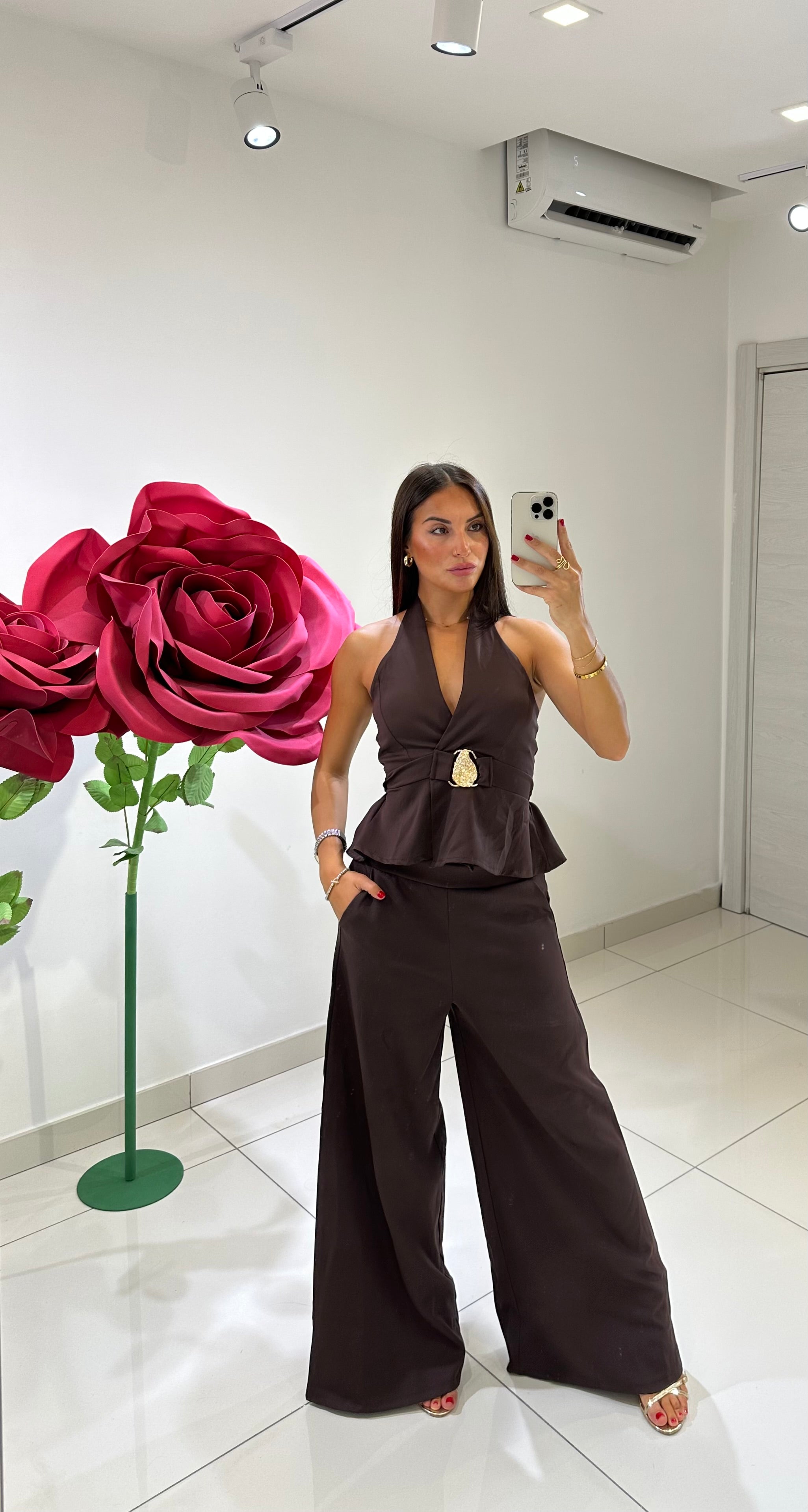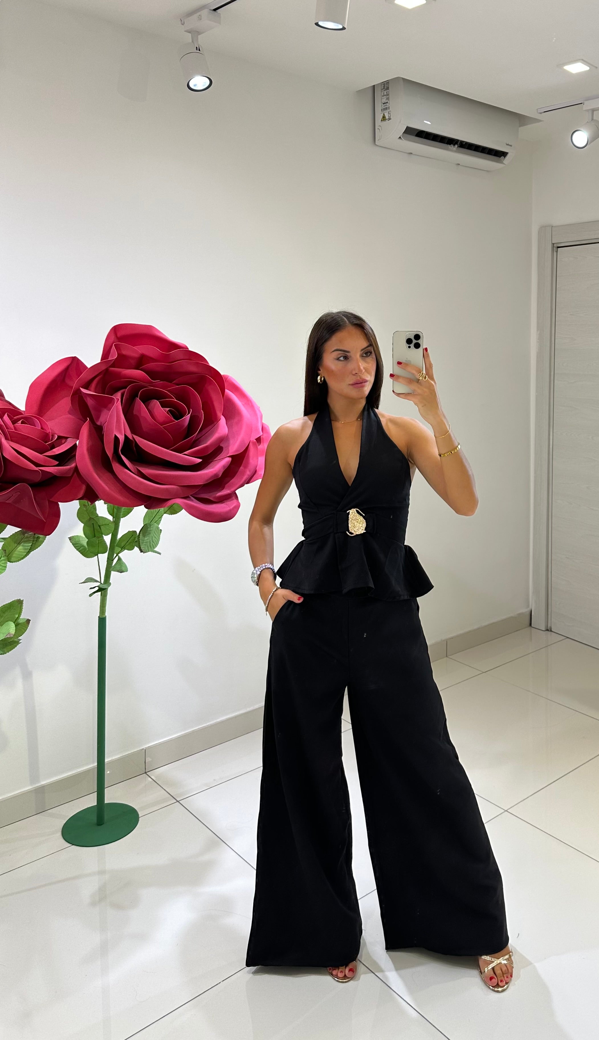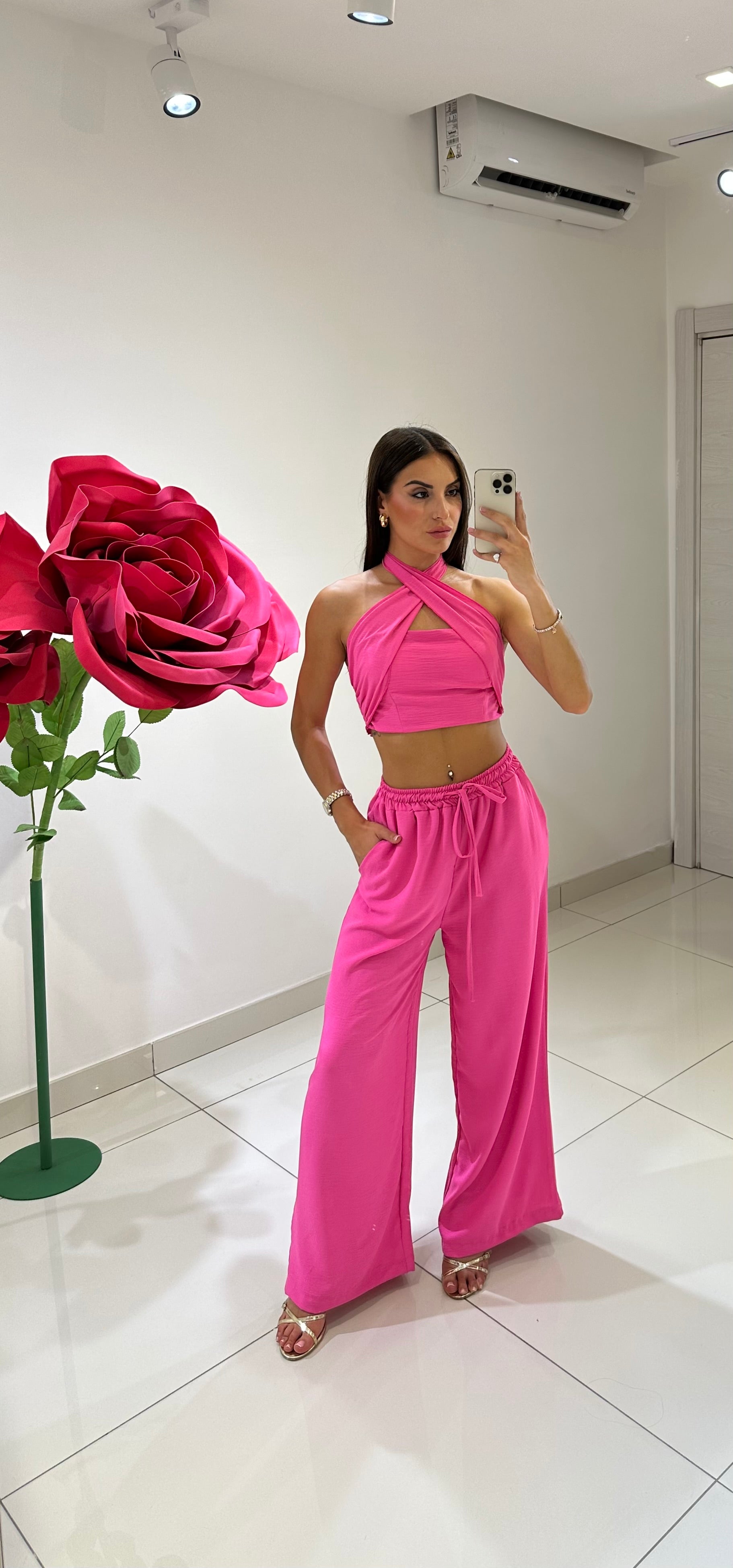 COORDSET CON TOP APERTURA REGOLABILE AVANTI CON COPPE E SCHIENA SCOPERTA, PANTALONE PALAZZO VITA ALTA CON ELASTICO. IN VARI COLORI