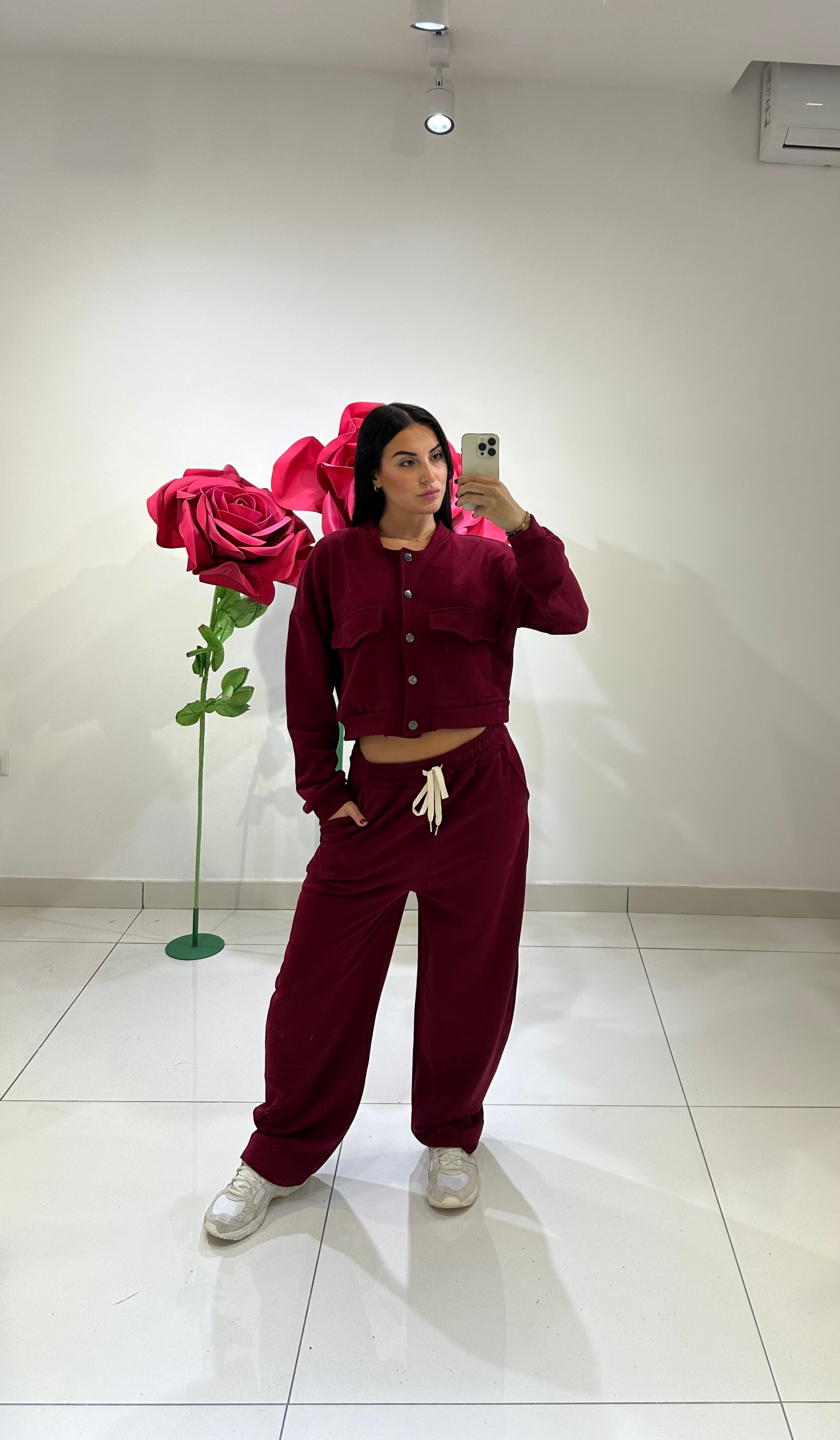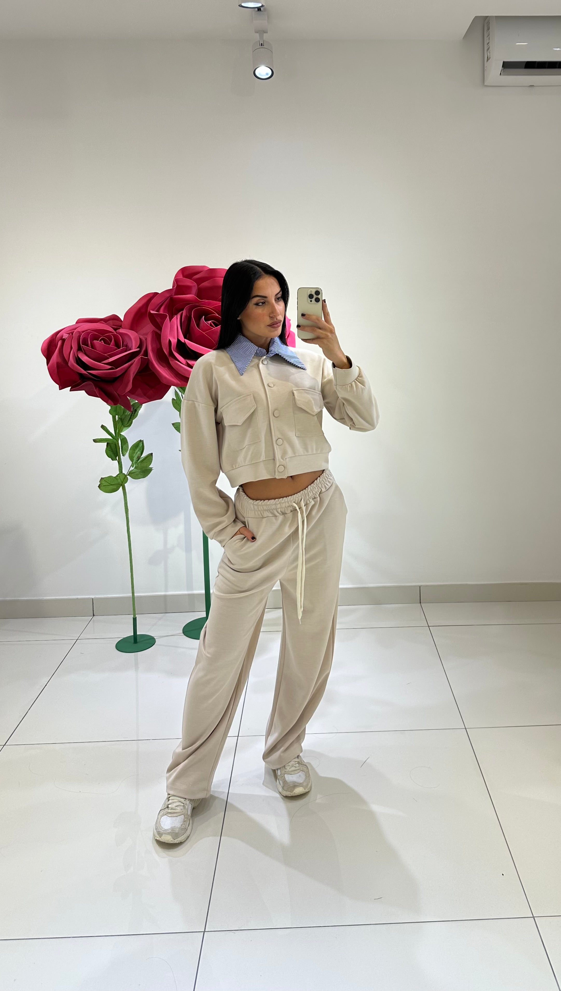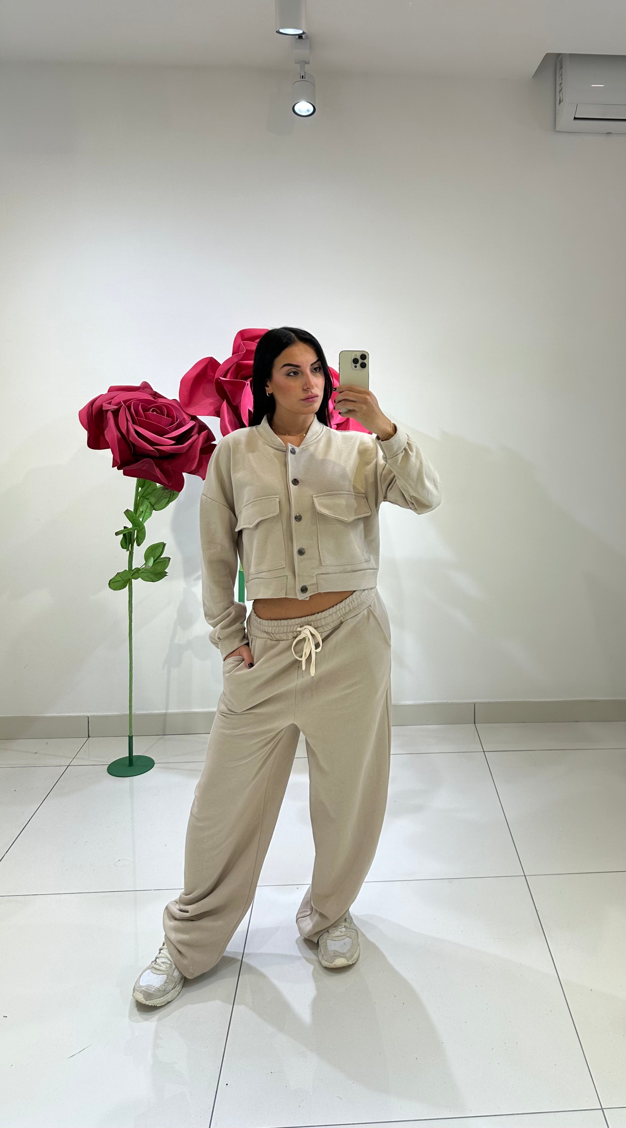 COORDSET CON JACKET CROP, COLLO EFFETTO CAMICIA, TASCHE LATERALI. PANTALONE DI TUTA GAMBA DRITTA, CON ELASTICO IN VITA E TASCHE. IN VARI COLORI