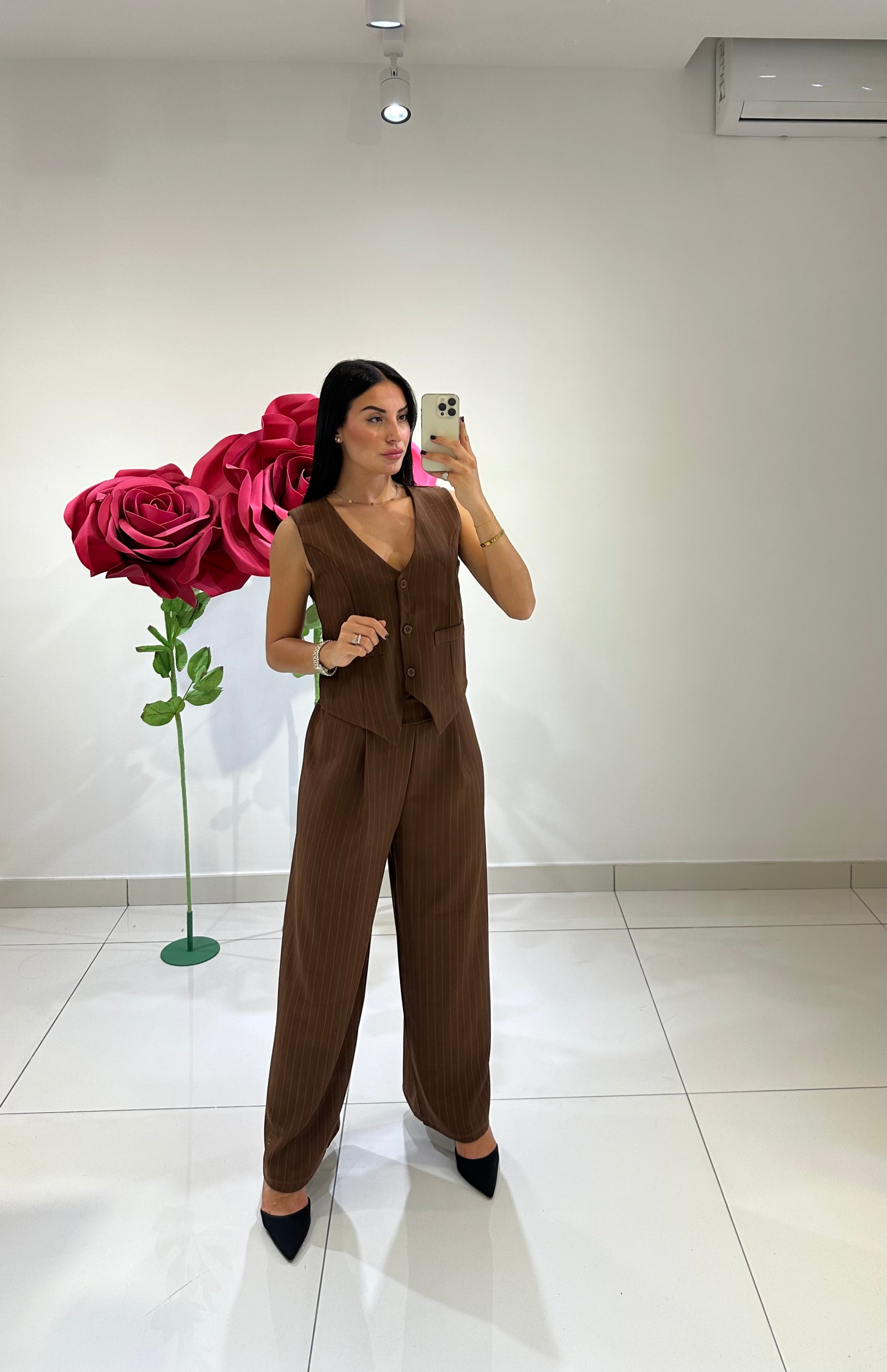 COORDSET GESSATO COMPOSTO DA GILLET CON TASCHE FINTE SUI LATI, PANTALONE GAMBA DRITTA, VITA ALTA CON ELASTICO SUL RETRO. IN VARI COLORI