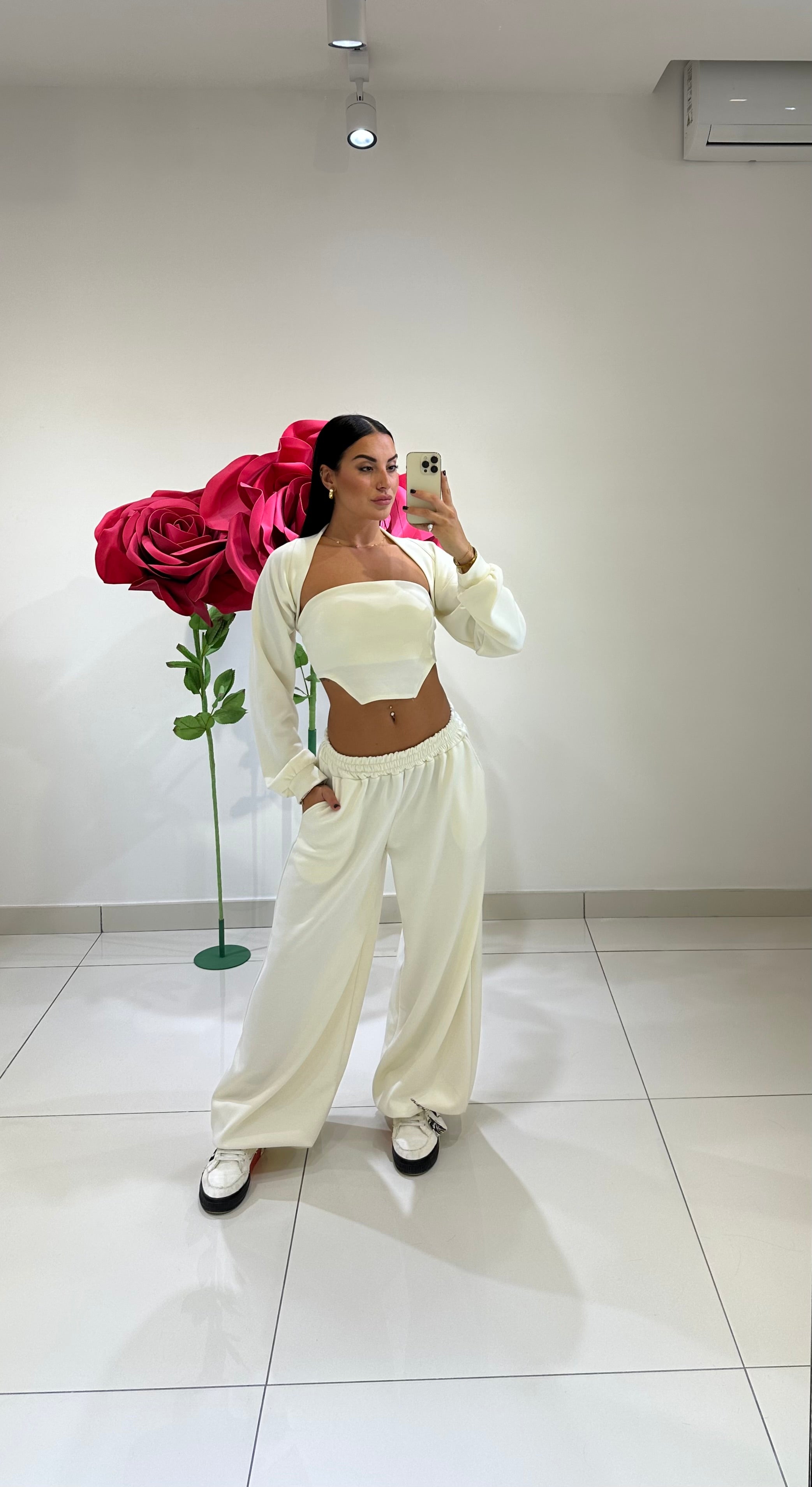 COORDSET COMPOSTO DA FELPA CROP EFFETRO BUSTIER, SPALLINE IMBOTTITE, APERTURA SUL RETRO DETTAGLIATA DA STRINGHE. PANTALONE A ZAMPA, VITA BASSA CON RISVOLTO. IN VARI COLORI