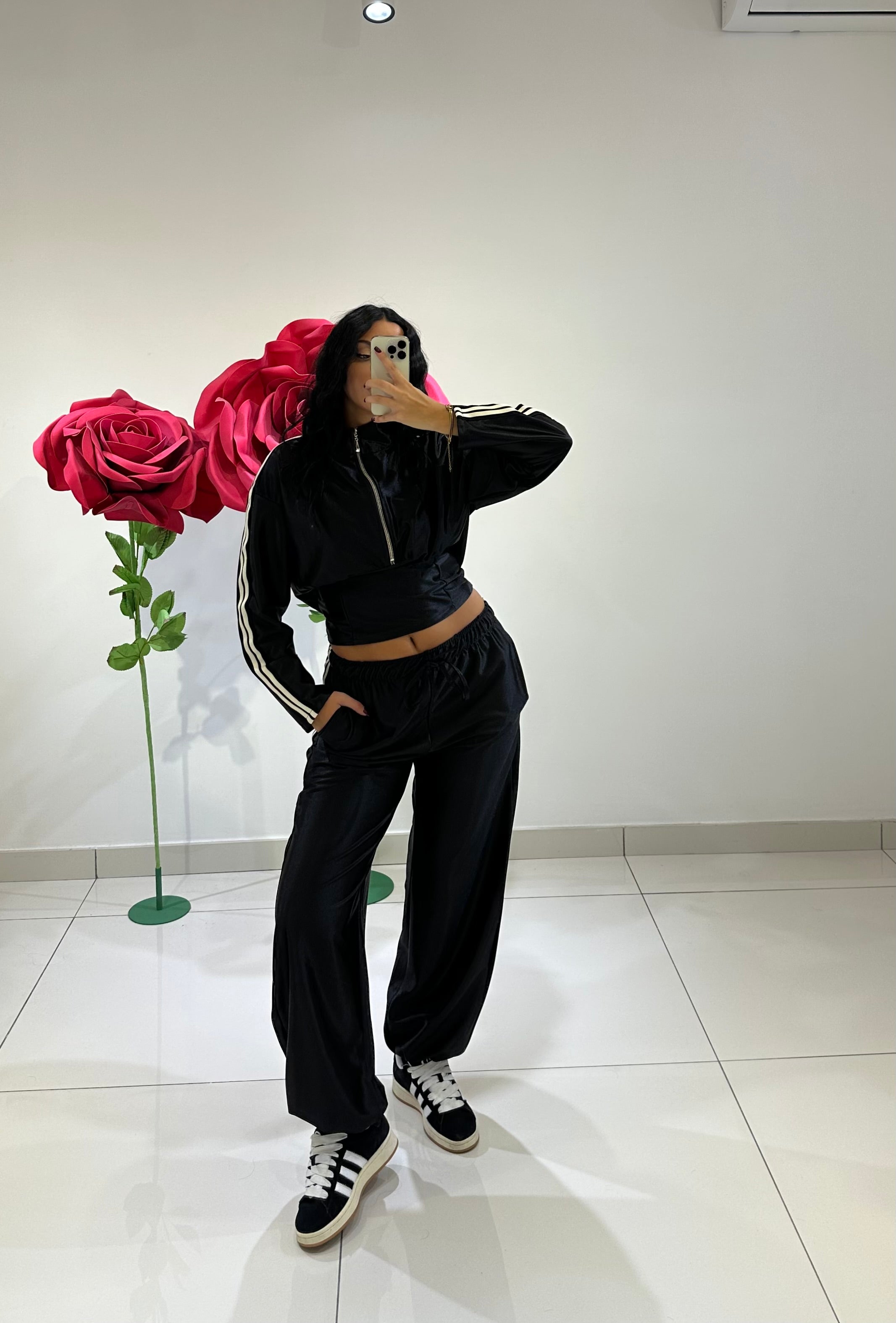 COORDSET SATINATO, VESTIBILITÀ OVER, ZIP CENTRALE, STRINGHE SUL RETRO, PANTALONE CON ELASTICO IN VITA E SULLA CAVIGLIA. VARI COLORI.