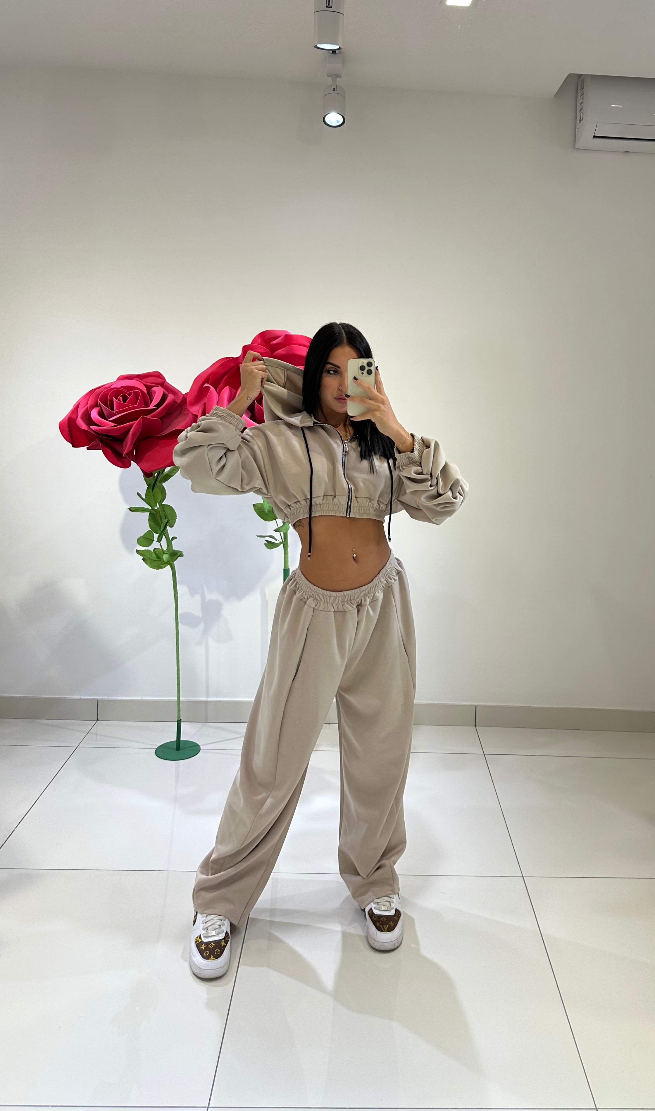 COORDINATO COMPOSTO DA FELPA CROP OVER CON ELASTICO UN VITA E AI POLSINI ,ZIP CENTRALE E TASCHINI LATERALI, PANTALONE CON ELASTICO IN VITA E GAMBA DRITTA....
