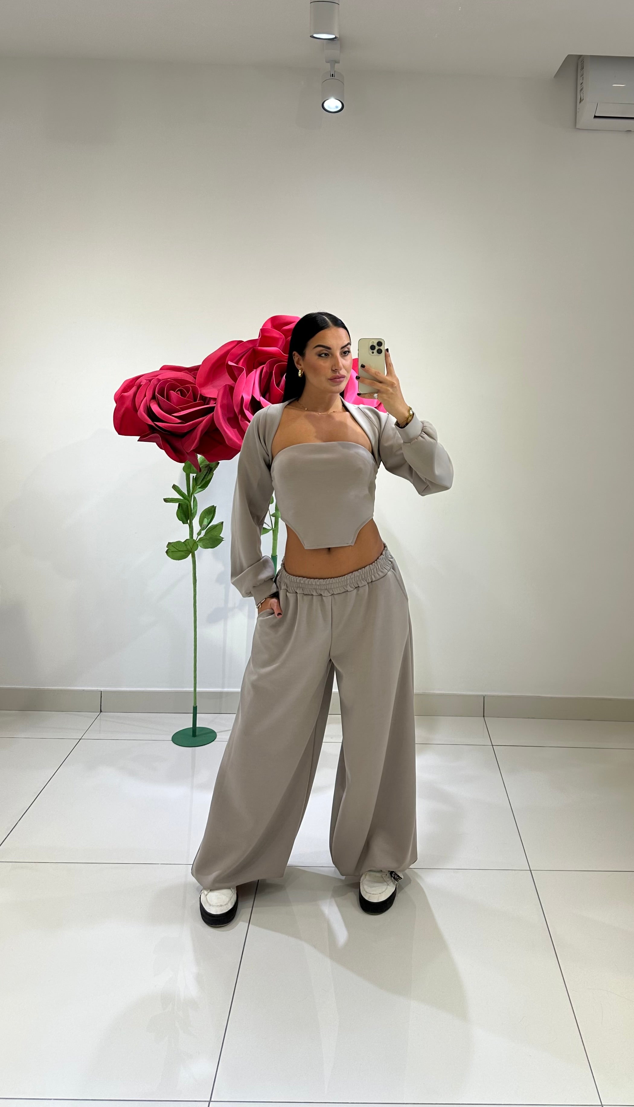 COORDSET COMPOSTO DA TOP CON AMPIO SCOLLO E FASCIA ELASTICA SUL RETRO, JACKET CROP E PARACUTE BALLON. IN VARI COLORI