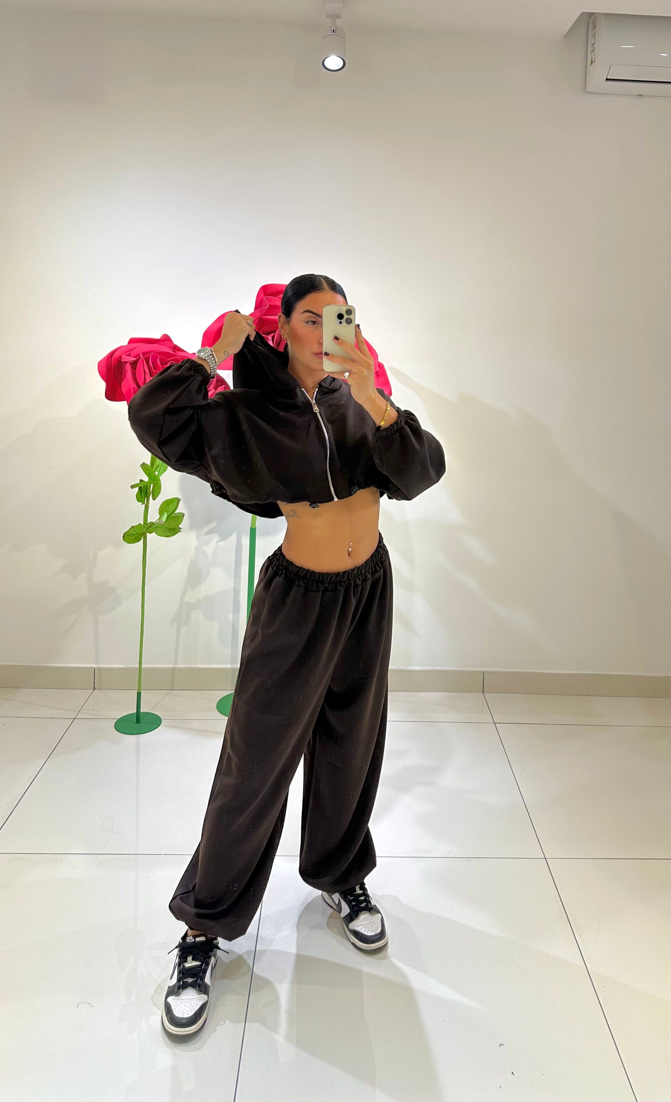 COORDSET DI TUTA CON FELPA CROP CON CAPPUCCIO E CULISSE REGOLABILE SUI FIANCHI. PANTA TUTA OVER. IN VARI COLORI
