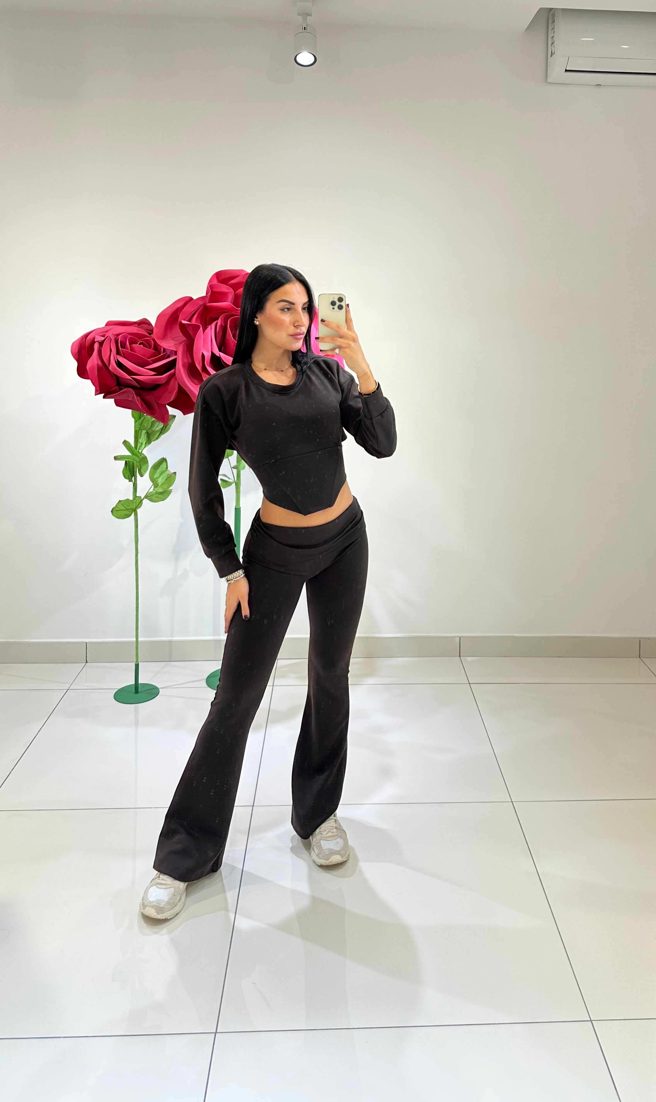 COORDSET COMPOSTO DA FELPA CROP EFFETRO BUSTIER, SPALLINE IMBOTTITE, APERTURA SUL RETRO DETTAGLIATA DA STRINGHE. PANTALONE A ZAMPA, VITA BASSA CON RISVOLTO. IN VARI COLORI