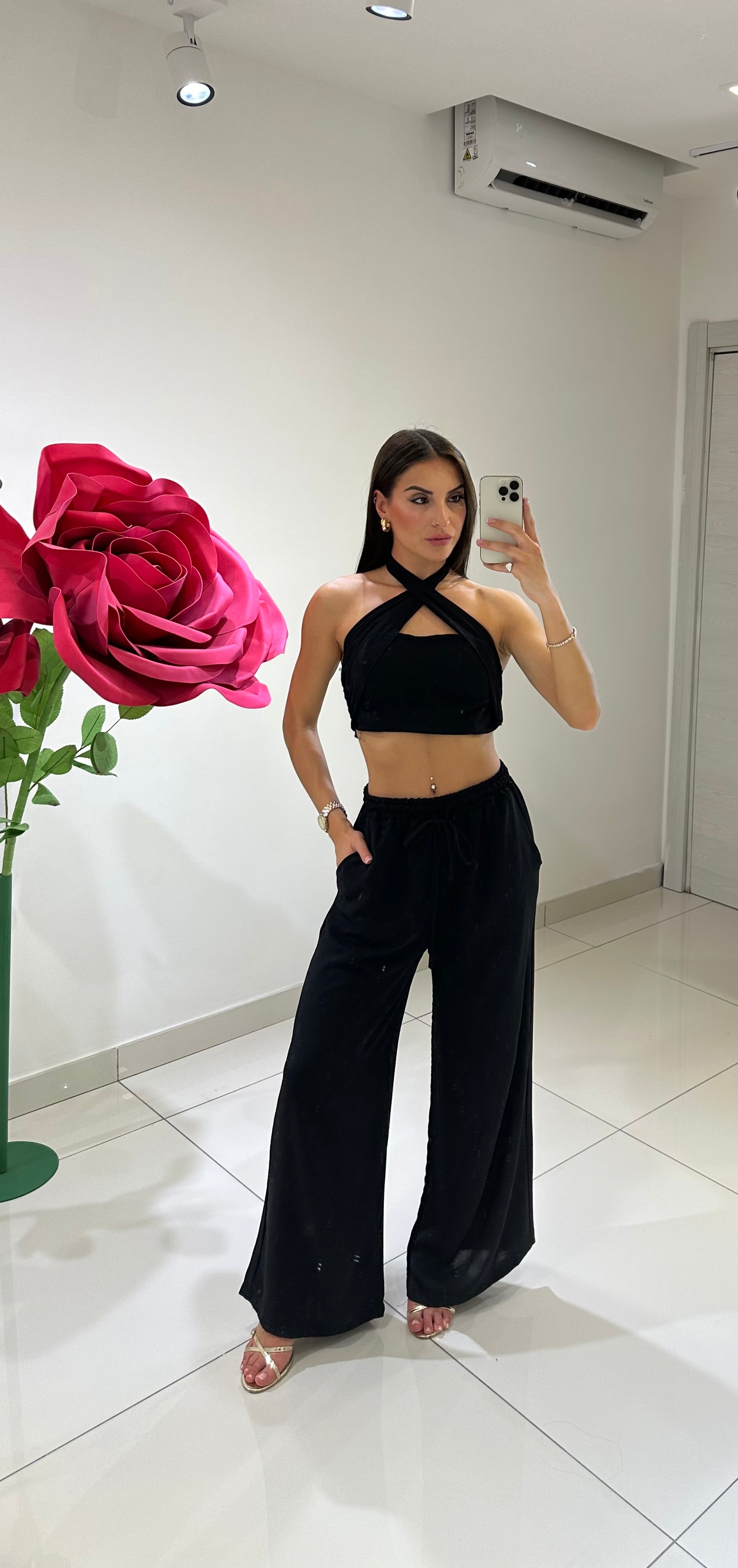 COORDSET IN SIMIL LINO, CORSETTO CON COPPE INCLUSE E FASCE CHE SI LEGANO DIETRO AL COLLO, PANTALONE PALAZZO VITA ALTA ELASTICA, IN VARI COLORI