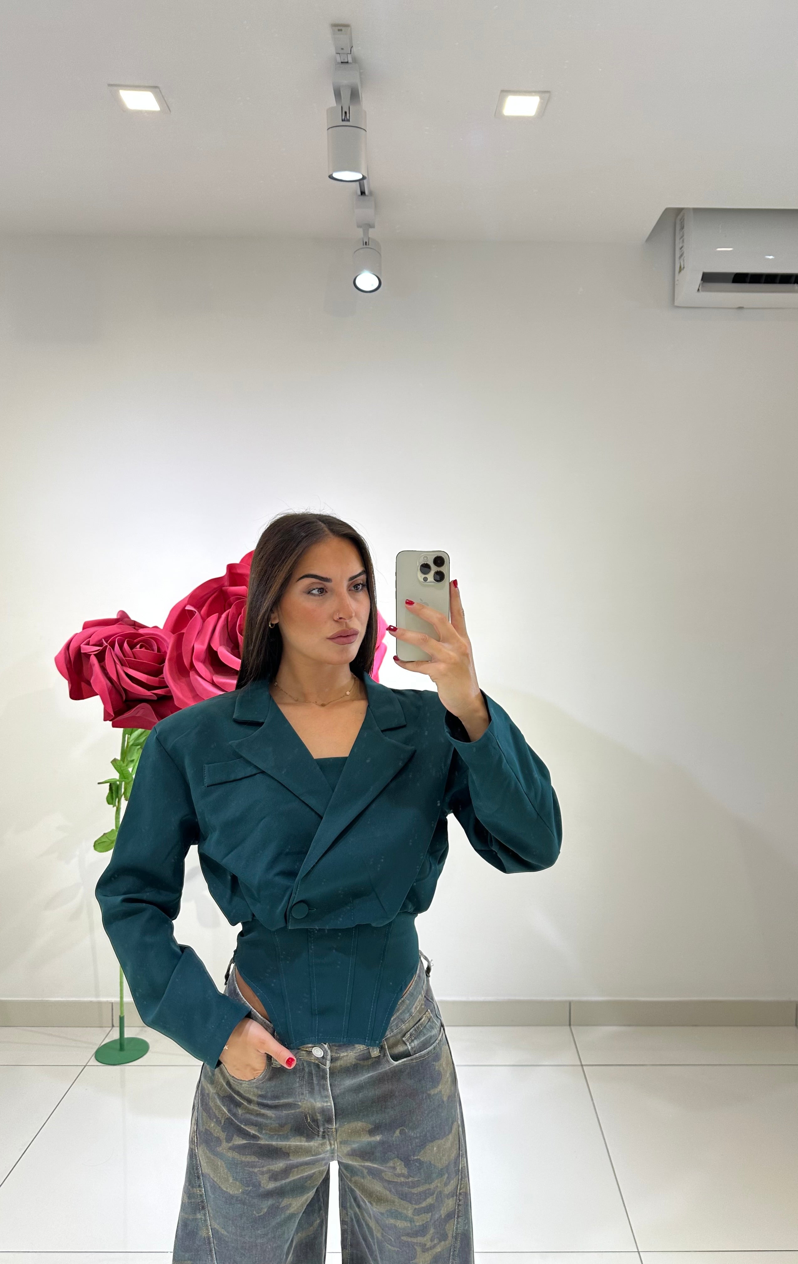 CORSETTO CON STRINGHE SUL RETRO, JACKET CROP CON ELASTICO IN VITA, FODERATO ALL’INTERNO E SPALLINE IMBOTTITE. IN VARI COLORI
