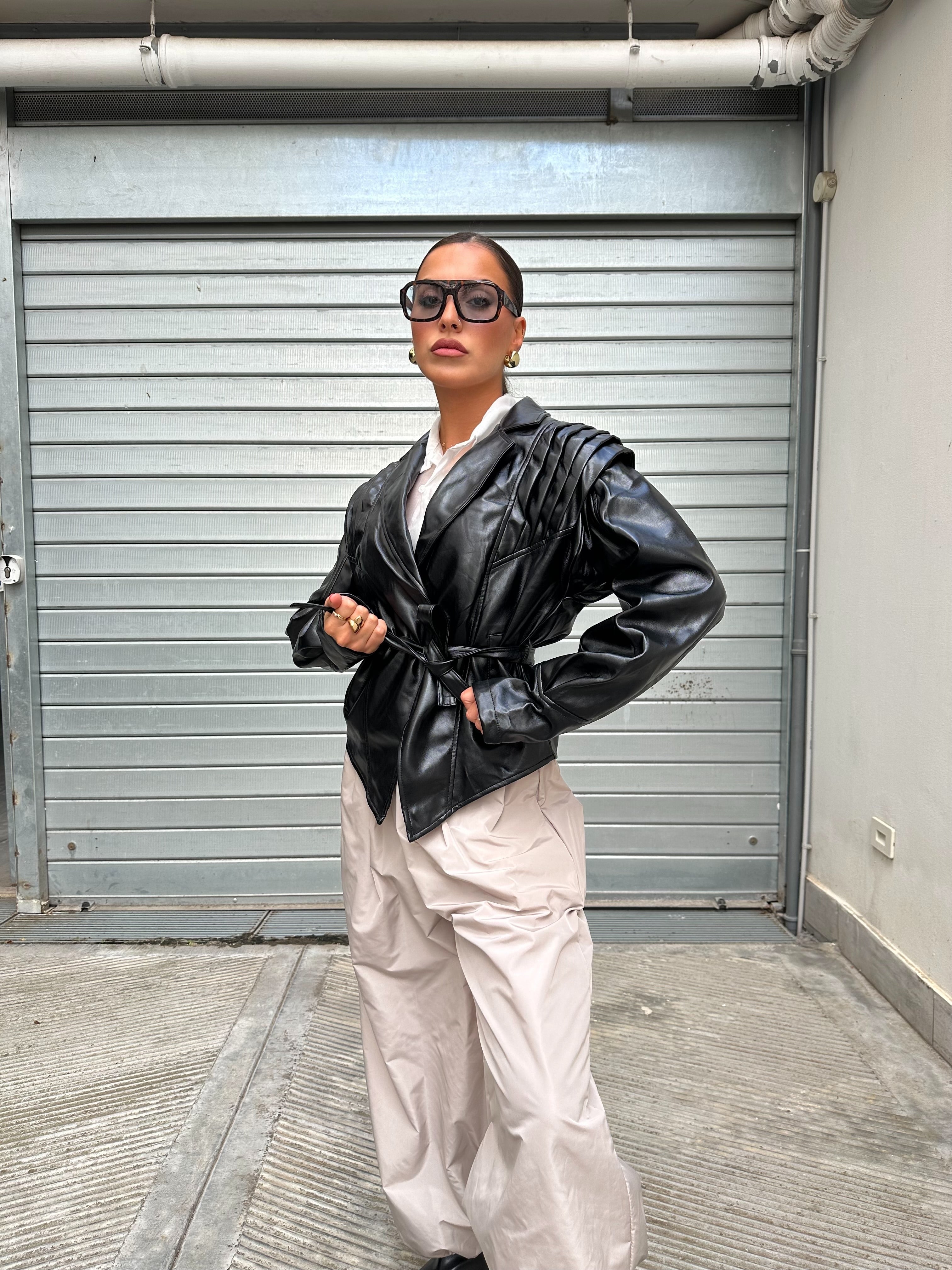 JACKET IN ECO-PELLE FODERATO ALL’INTERNO, CON PIEGHE SULLE SPALLINE, AVVITATA CON UN SOLO BOTTONE, CINTURA INCLUSA. IN VARI COLORI
