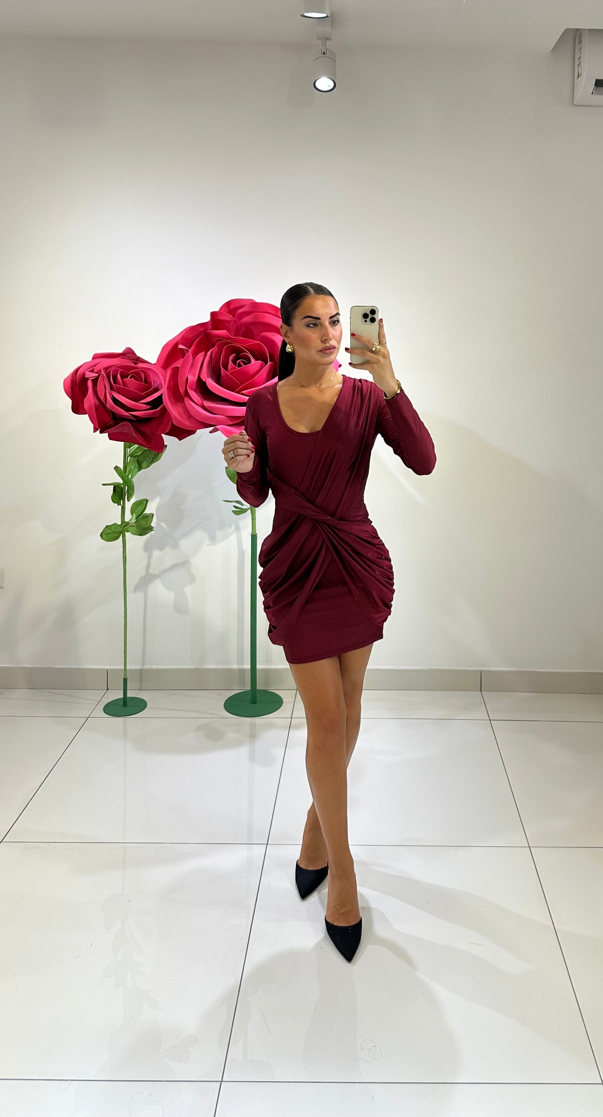 DRESS CON SCOLLO TRASVERSALE DRAPPEGGIATO, MANICA LUNGA MEZZO GUANTO. IN VARI COLORI
