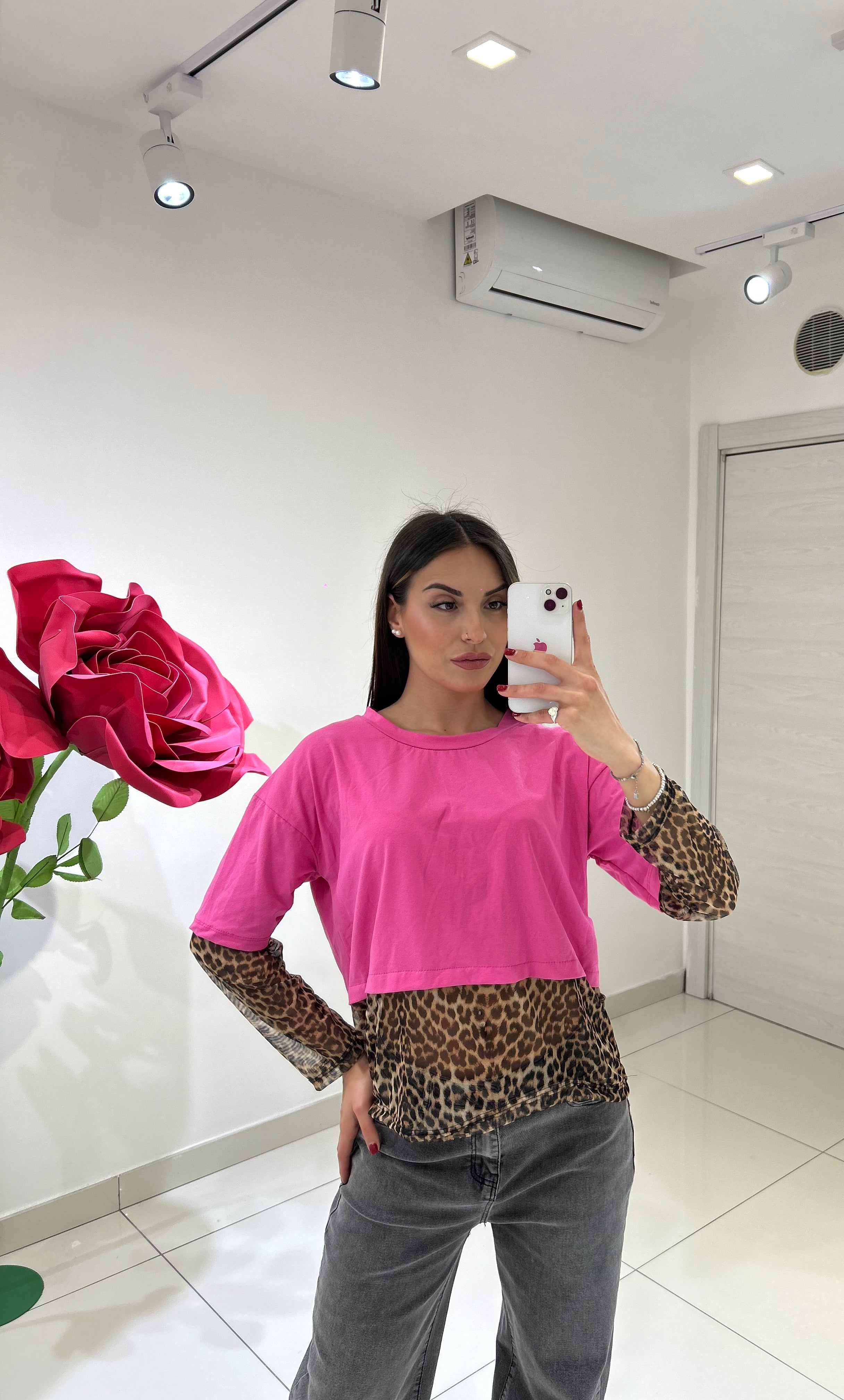 MAGLIA CON TULLE ANIMALIER E MANICHE CON DETTAGLIO TULLE ANIMALIER, TAGLIA UNICA