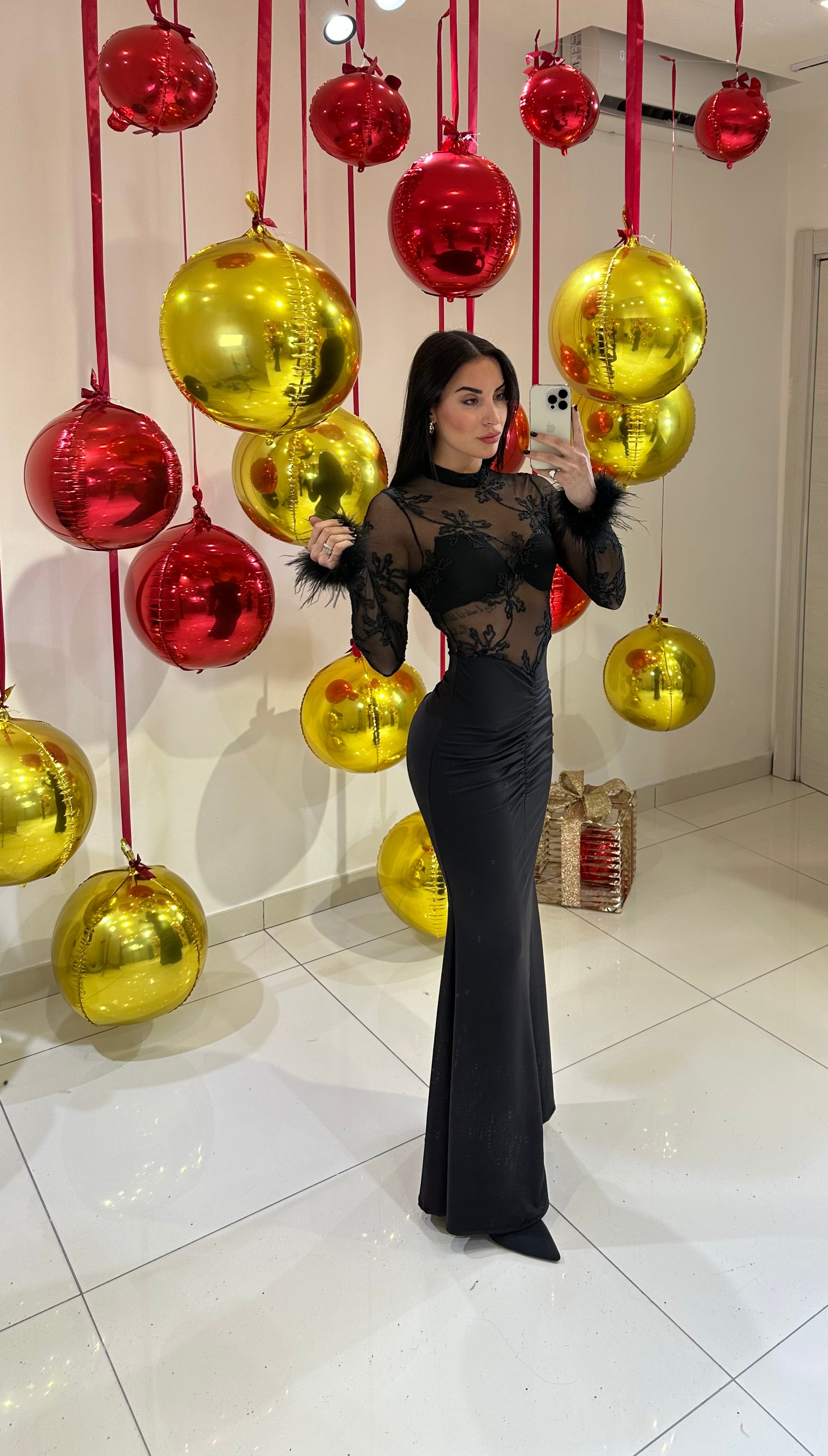 ABITO LUNGO IN LYCRA, FULL STRASS, MANICA LUNGA AMPI AL FONDO, APERTURE CON DAVANTI E SUL RETRO, AMPIO SPACCO LATERALE DETTAGLIO DA VOLANT.
