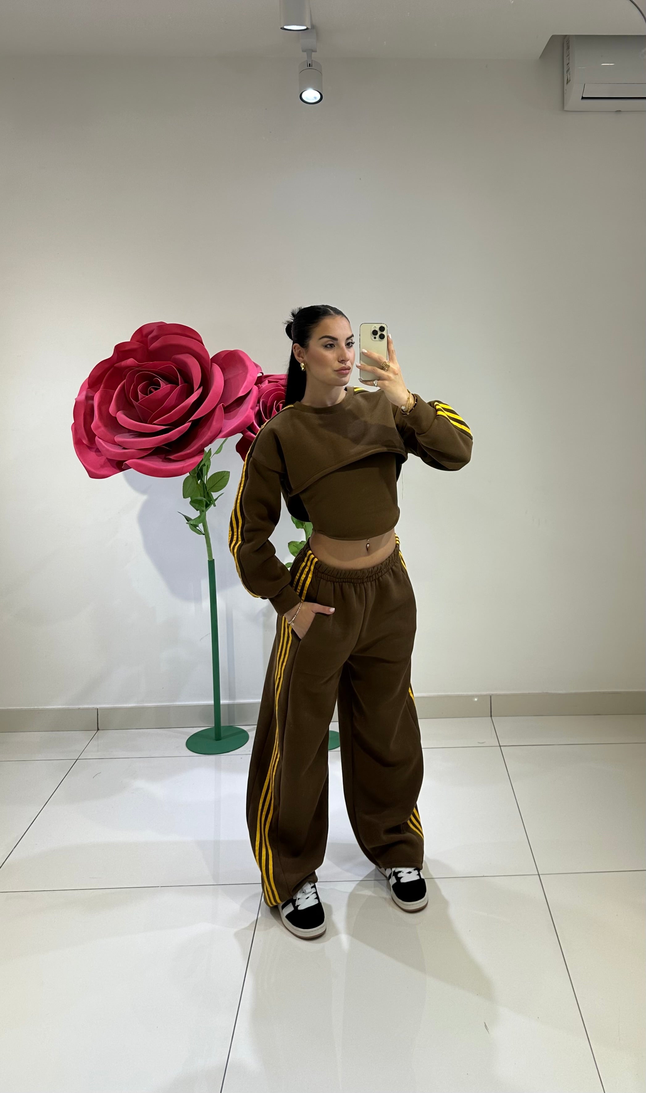 SET COMPOSTO DA TOP CON SPALLINA LARGA, FELPA CORTA AVANTI E LUNGA DIETRO CON FASCE LATERALI IN CONTRASTO DI COLORE CHE VENGONO RICHIAMATE ANCHE AI LATI DEL...
