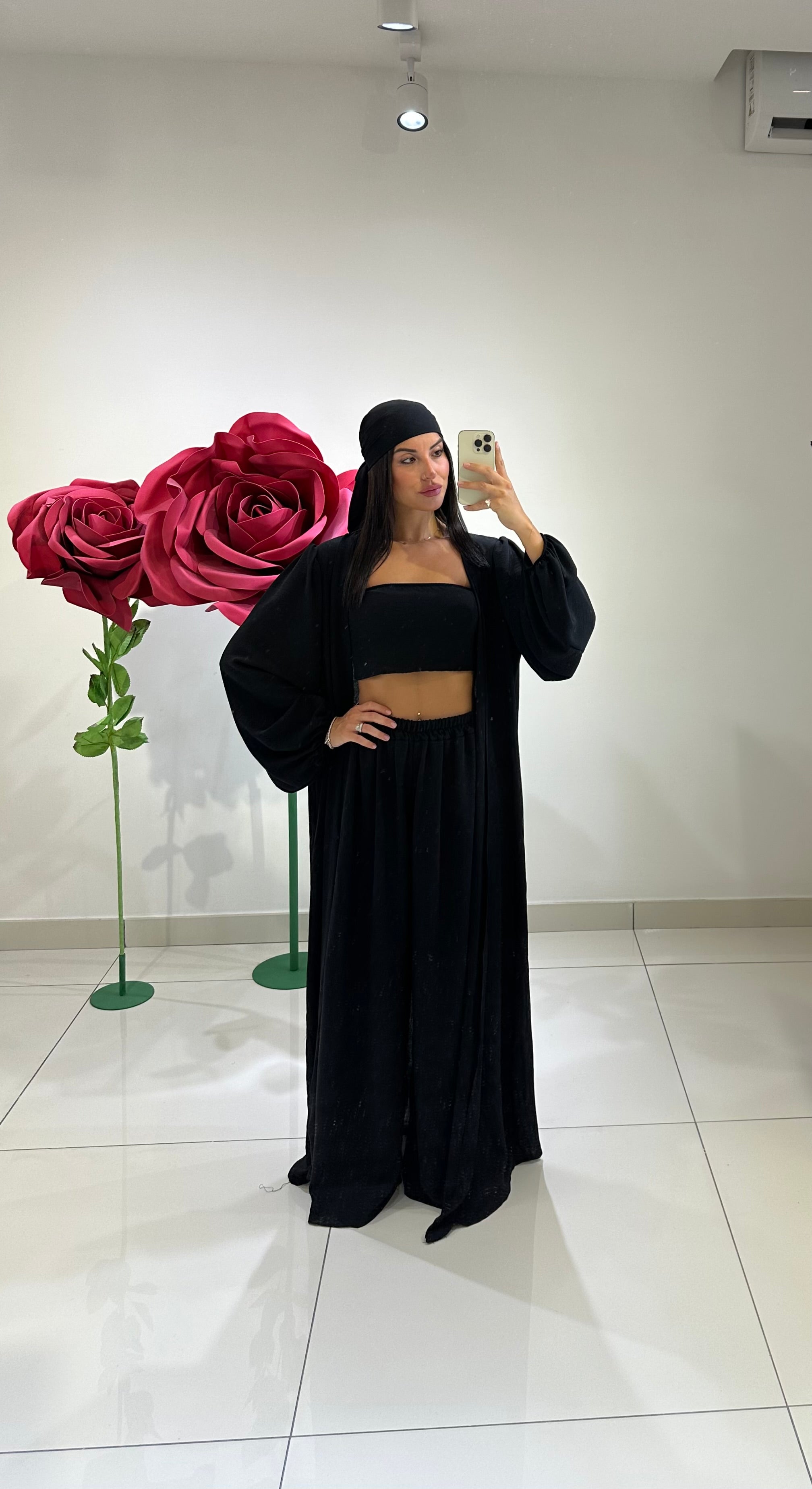LINEN-LIKE SET: BANDEAU TOP, WIDE-LEG TROUSERS, LONG PUFF-SLEEVED CARDIGAN, BANDANA. IN VARIOUS COLORS
