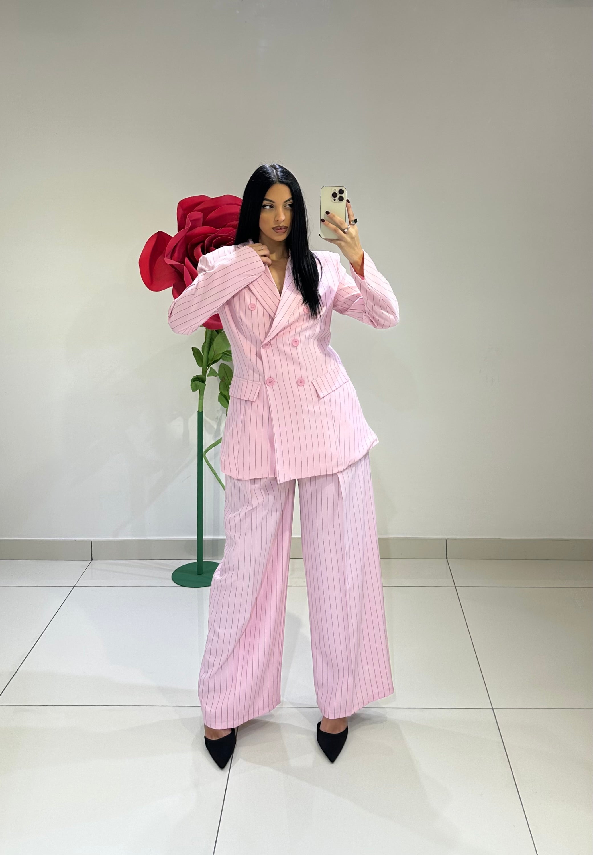 TAILLEUR GESSATO VESTIBILITÀ OVER, BLAZER DOPPIO PETTO CON SPALLINE IMBOTTITE, FODERATO ALL’INTERNO. PANTALONE GAMBA LARGA CON ELASTICO SUL RETRO E TASCHE. IN VARI COLORI