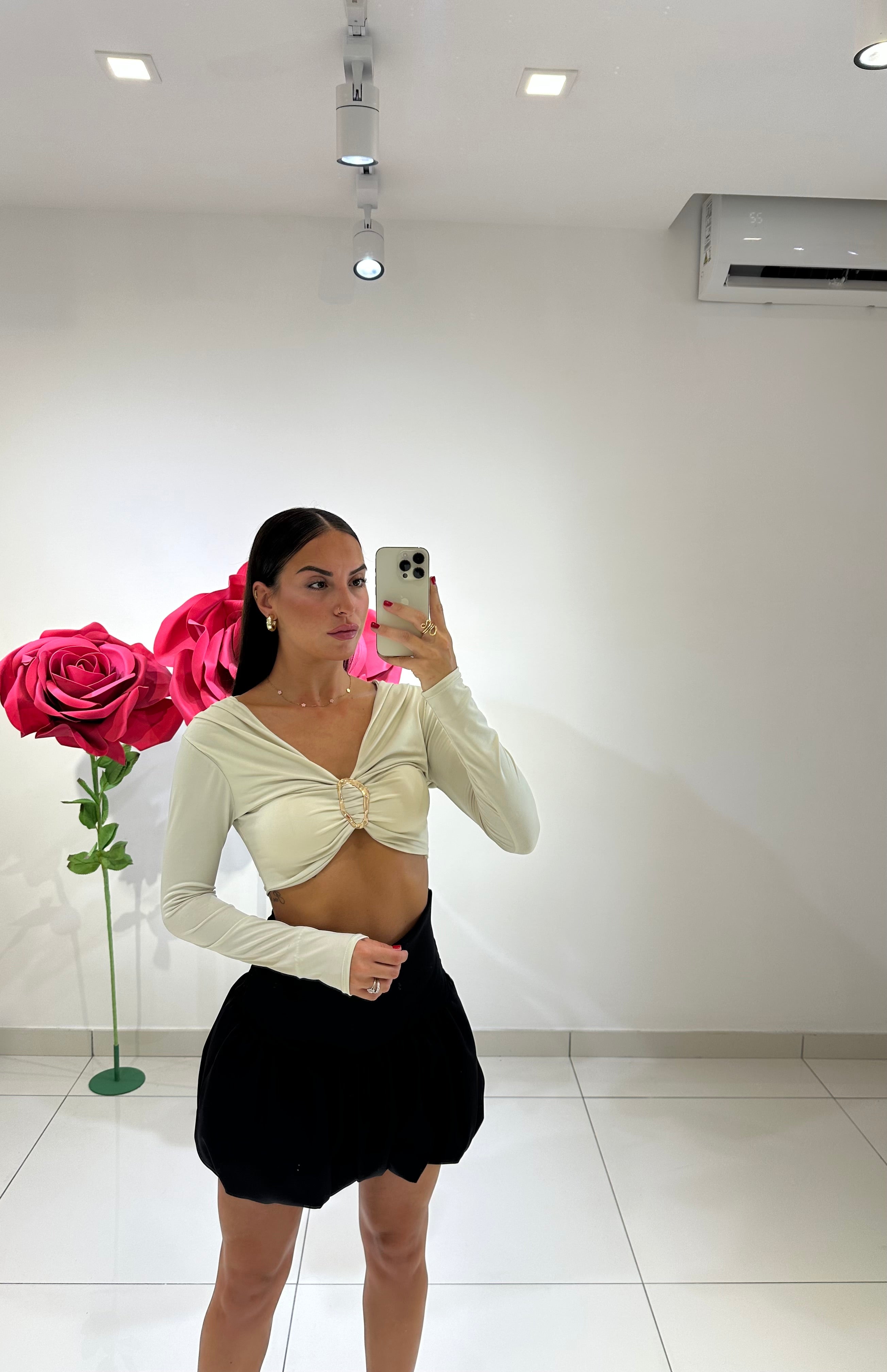Crop top, cups included, and central gold detail. Available in various colors.