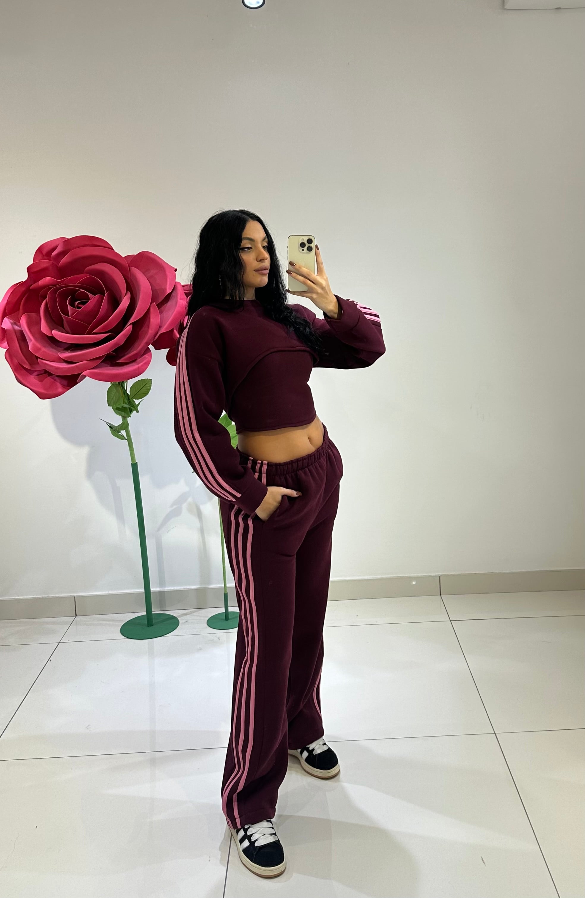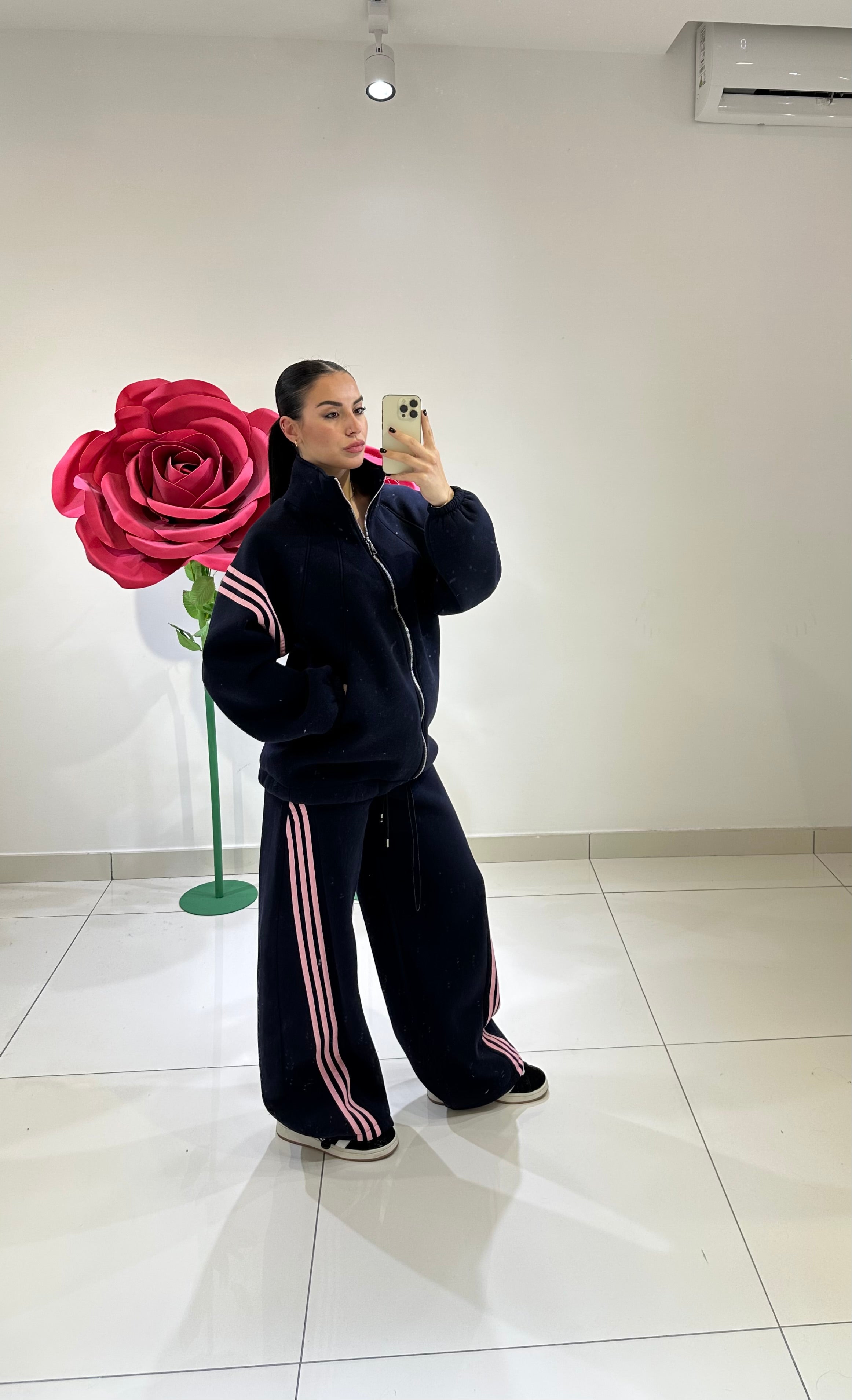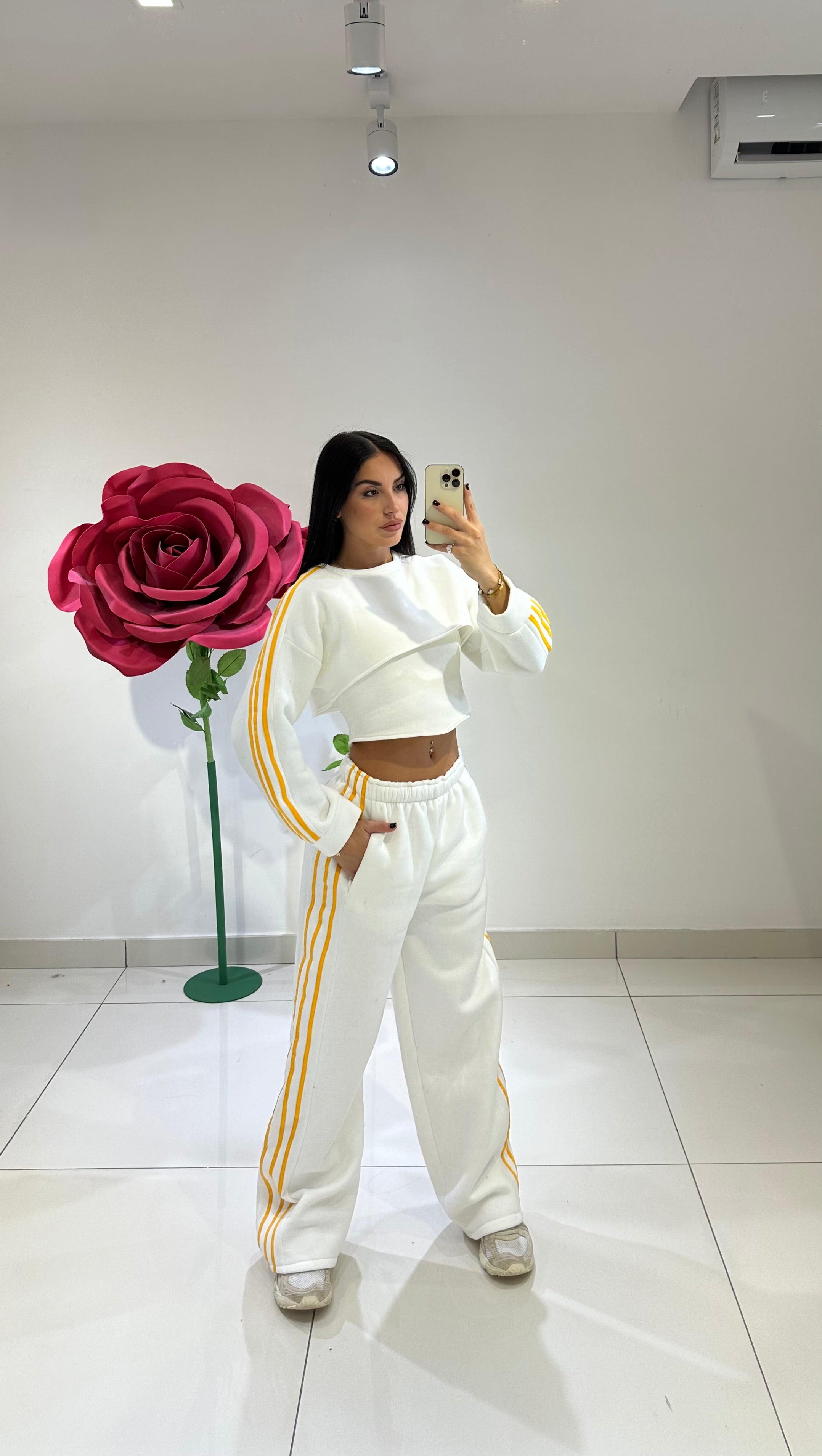 Coordset sportivo composto da felpa con zip corta e pantaloni a gamba larga coordinati.Il set presenta bande laterali a contrasto di colore che donano un tocco...