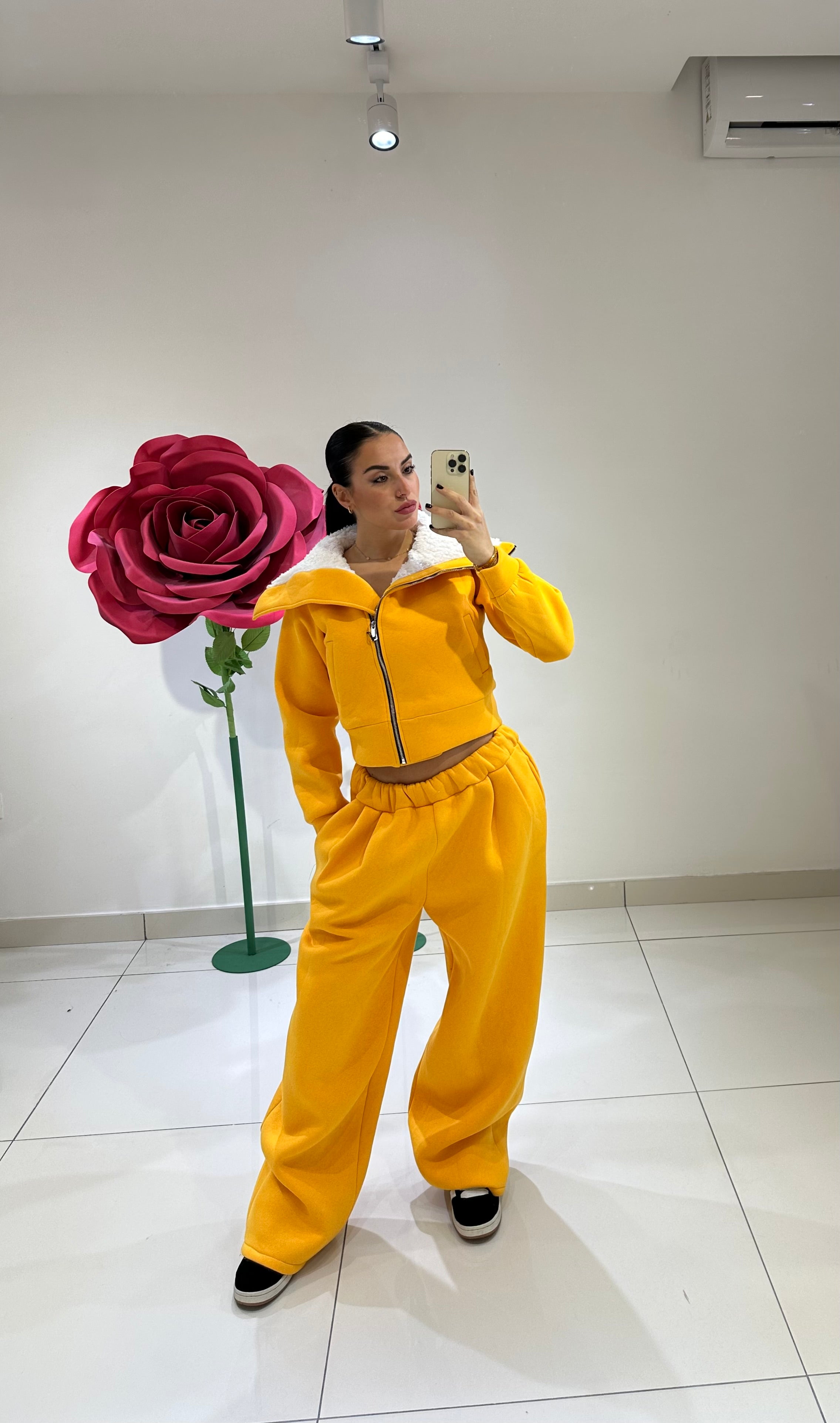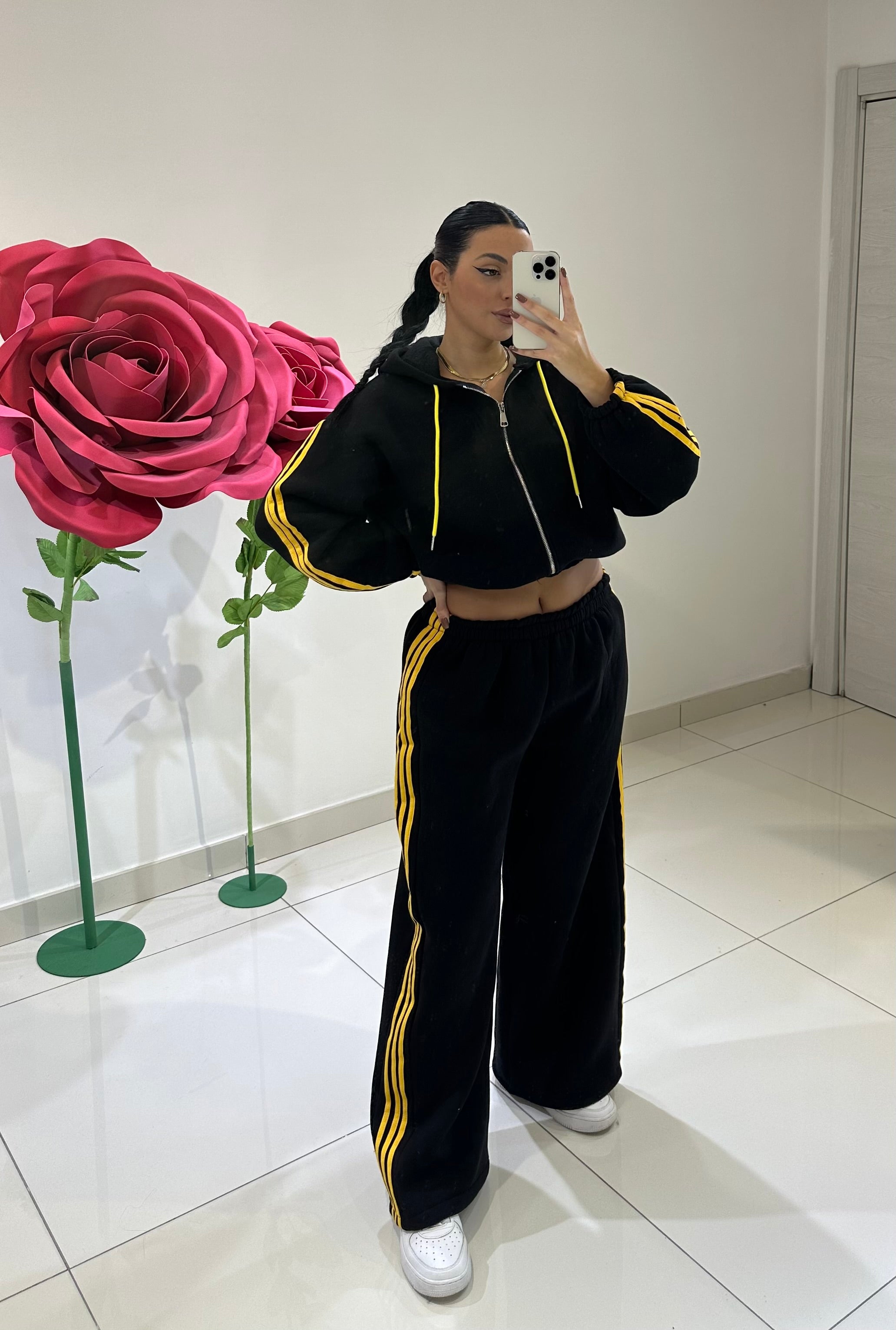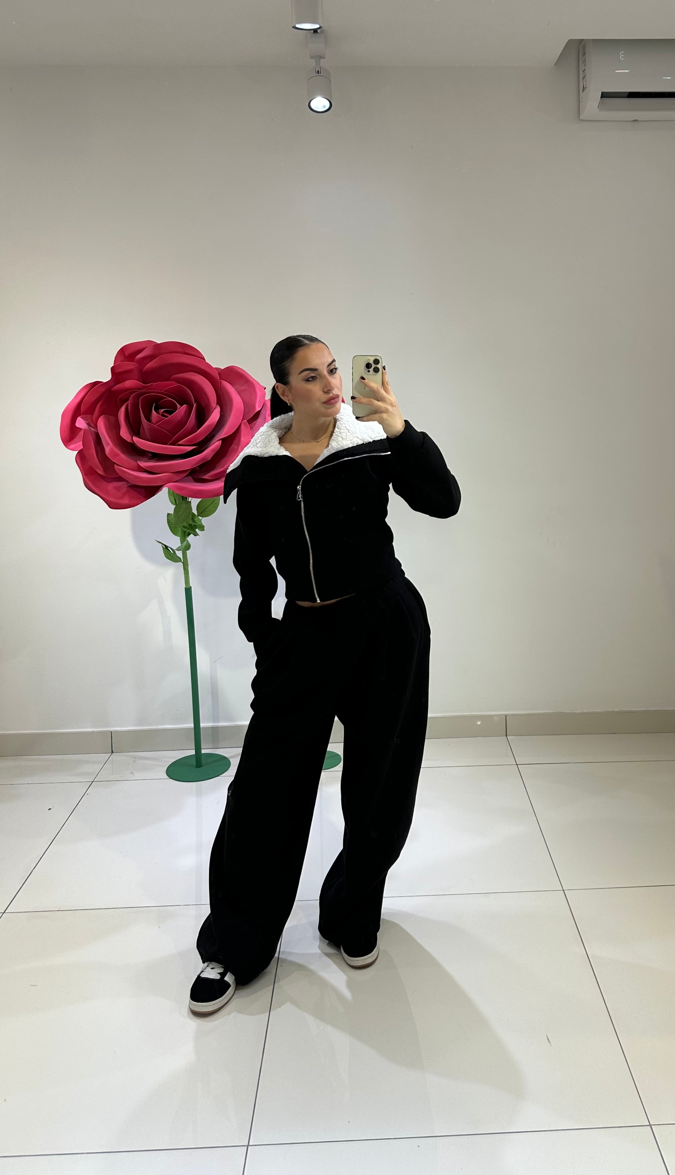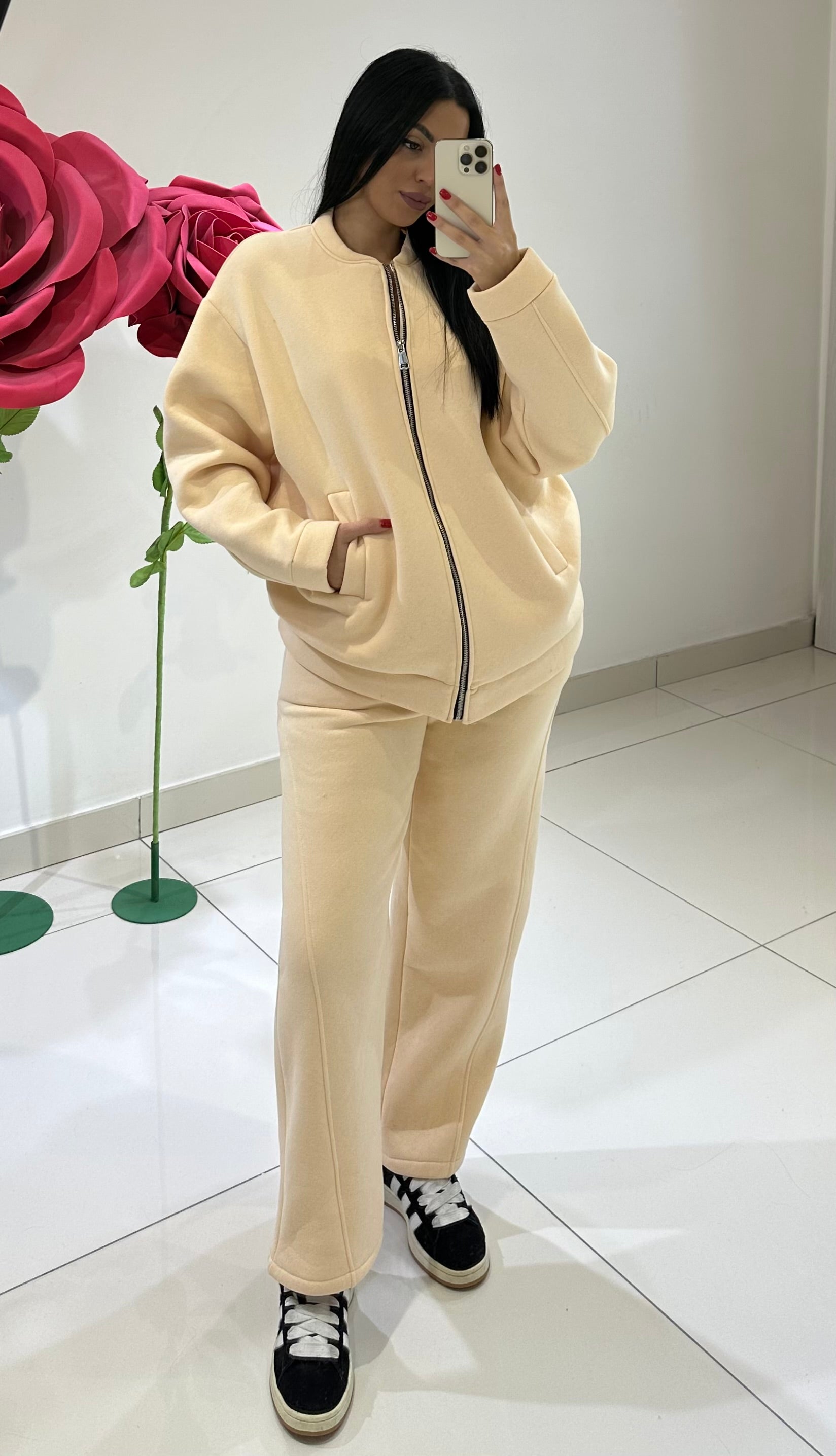 COORDINATO COMPOSTO DA FELPA CROP OVER CON ELASTICO UN VITA E AI POLSINI ,ZIP CENTRALE E TASCHINI LATERALI, PANTALONE CON ELASTICO IN VITA E GAMBA DRITTA....