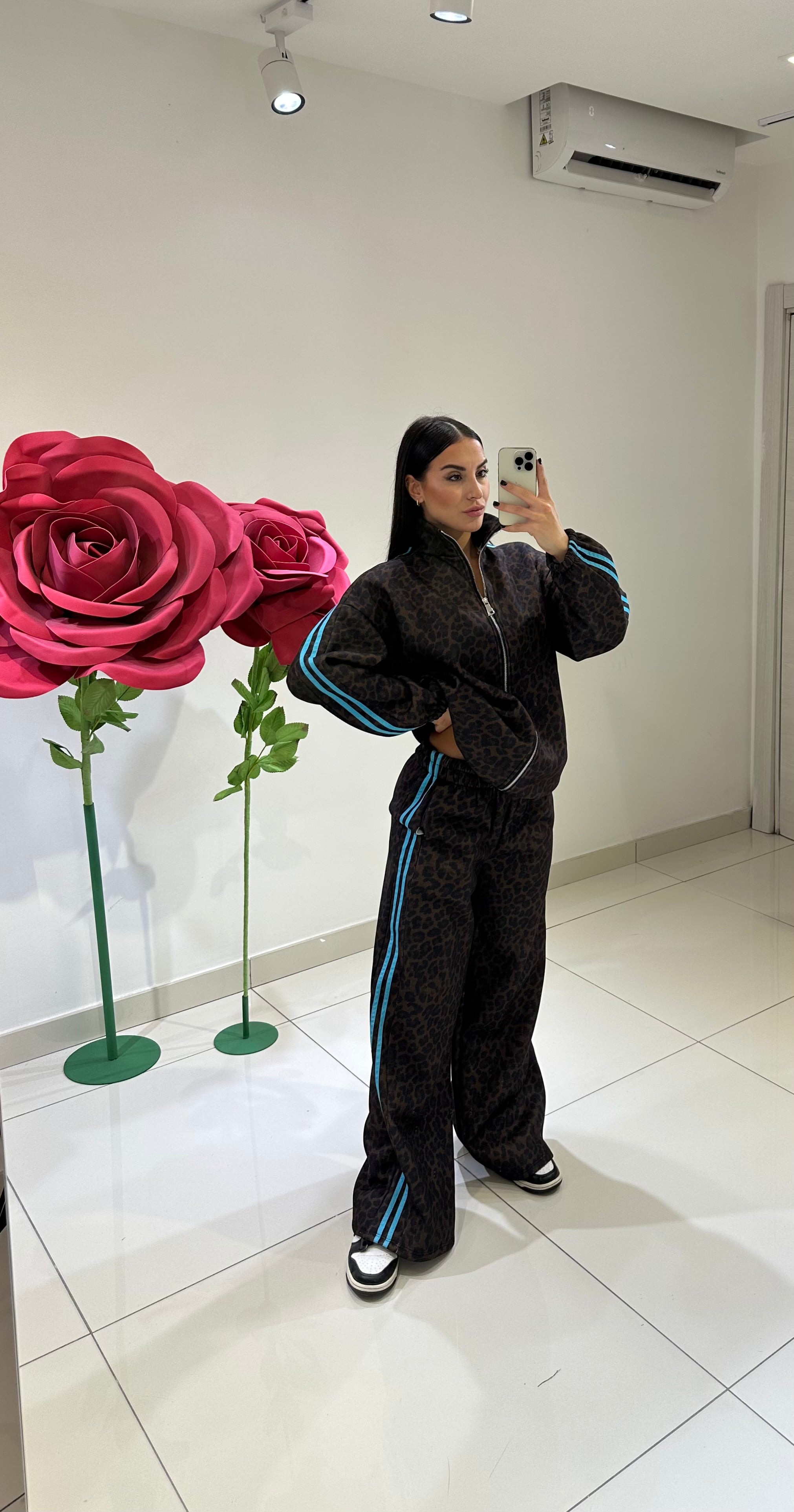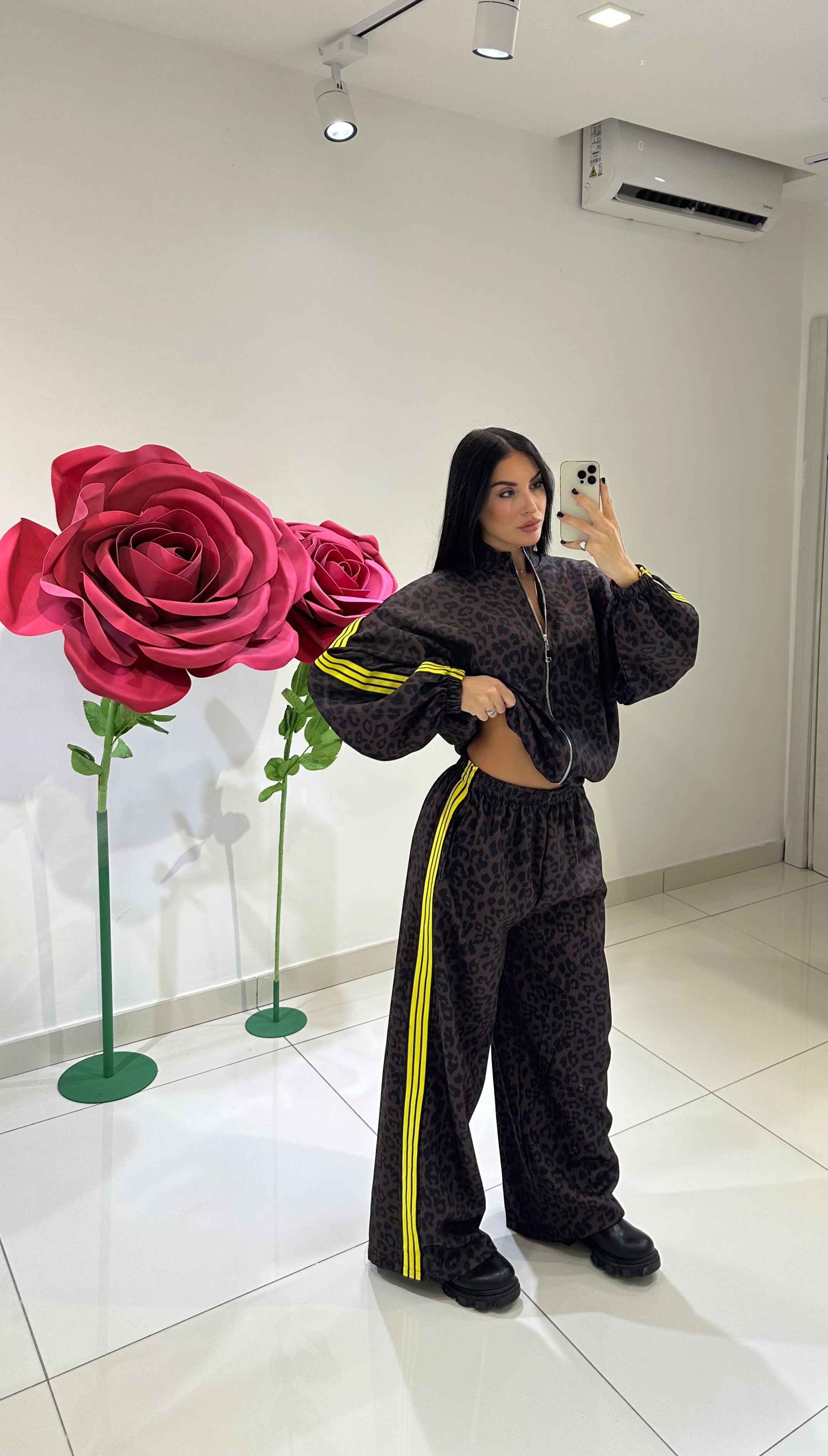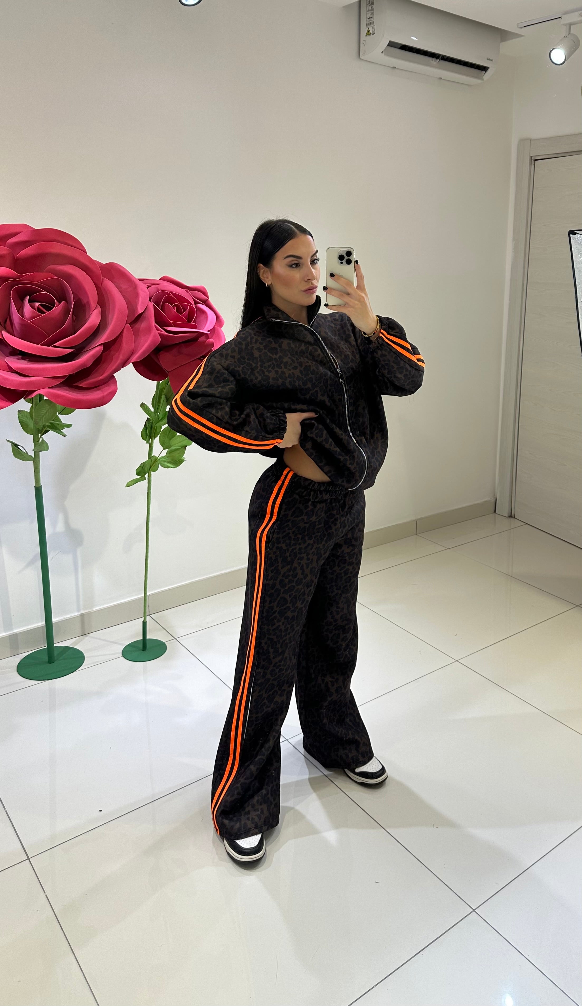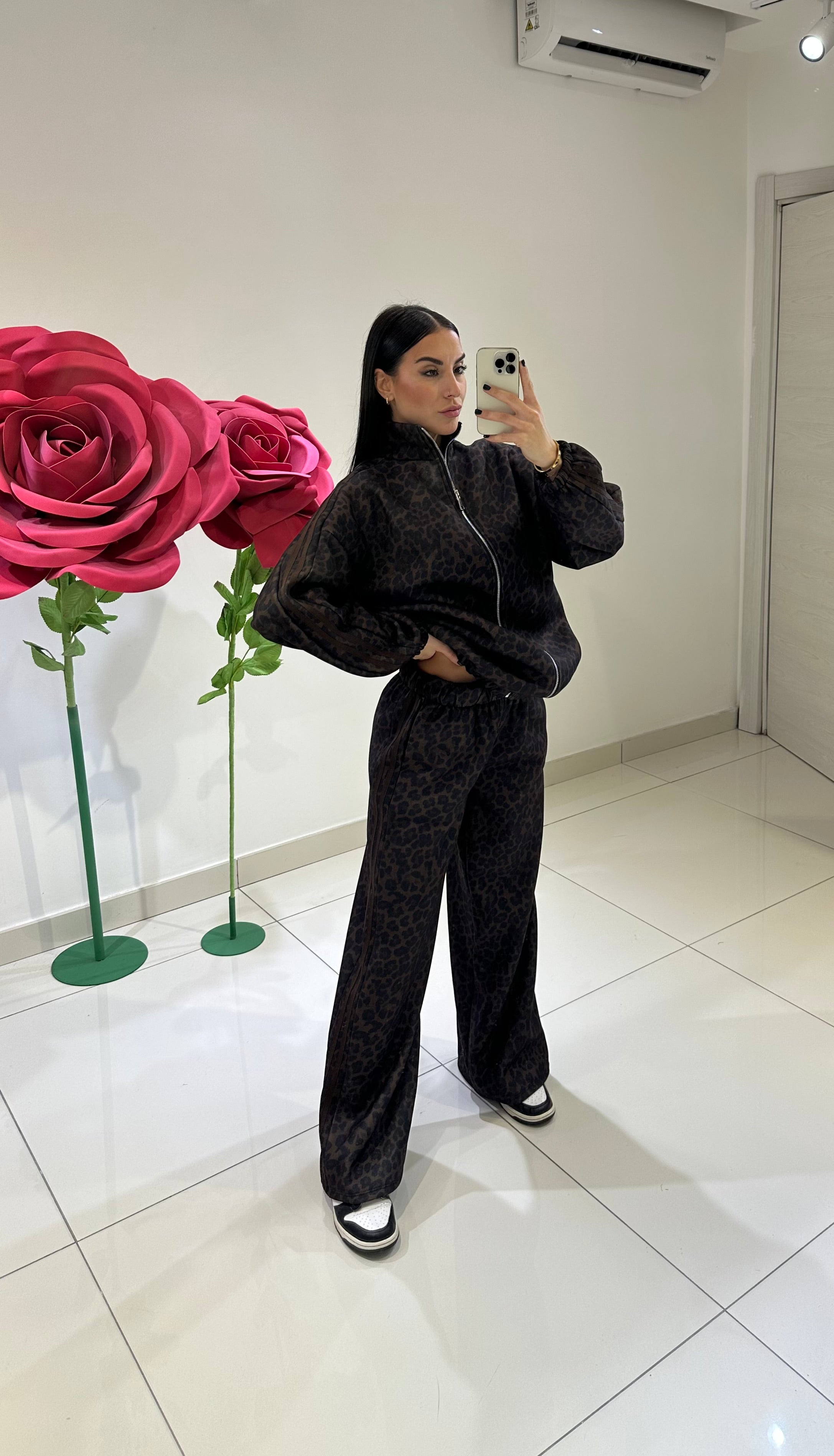 COORDSET ANIMALIER COMPOSTO DA FELPA ZIP, CON BANDE LATERALI IN CONTRASTO DI COLORE CHE VENGONI RICHIAMATE ANCHE AI LATI DEL PANTALONE PALAZZO, VITA ALTA CON ELASTICO....