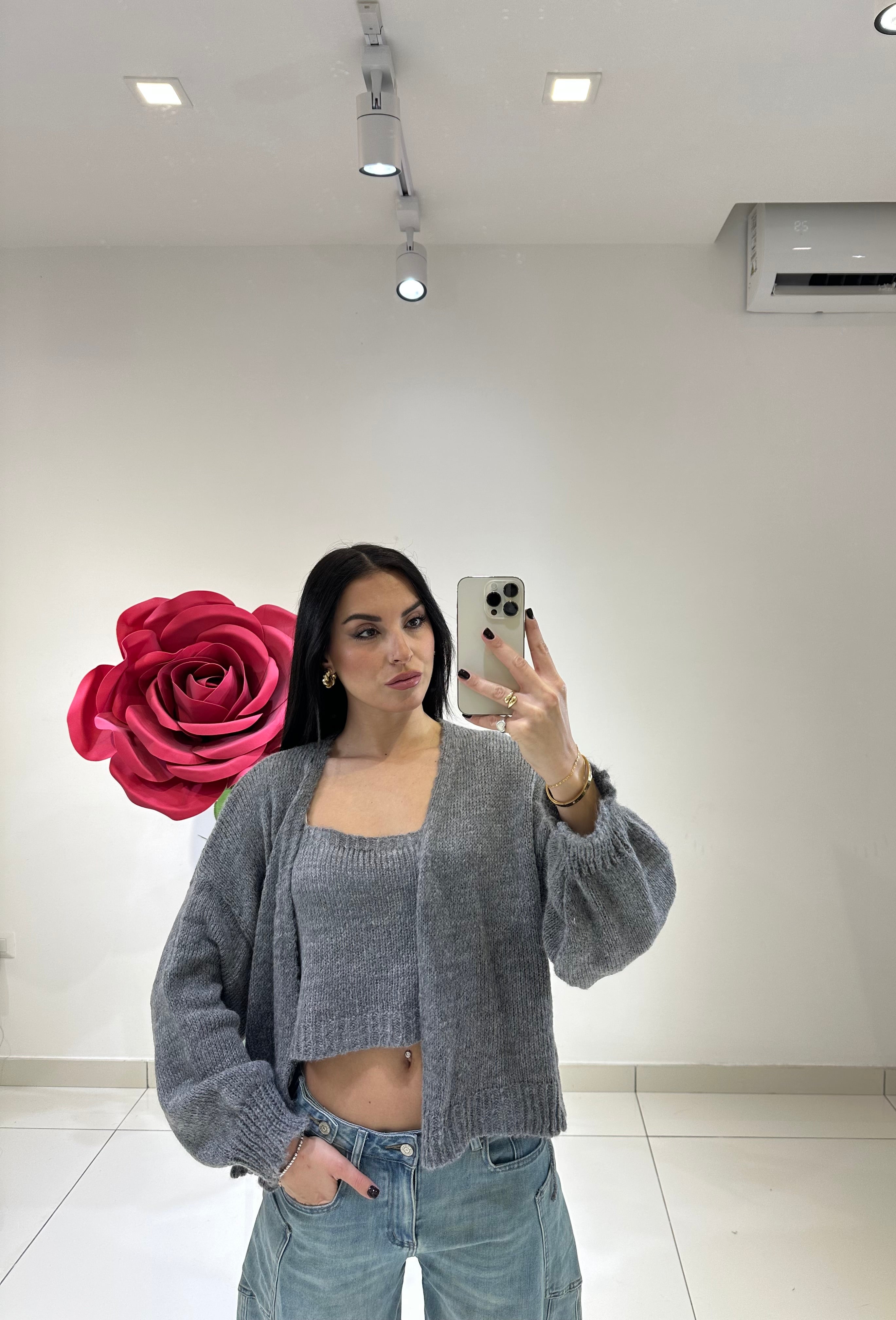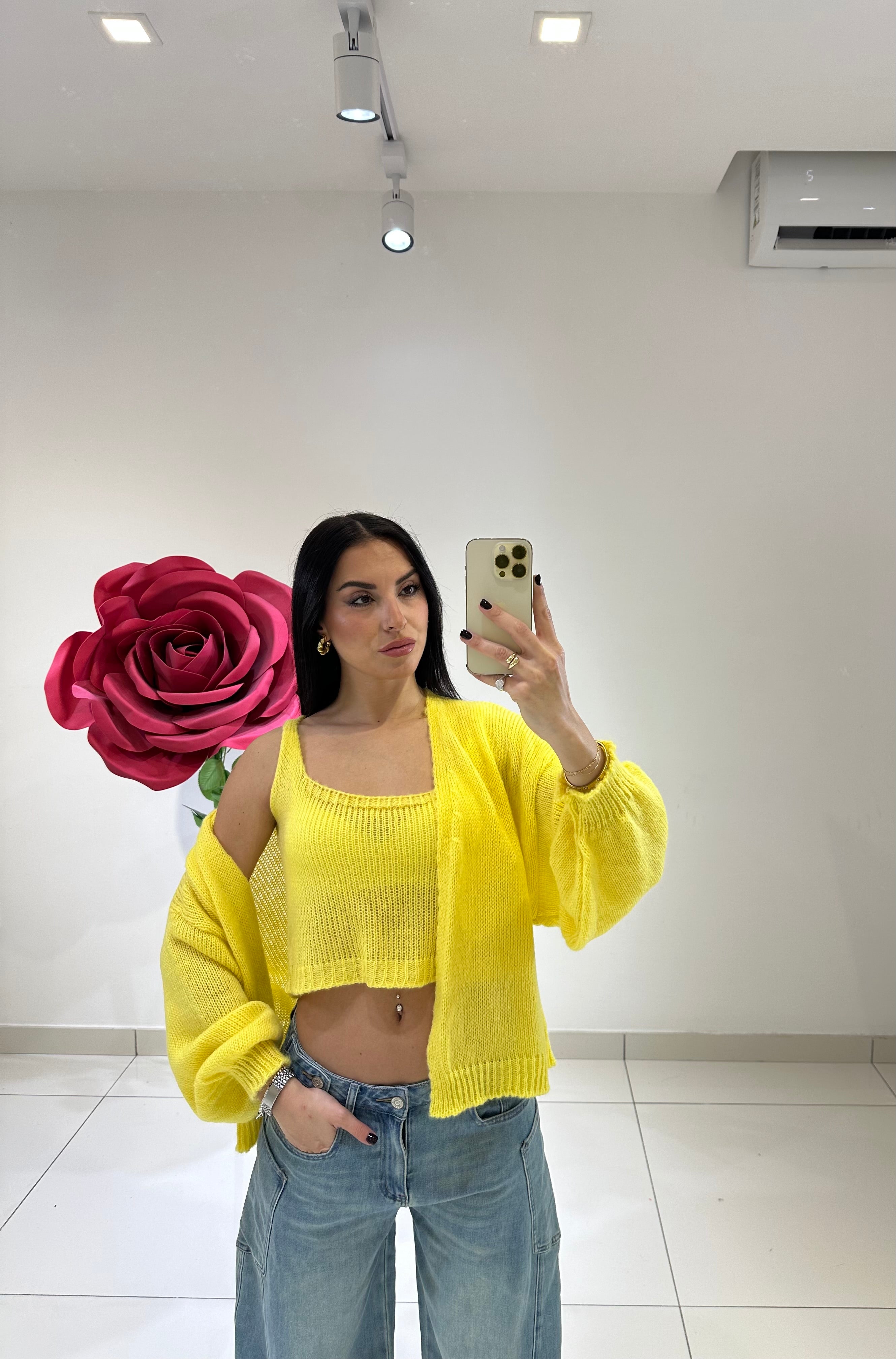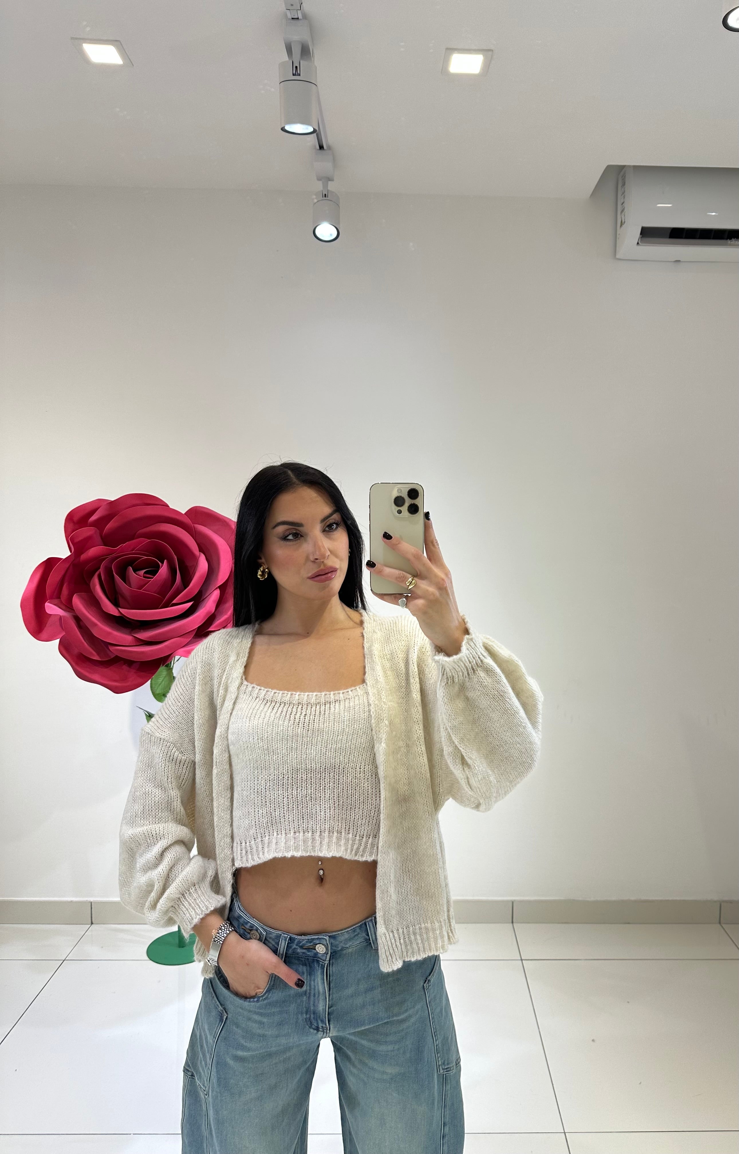 SET IN MAGLIA COMPOSTO DA TOP CROP E CARDIGAN DA UNA MORBIDA VESTIBILITÁ. IN VARI COLORI