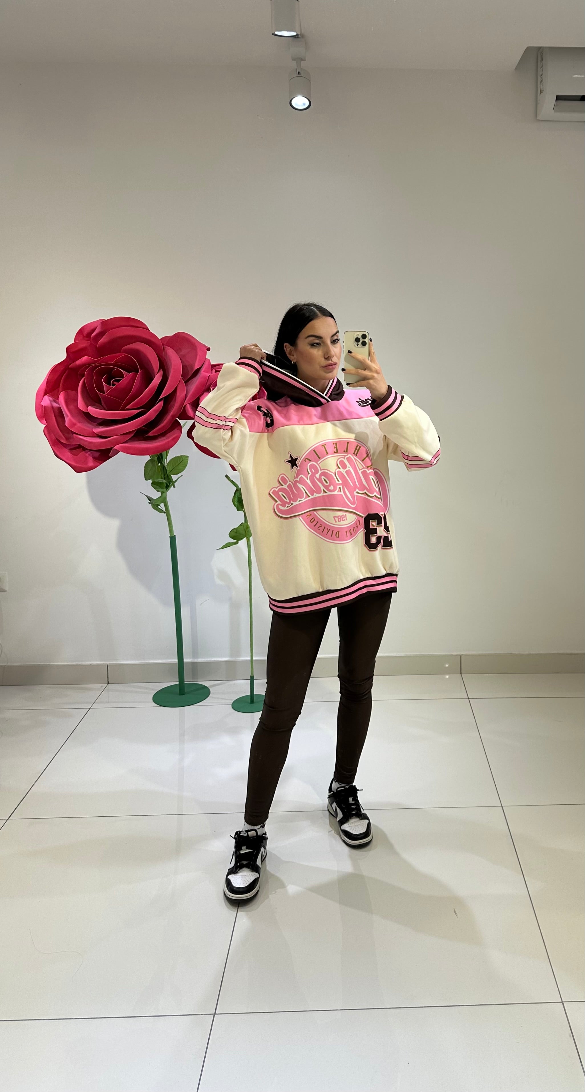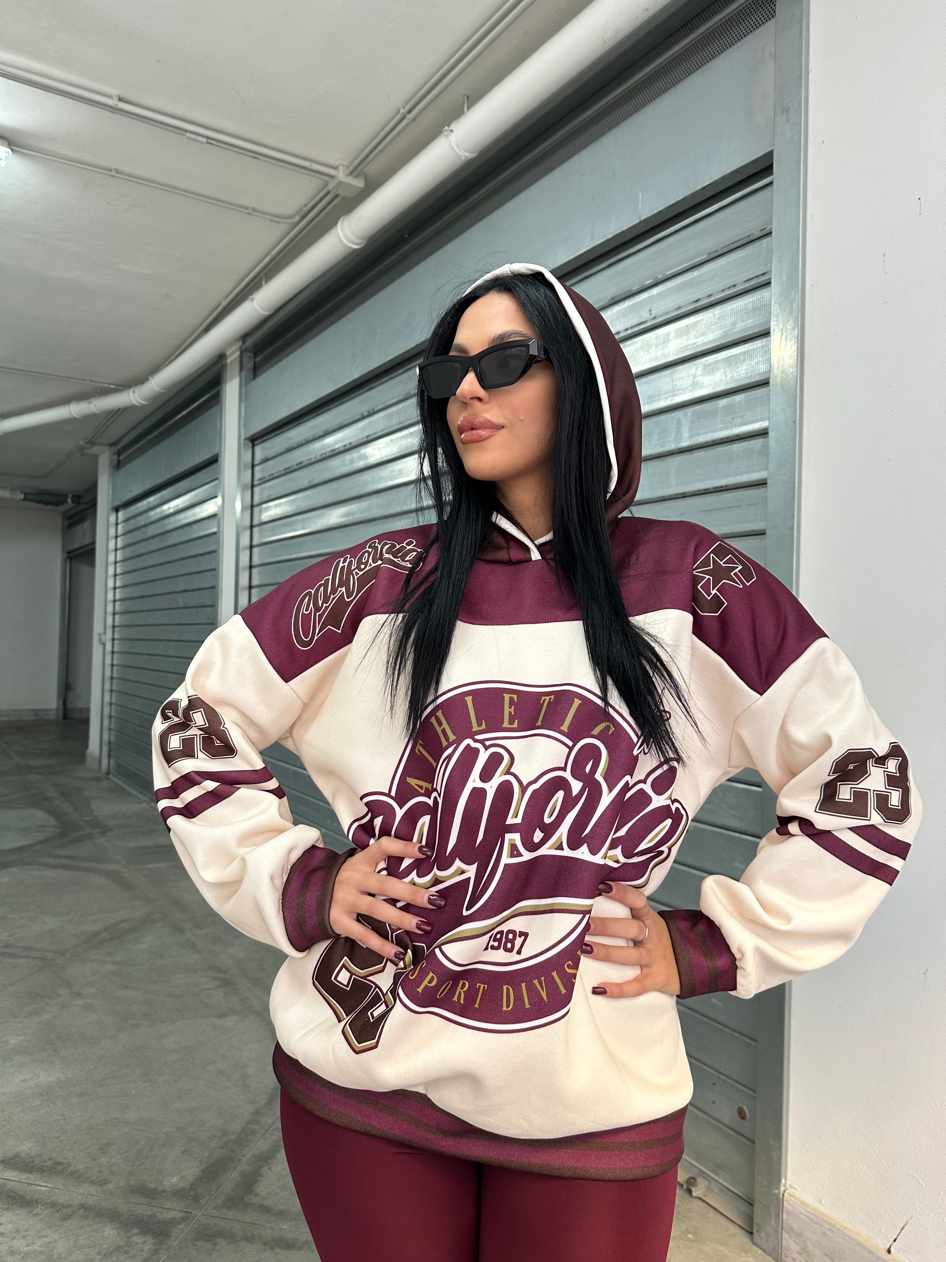 Stile street e comfort in un unico look.Felpa oversize con cappuccio e stampa college “California Athletics”, abbinata a leggings in lycra effetto lucido.Un coordinato grintoso e...