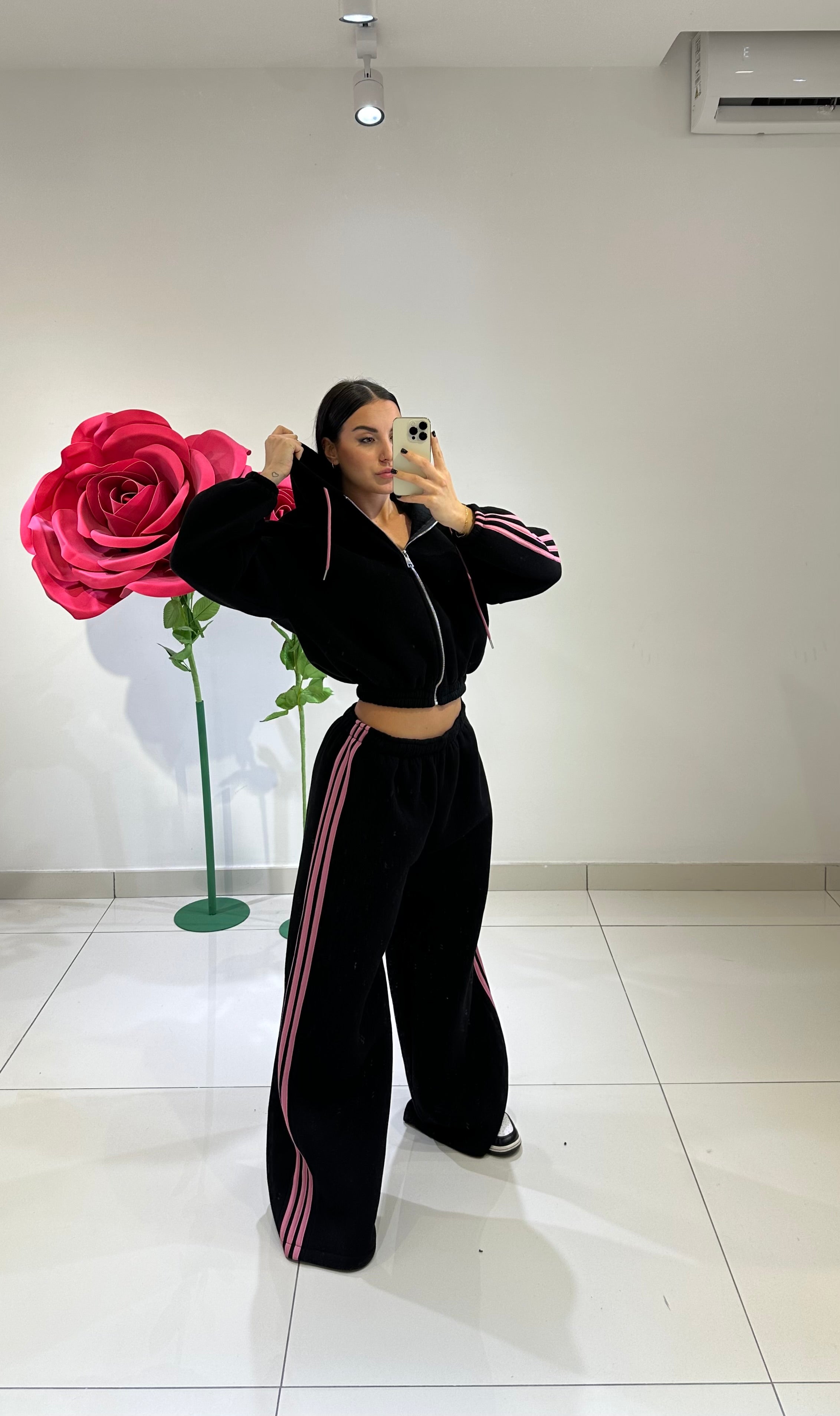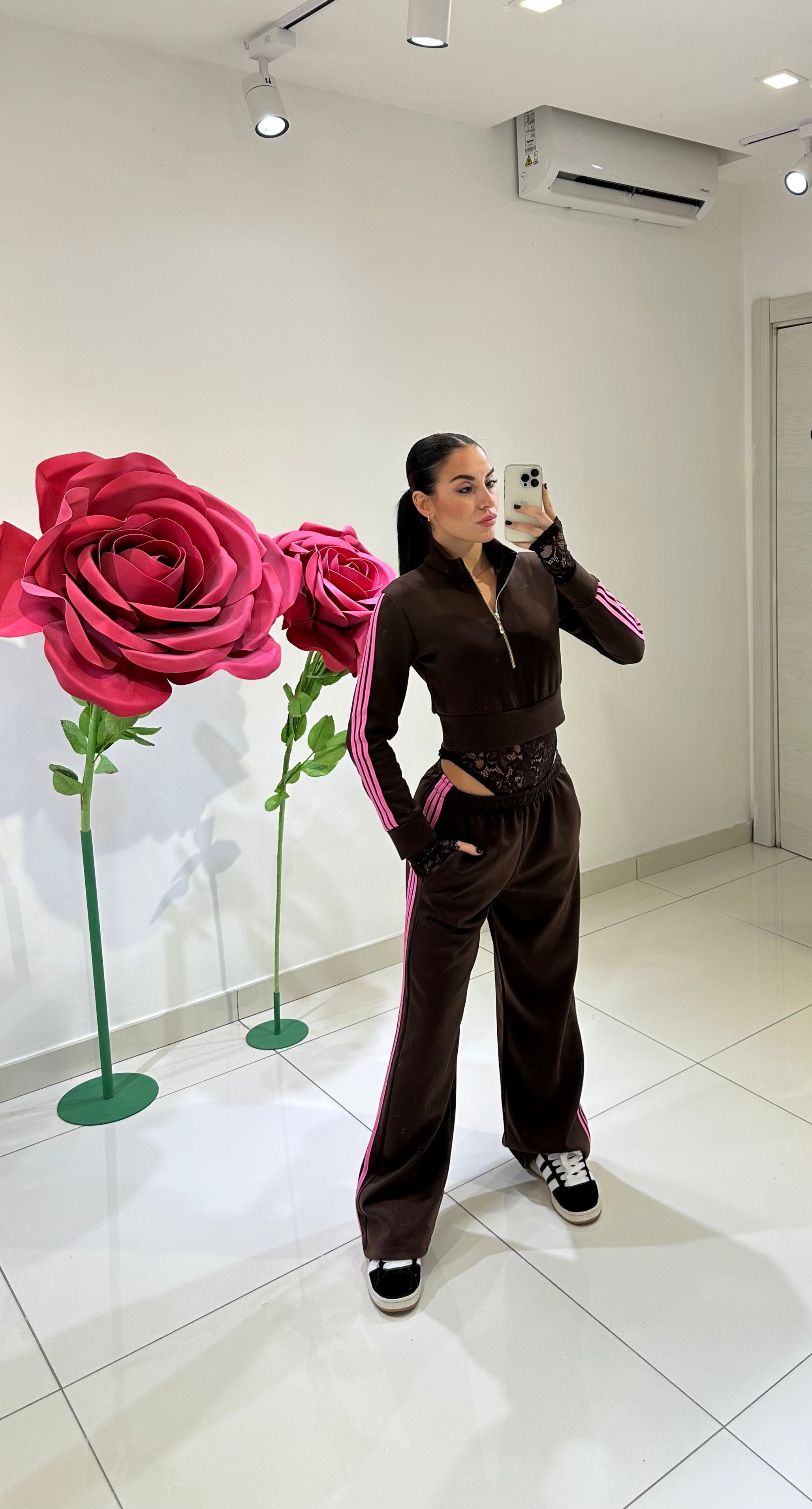 COORDSET COMPOSTO DA FELPA CROP CON SCOLLO ZIP, EFFETTO BODY IN PIZZO, BANDE LATERALI IN CONTRASTO DI COLORE CHE VENGONO RICHIAMATE ANCHE AI LATI DEL PANTALONE...