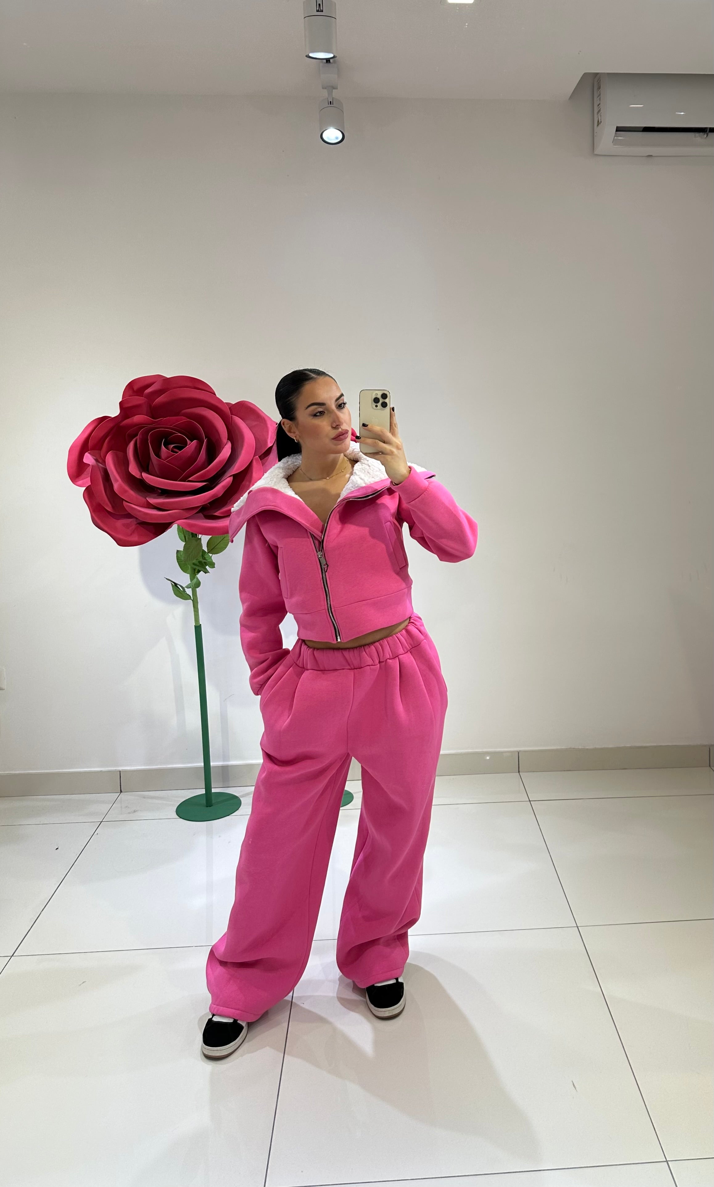 COORDSET DI TUTA FELPATO ALL’INTERNO, COMPOSTO DA FELPA SLIM CON ZIP, AMPIO COLLO CON PELLICCIA E PANTALONE OVER, GAMBA LARGA CON ELASTICO IN VITA E TASCHE....