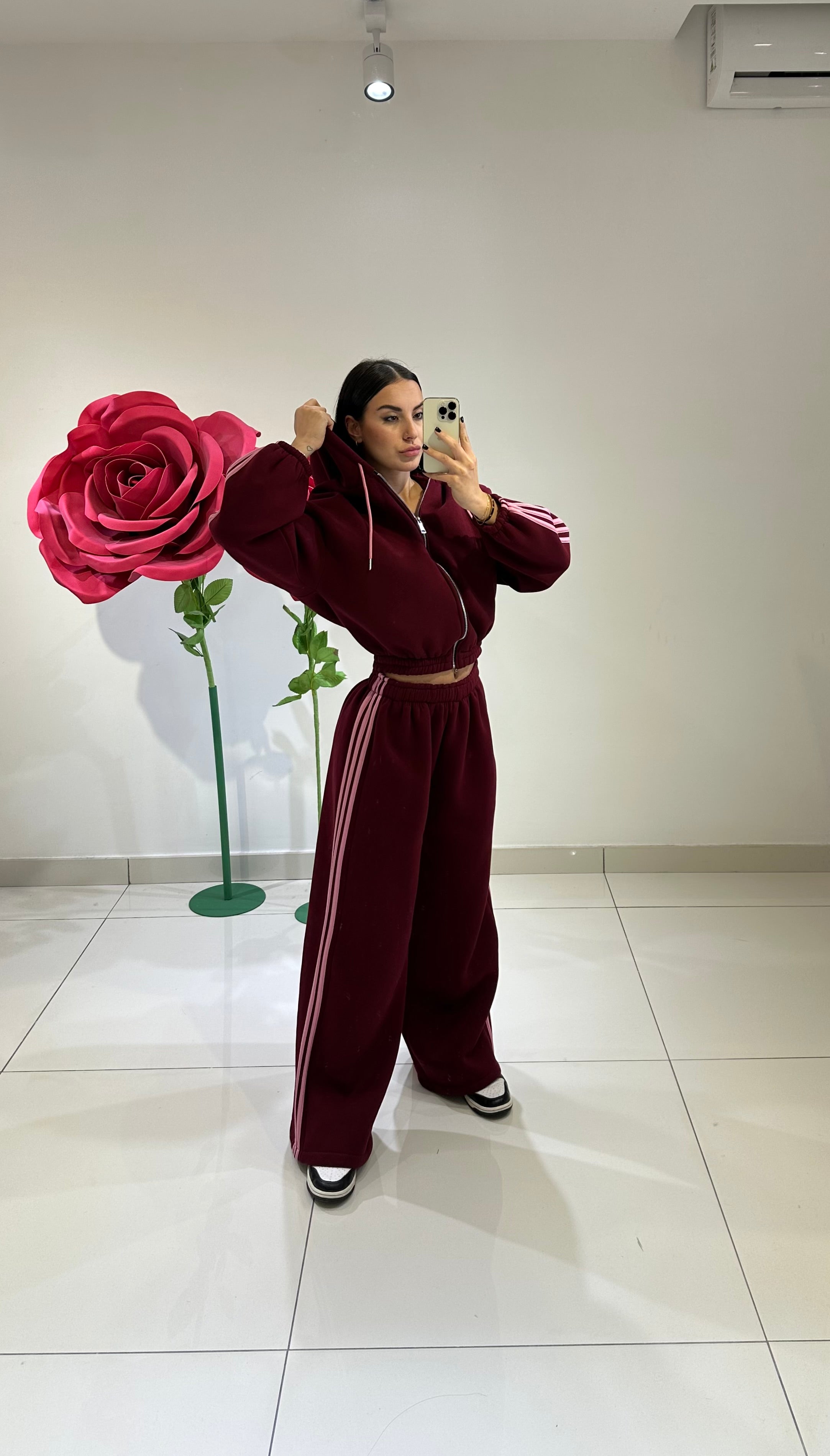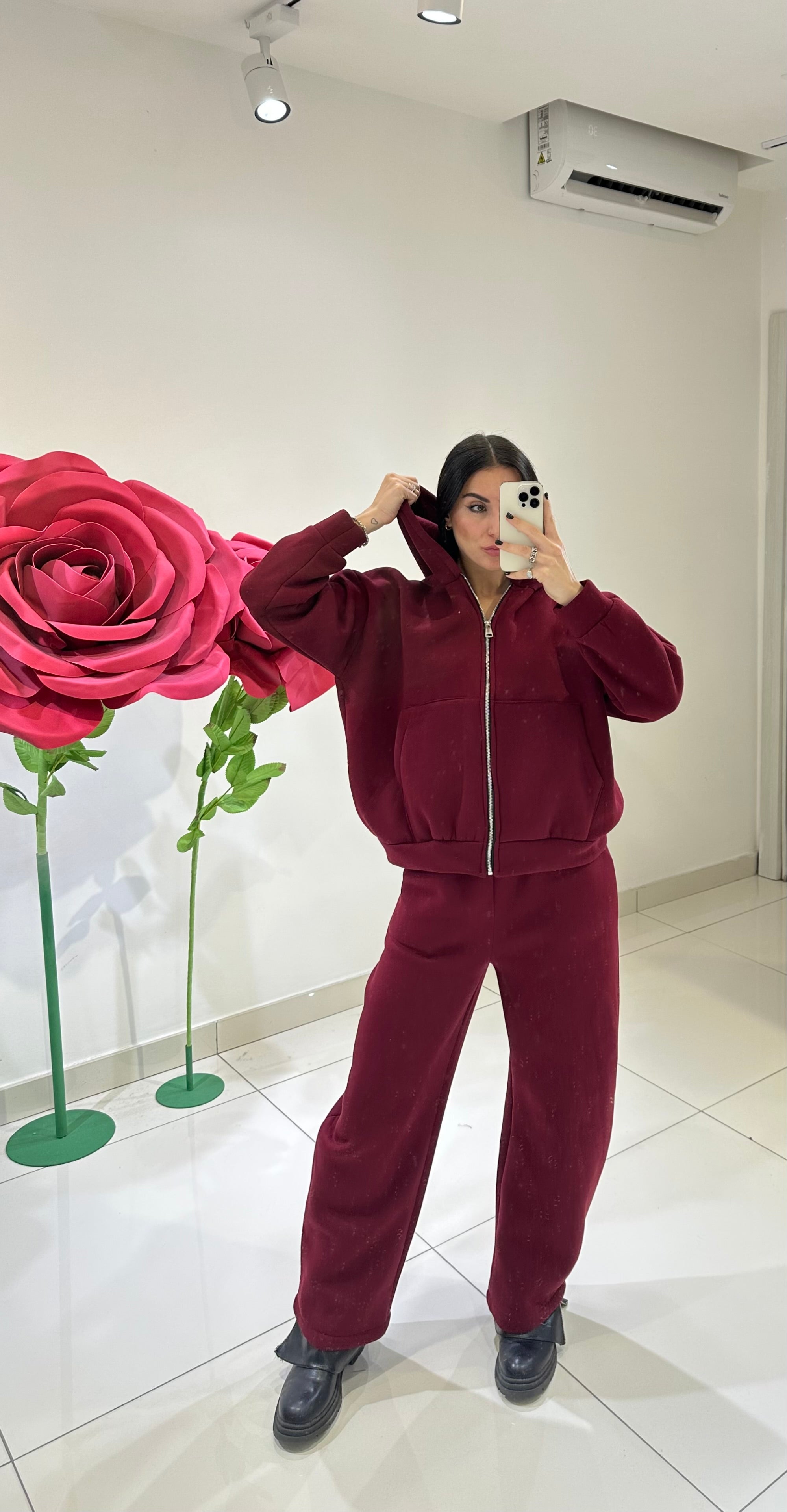 COORDSET DI TUTA FELPATO ALL’INTERNO CON FELPA ZIP CON CAPOUCCIO E TASCHE, PANTALONE PALAZZO CON ELASTICO IN VITA. IN VARI COLORI