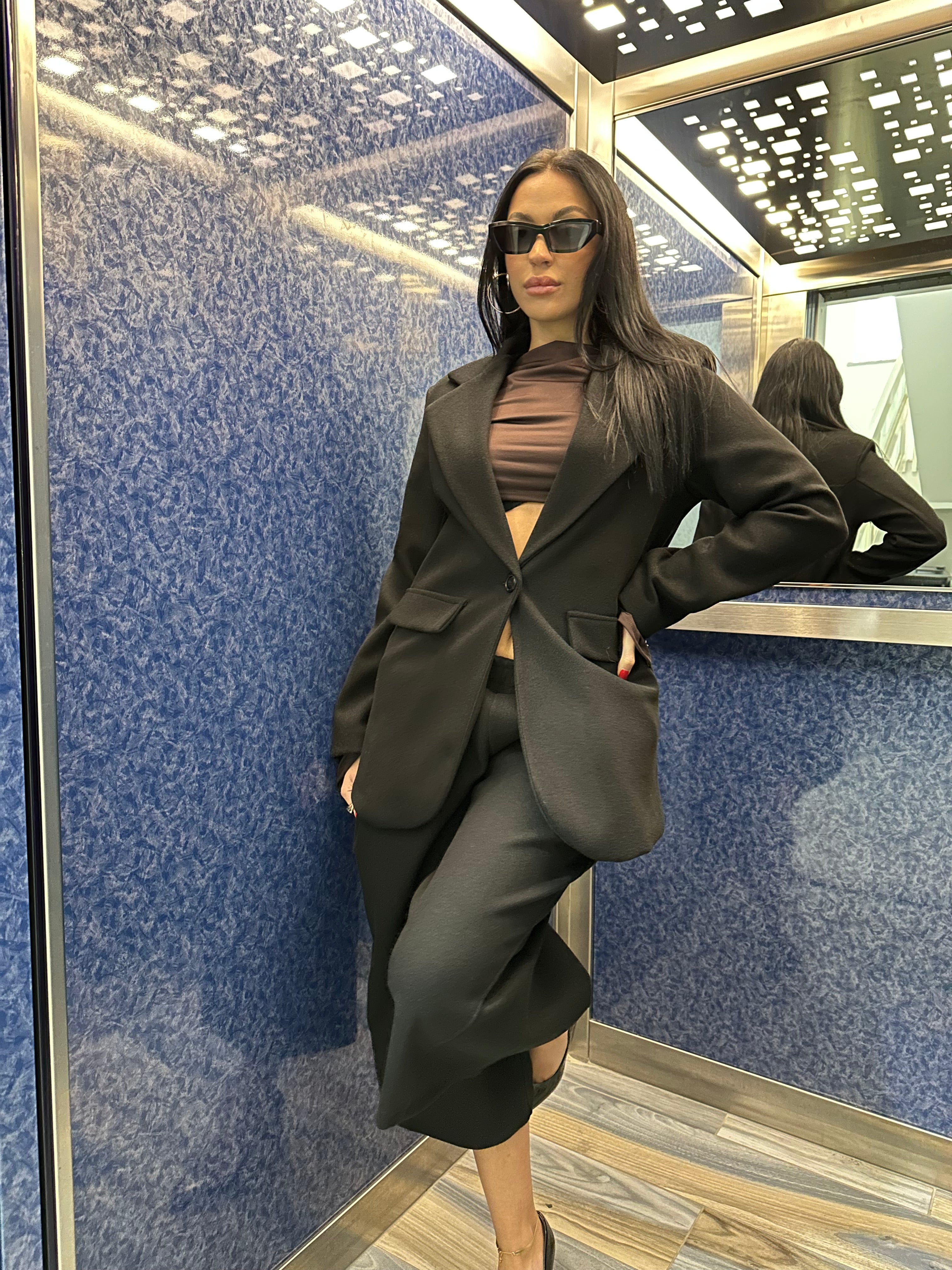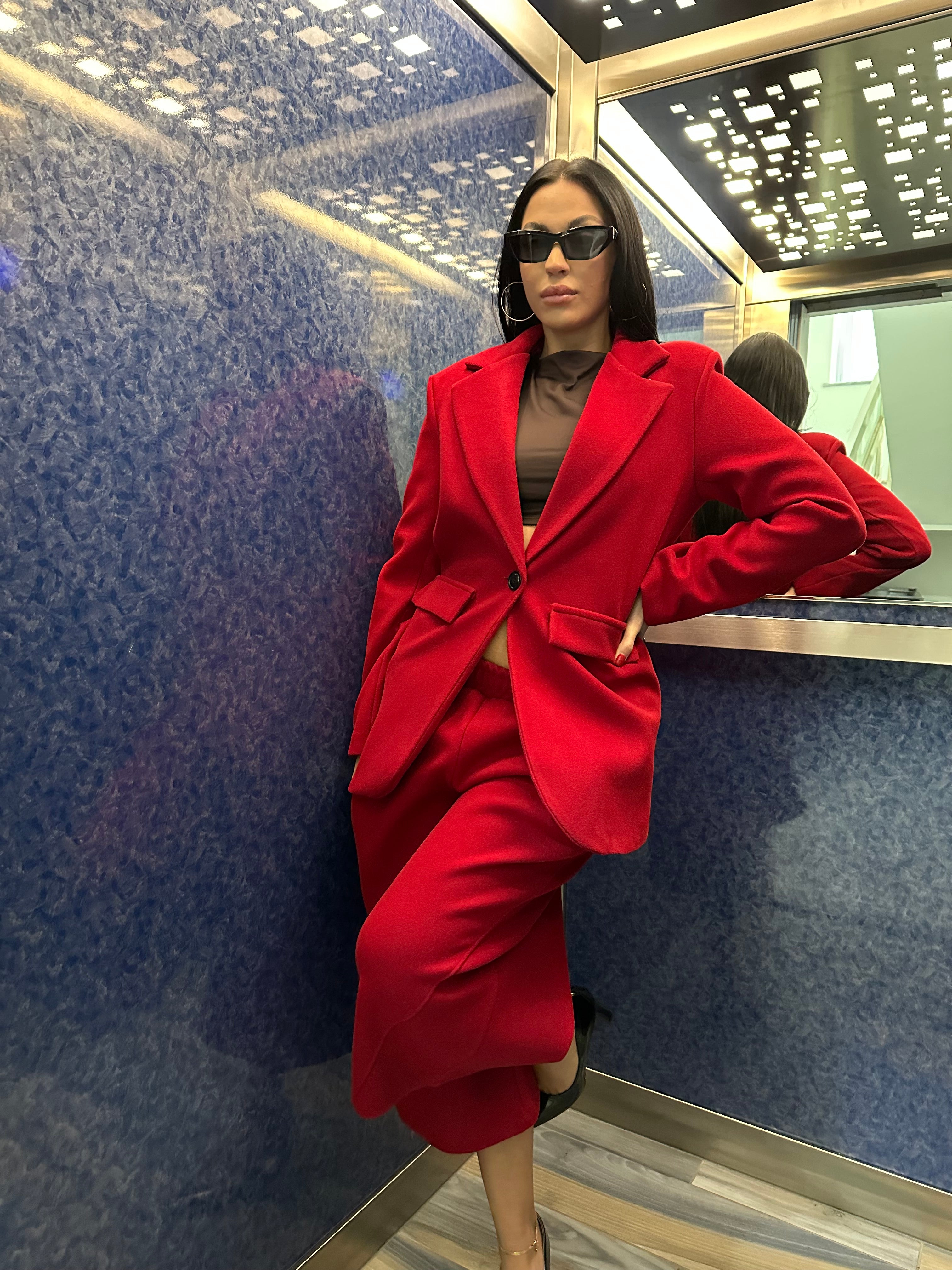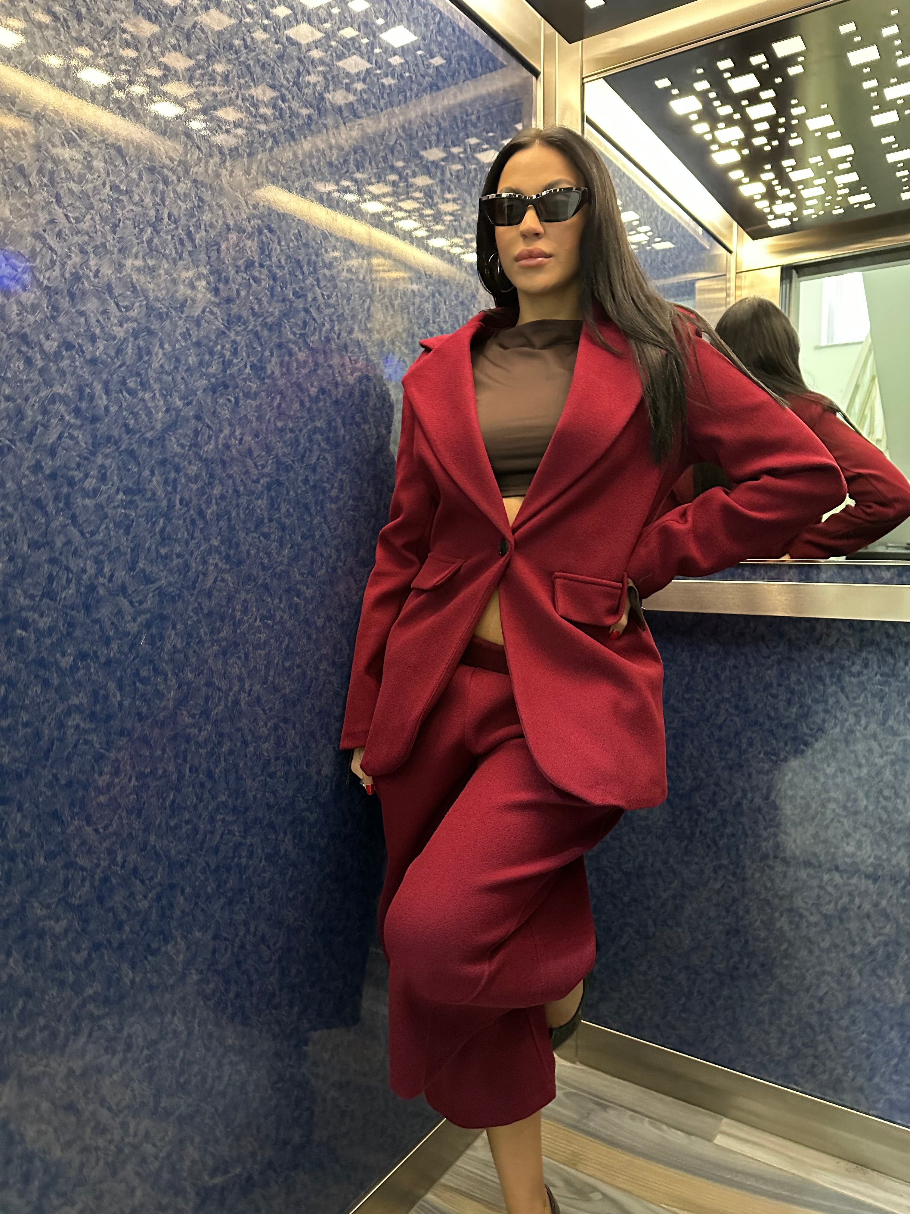 COORDSET COMPOSTO DA GIACCA DAL TAGLIO SARTORIALE CON SCOLLO A V , SPALLINE IMBOTTITE E CHIUSURA CON BOTTONE CENTRALE. PANTALONE LUNGHEZZA POLPACCIO TAGLIO MORBIDO E AMPIO...