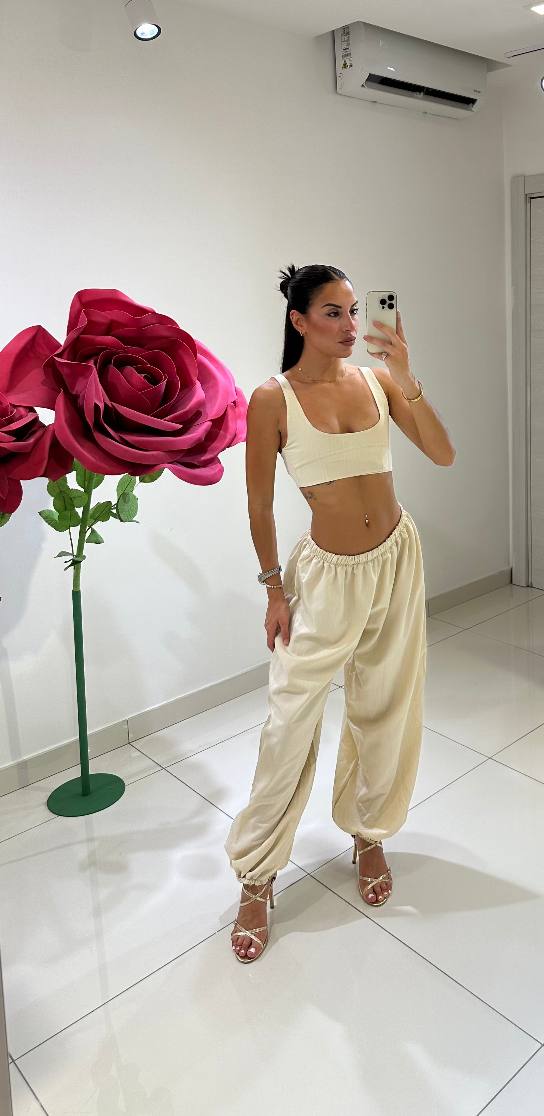 COTTON SET WITH BOW TOP, PREFORMED CUPS, CROP SHIRT, AND BALLOON TROUSERS. IN VARIOUS COLORS