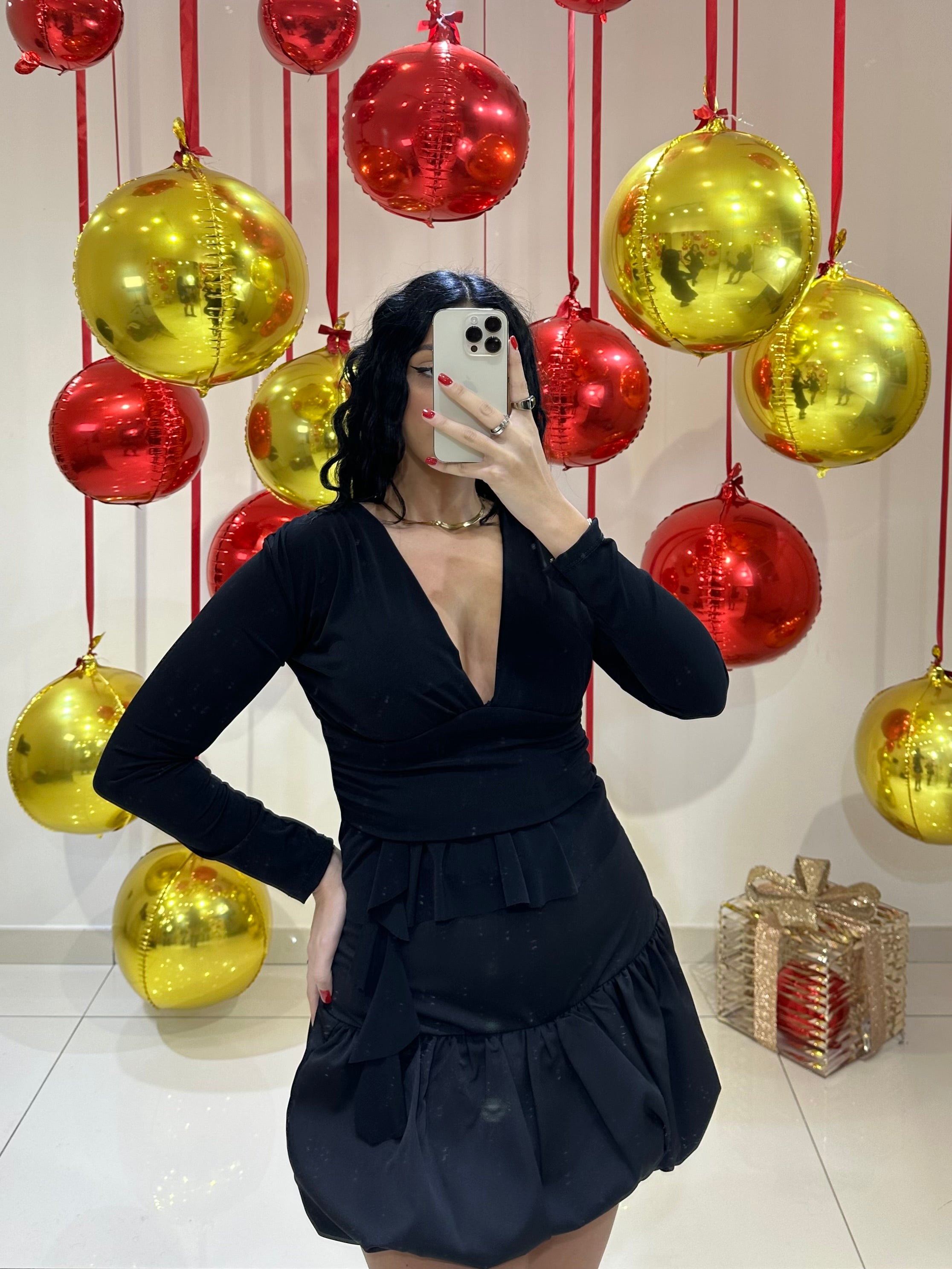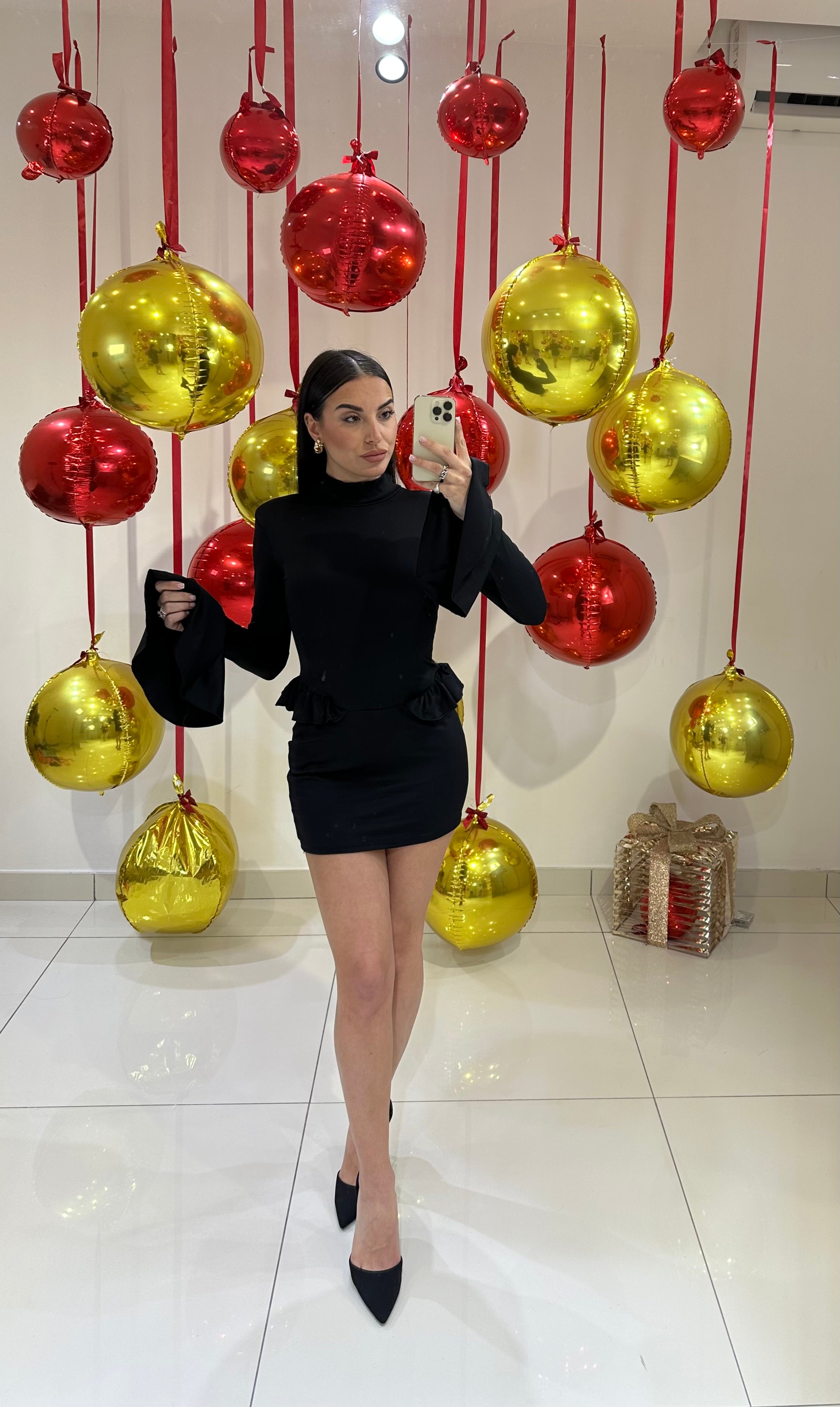 DRESS IN LYCRA, MEZZO COLLO CON SPALLINE, MANICA LUNGA CON VOLANT AL FONDO E AI LATI DEI FIANCHI. IN VARI COLORI