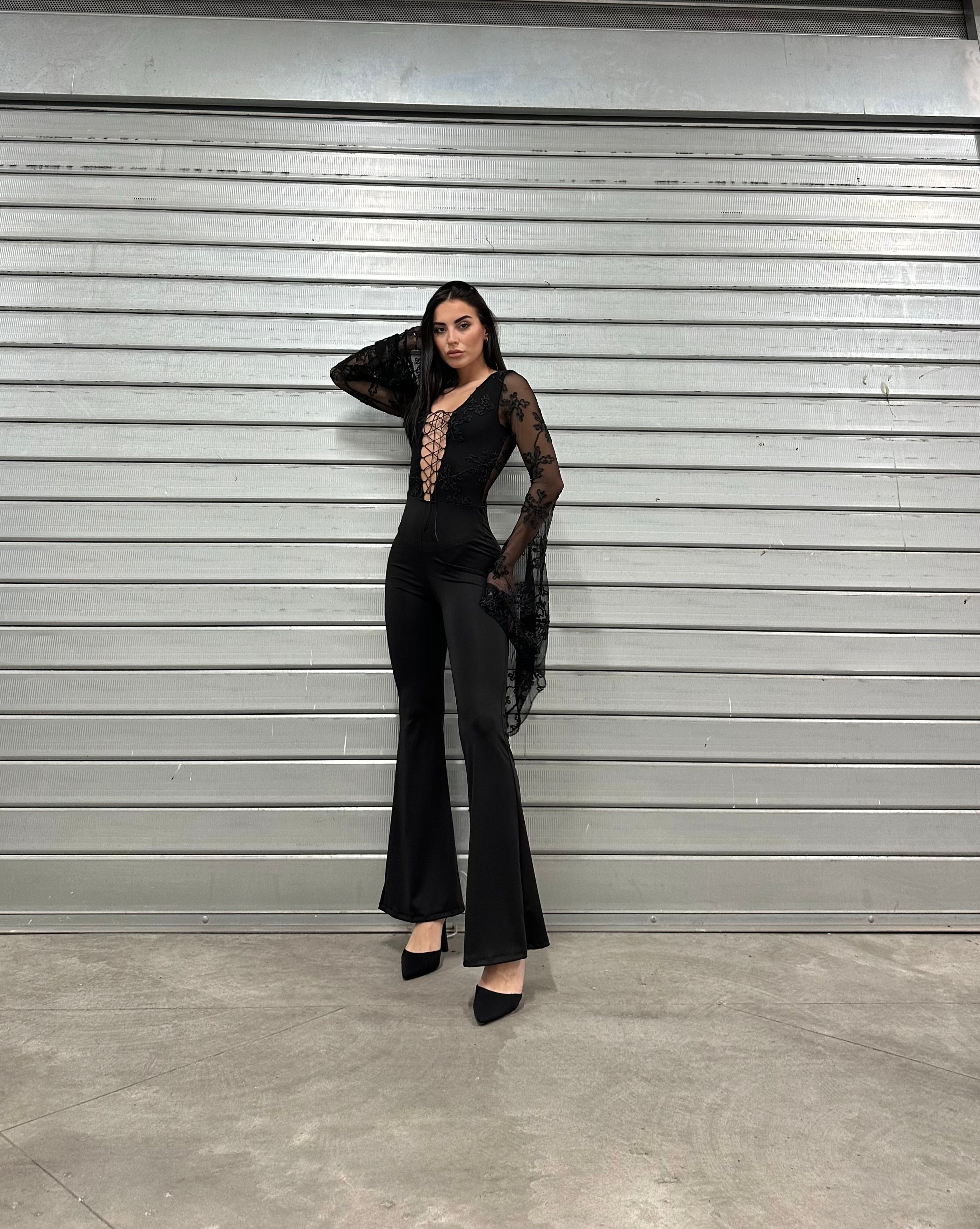 JUMPSUIT CON PARTE SUPERIORE IN PIZZO, MANICA LUNGA VELATA AMPIA AL FONDO, PROFONDO SCOLLO A V DETTAGLIATO DA STRINGHE, PANTALONE A ZAMPA IN LYCRA. IN VARI...