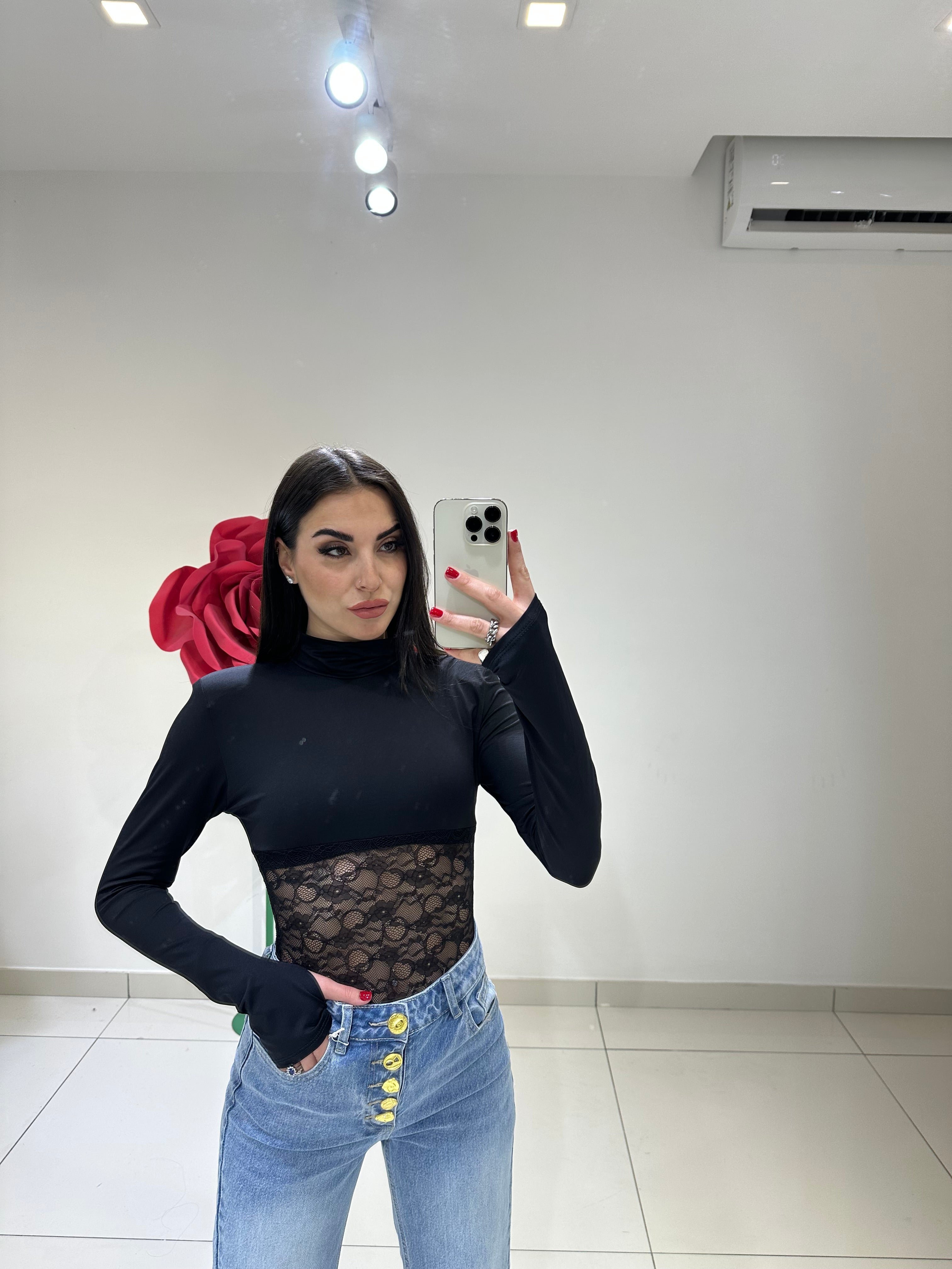 BODY CON PARTE SUPERIORE IN LYCRA, COLLO ALTO MANICA LUNGA A GUANTO, SPALLINE IMBOTTITE, PARTE INFERIORE IN PIZZO. IN VARI COLORI