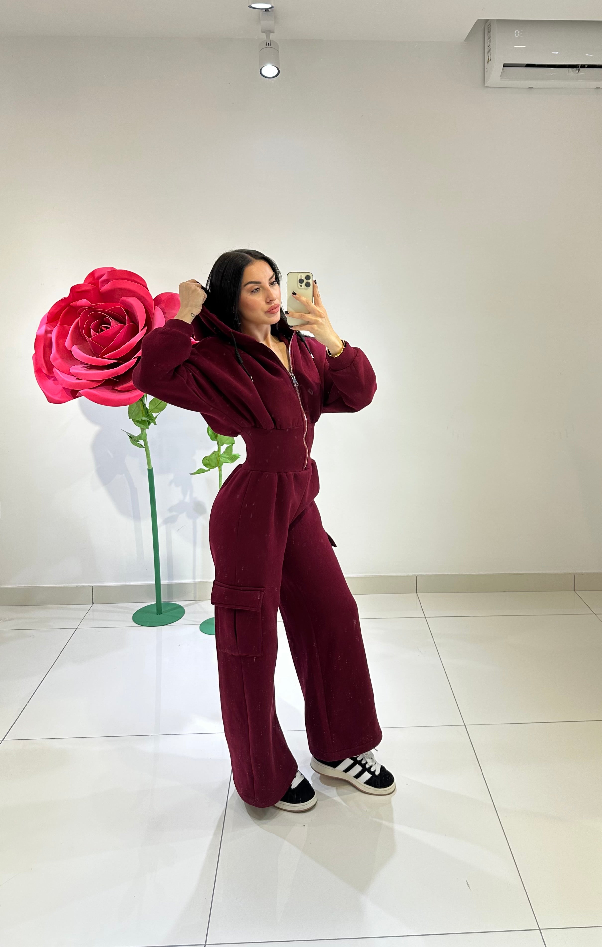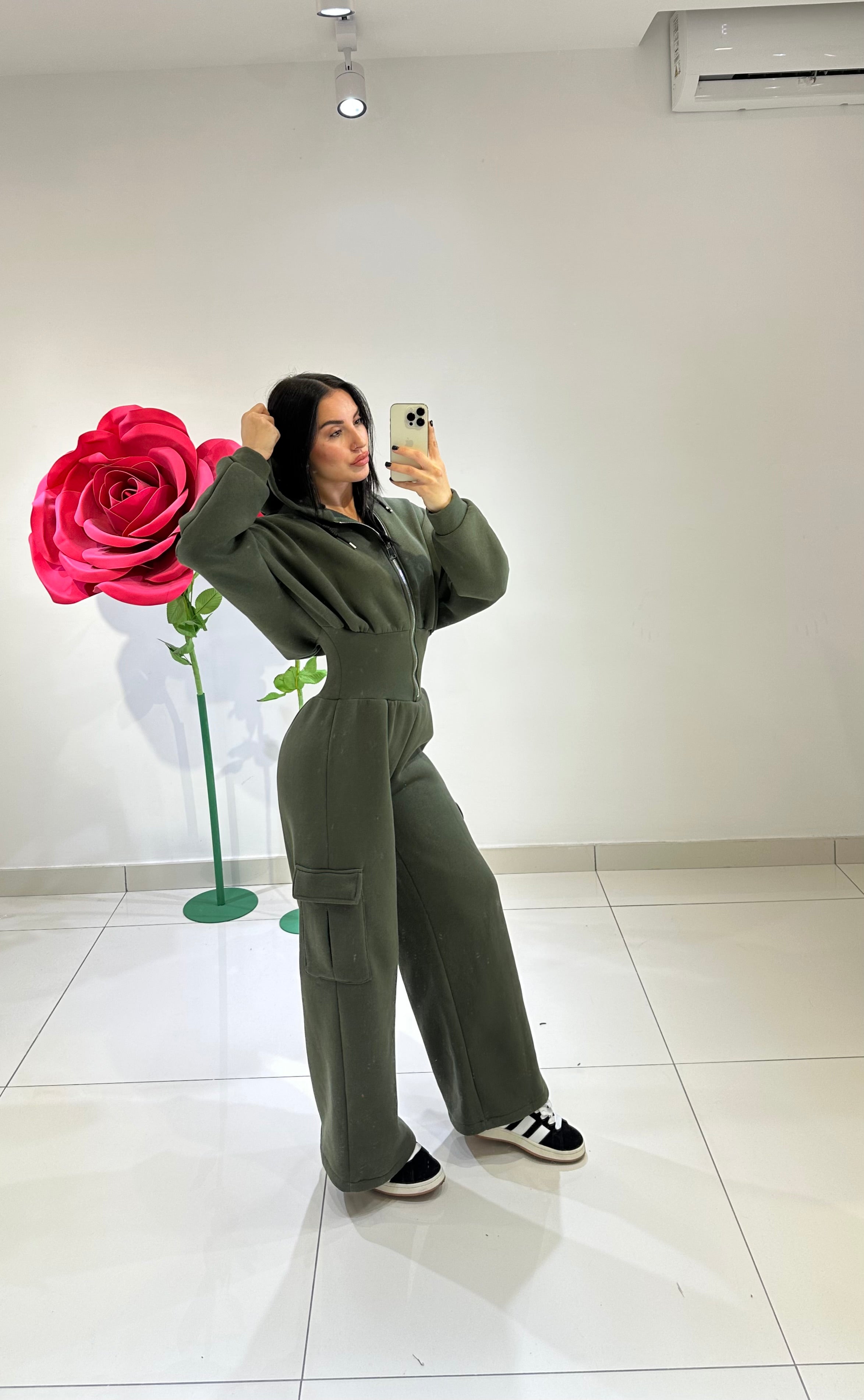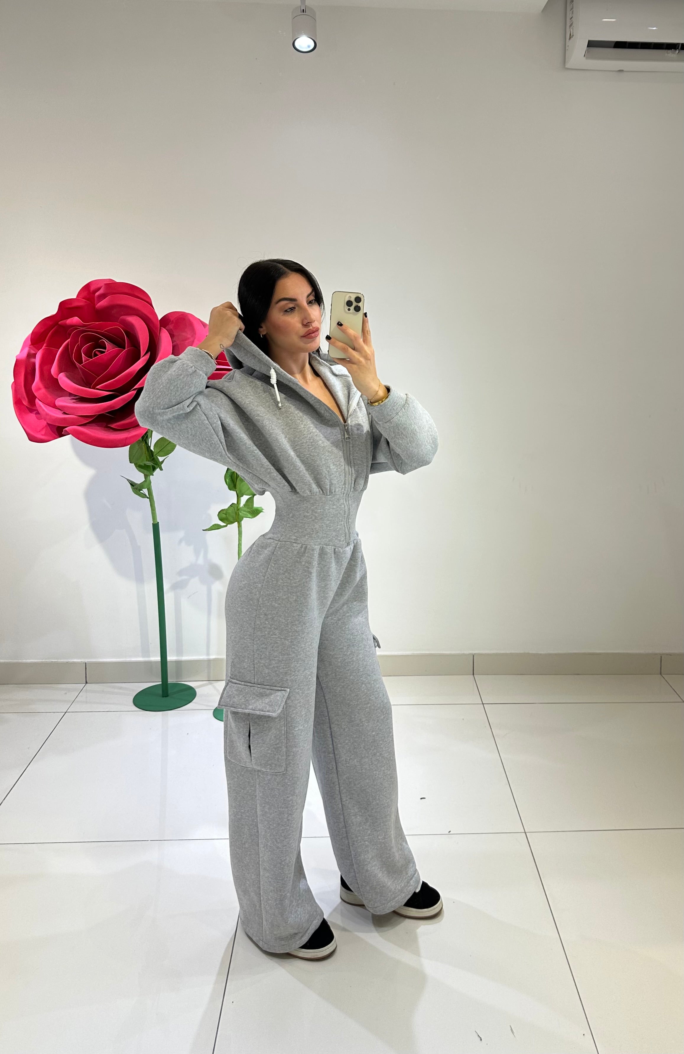 JUMPSUITE DI TUTA, FELPATA ALL’INTERNO, CON CAPPUCCIO, ZIP SUL DAVANTI, EFFETTO BUSTIER CHE VA A SEGNARE IL PUNTO VITA, PANTALONE PALAZZO CARGO. IN VARI COLORI