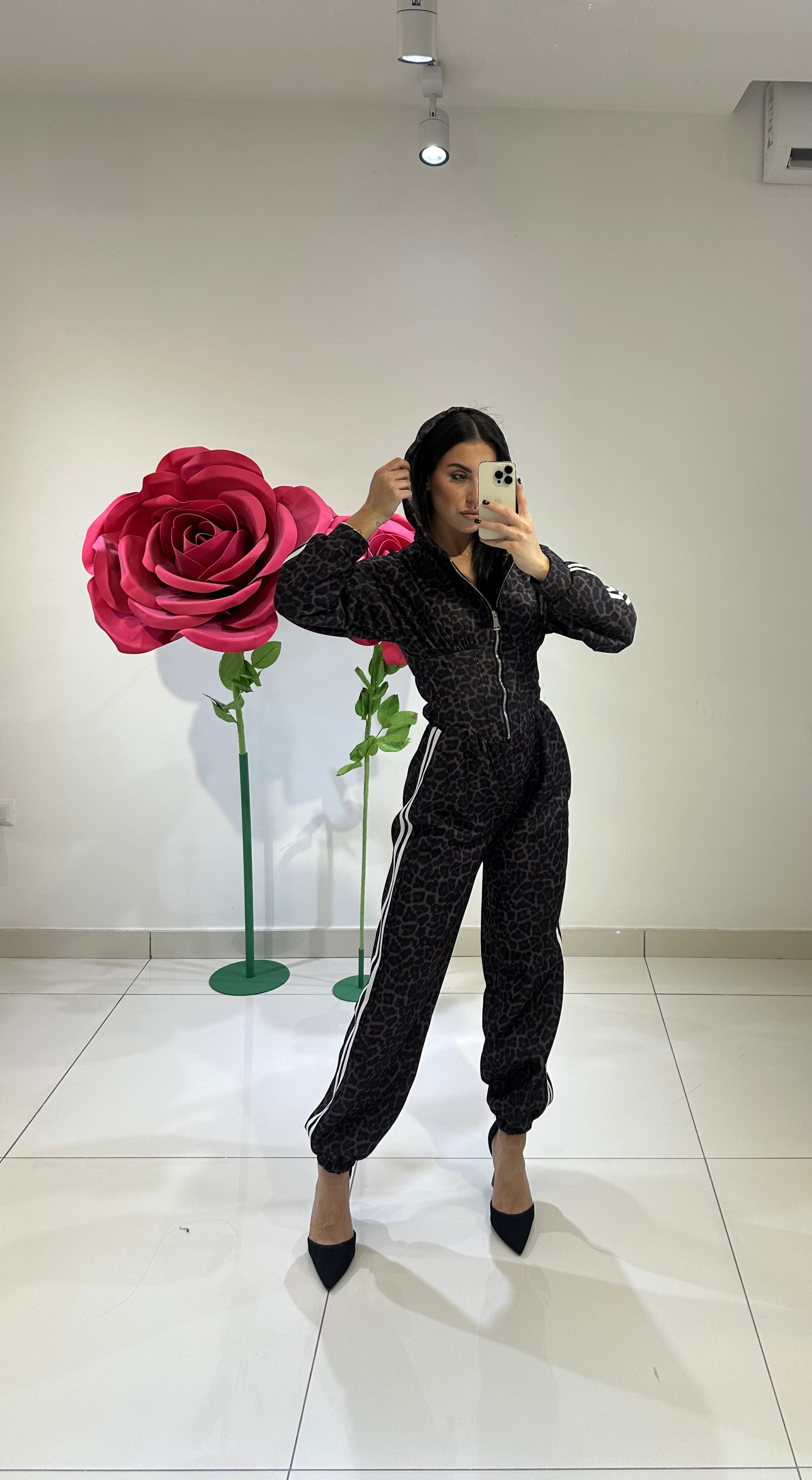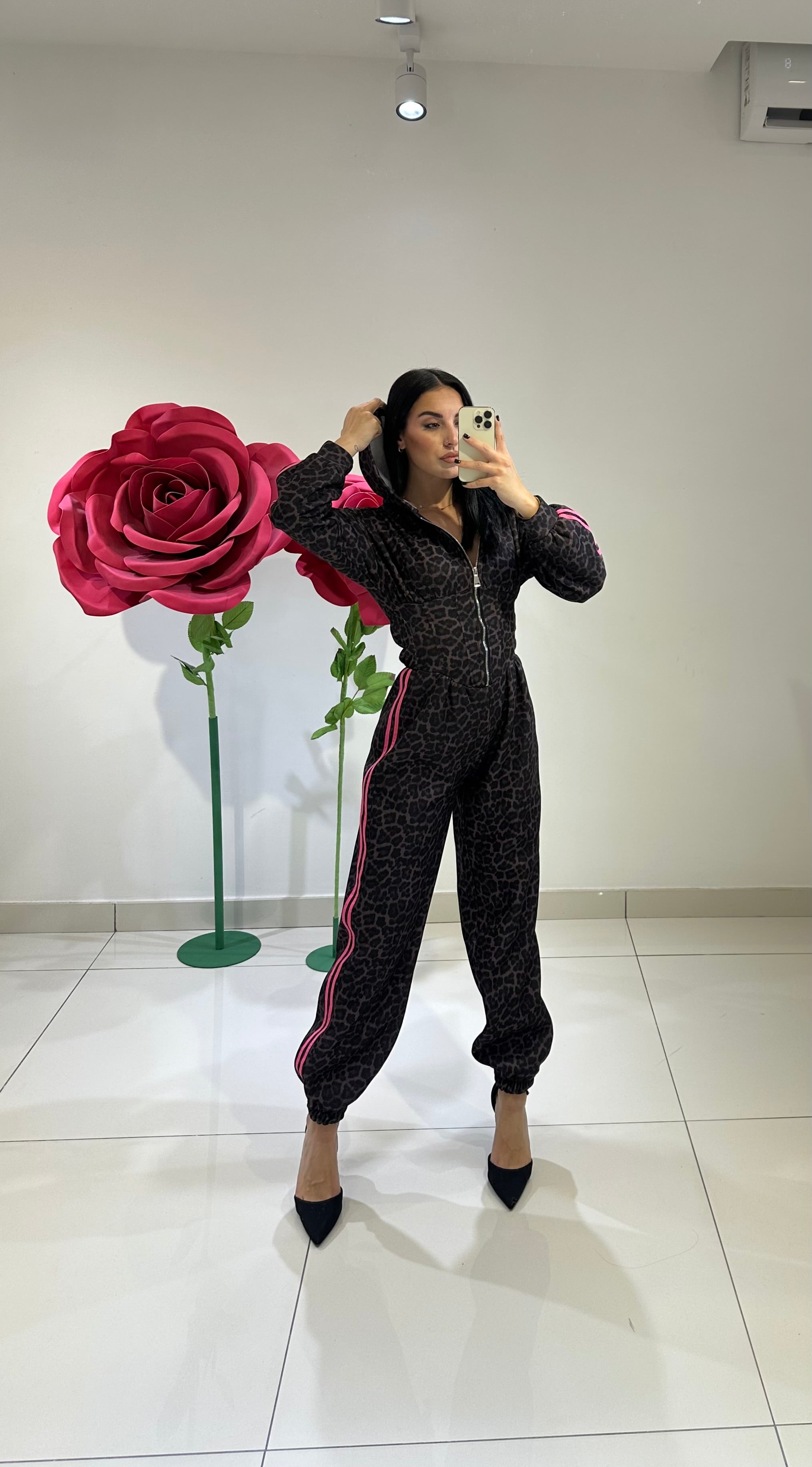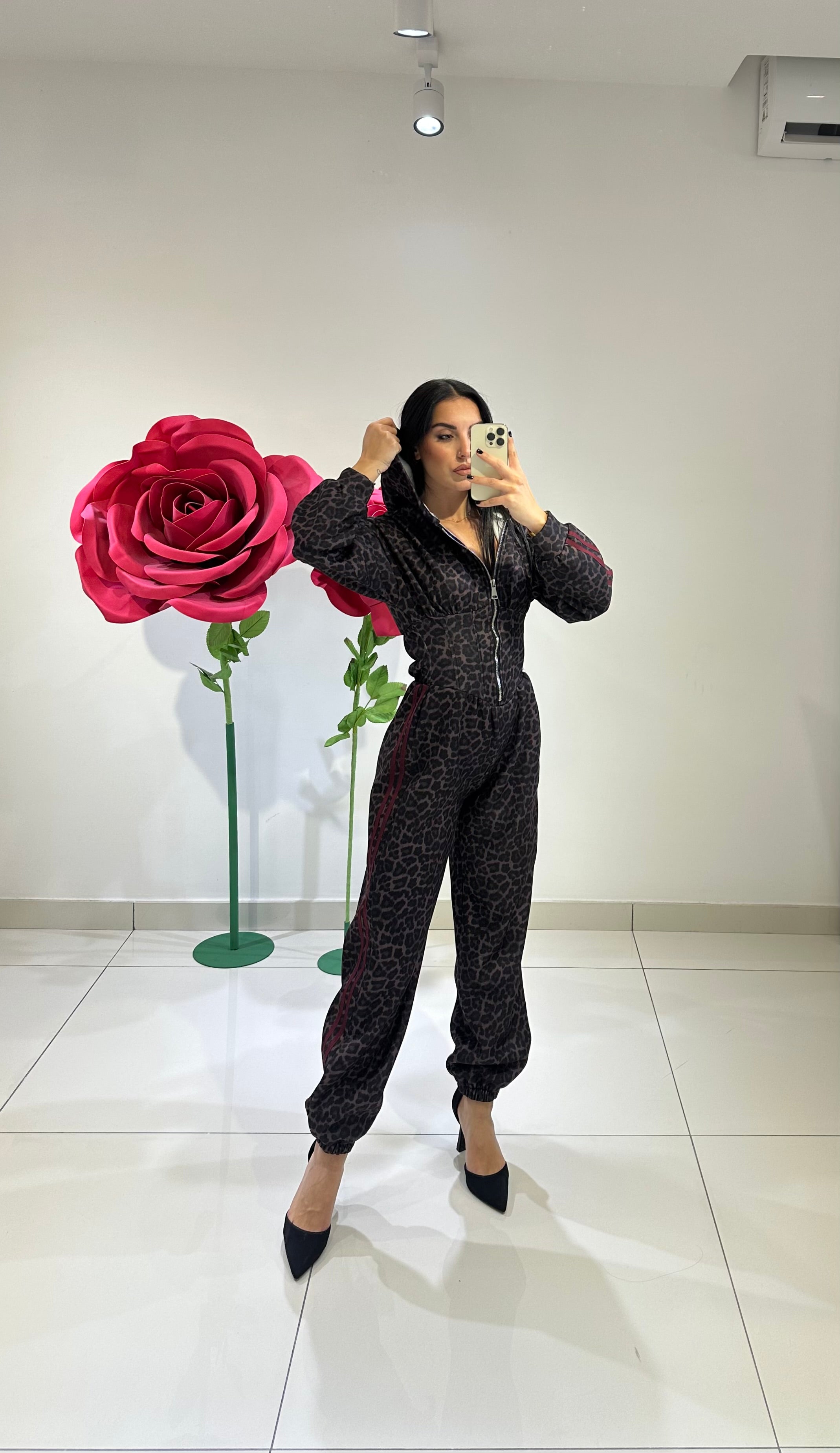 JUMPSUITE STAMPA ANIMALIER, CON CAPPUCCIO, EFFETTO CORSETTO CON ZIP CENTRALE, BANDE LATERALI IN CONTRASTO DI COLORE, ELASTICO AL FONDO, LEGGERMENTE FELPATO ALL’INTERNO. IN VARI COLORI
