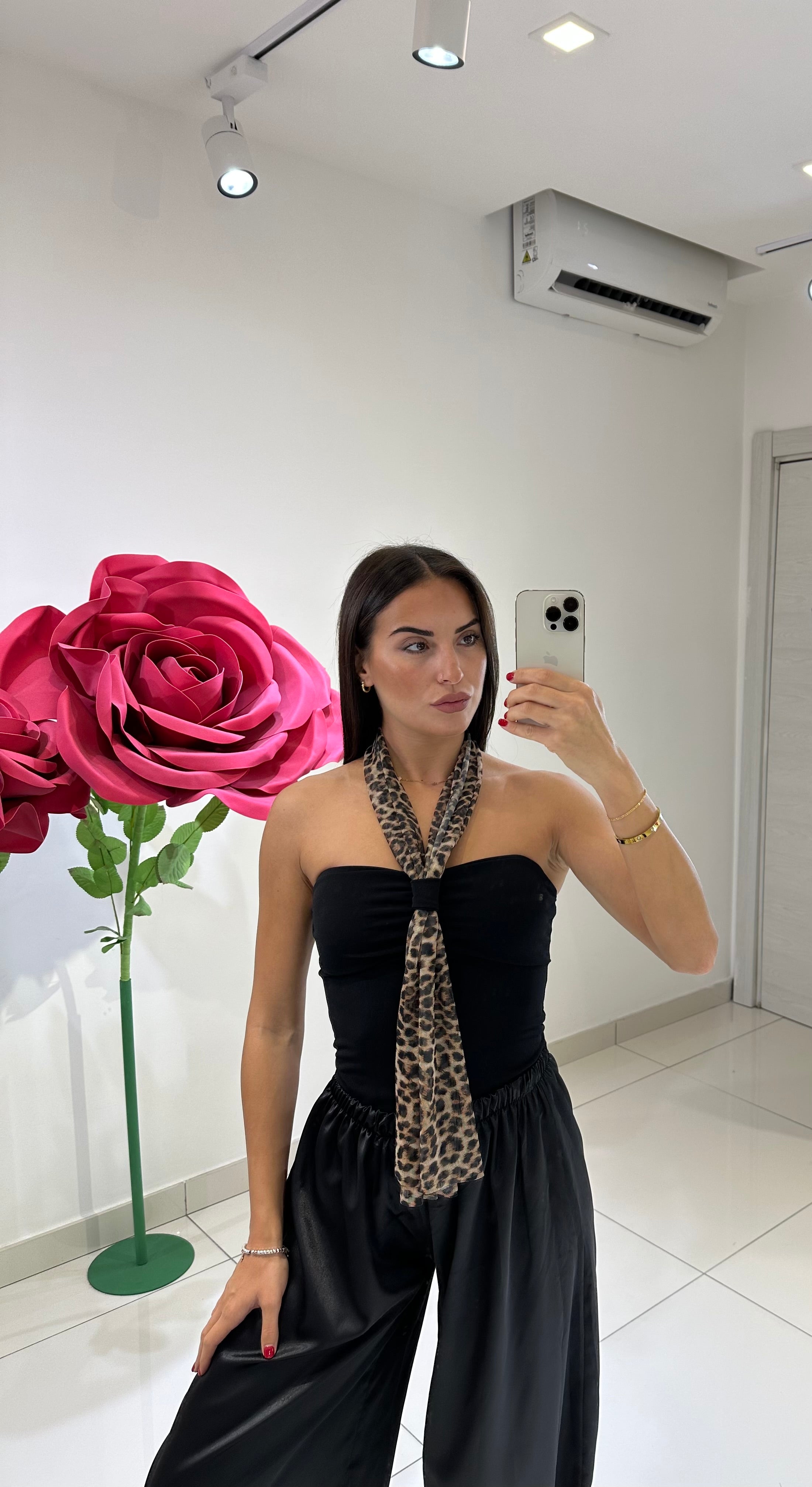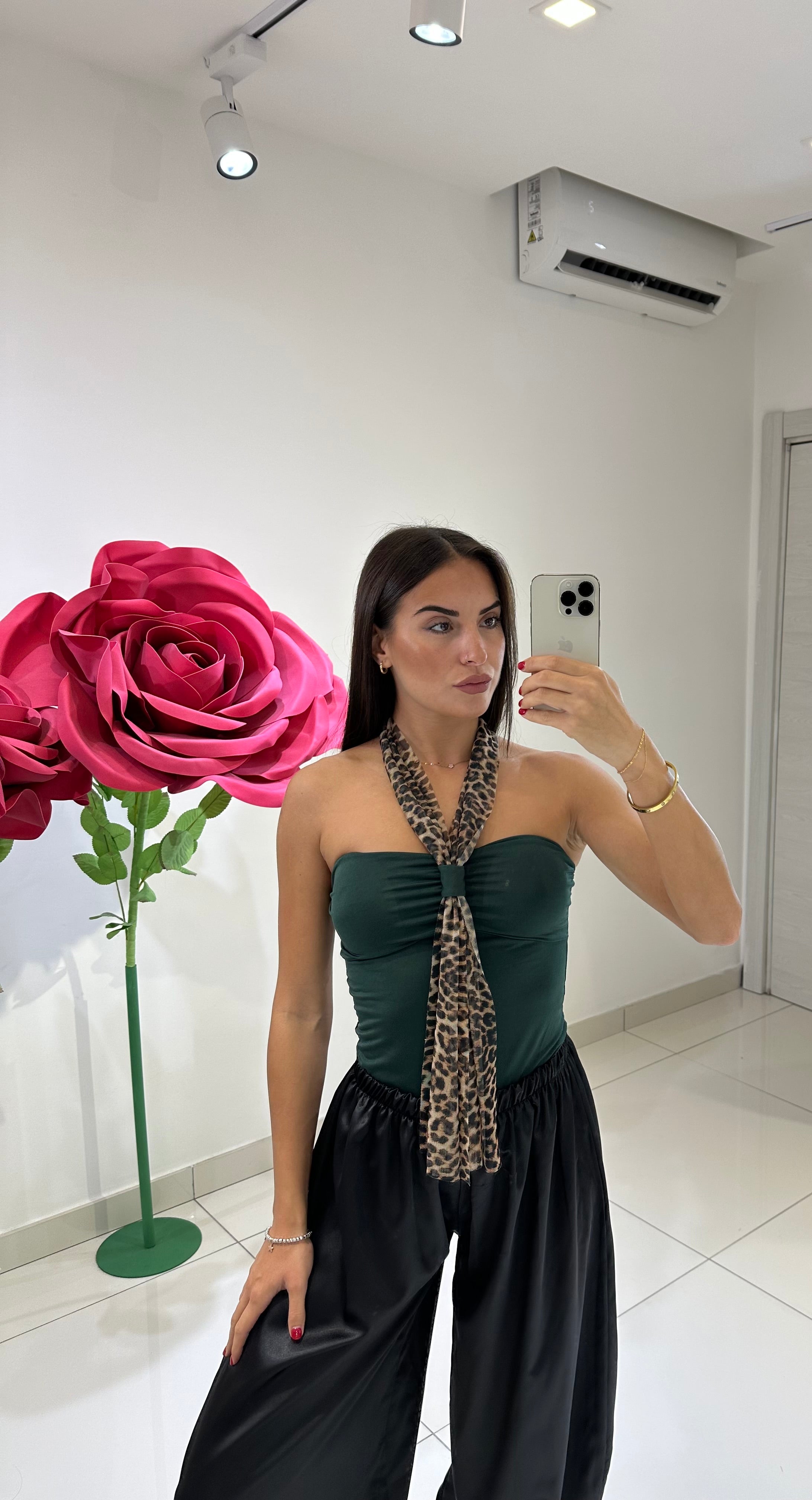 STRETCH FABRIC BODYSUIT WITH PREFORMED CUPS AND REMOVABLE SPOTTED SCARF. AVAILABLE IN VARIOUS COLORS.