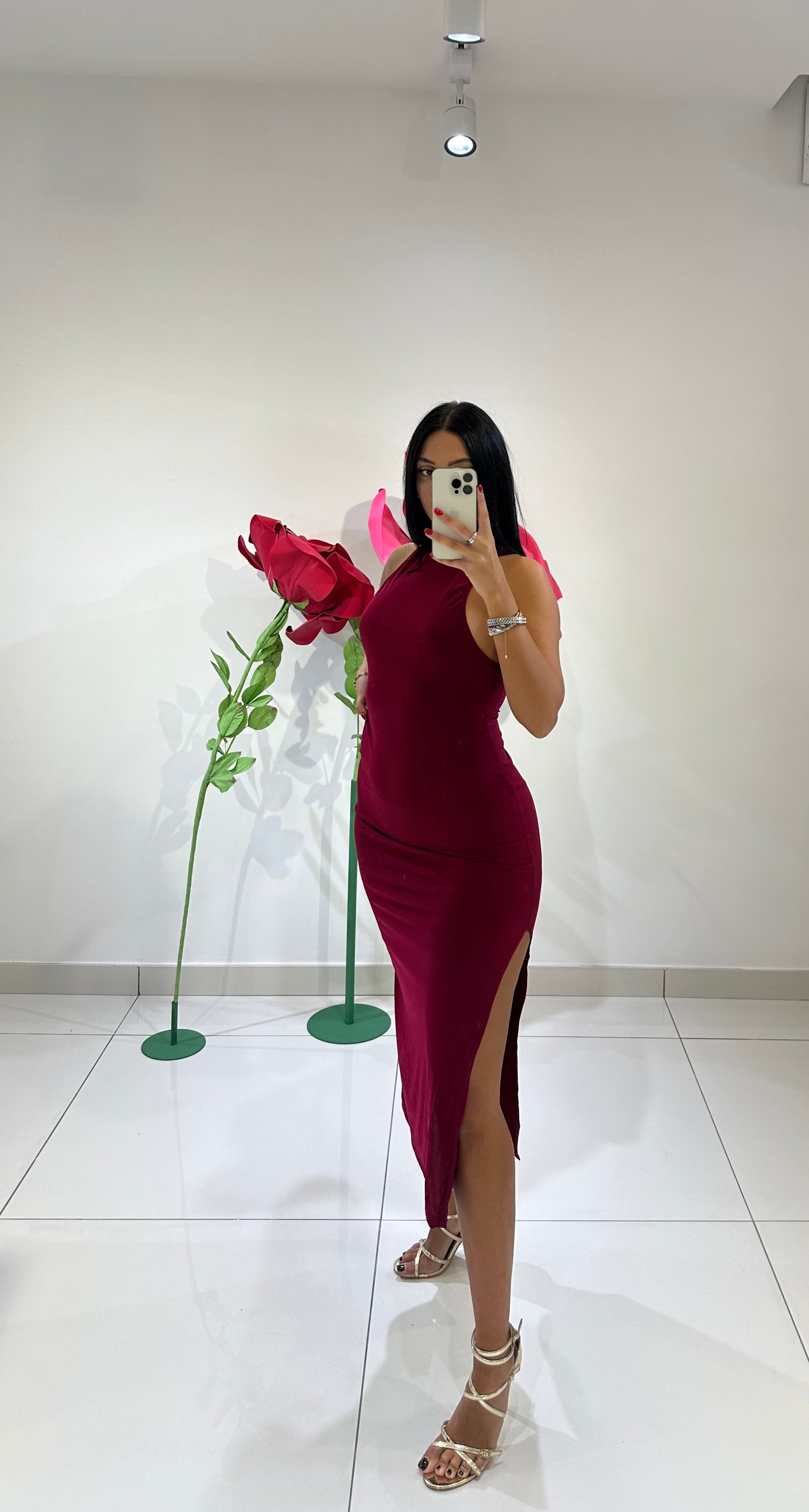 High-neck long dress with round sleeves and a side slit. Available in various colors.