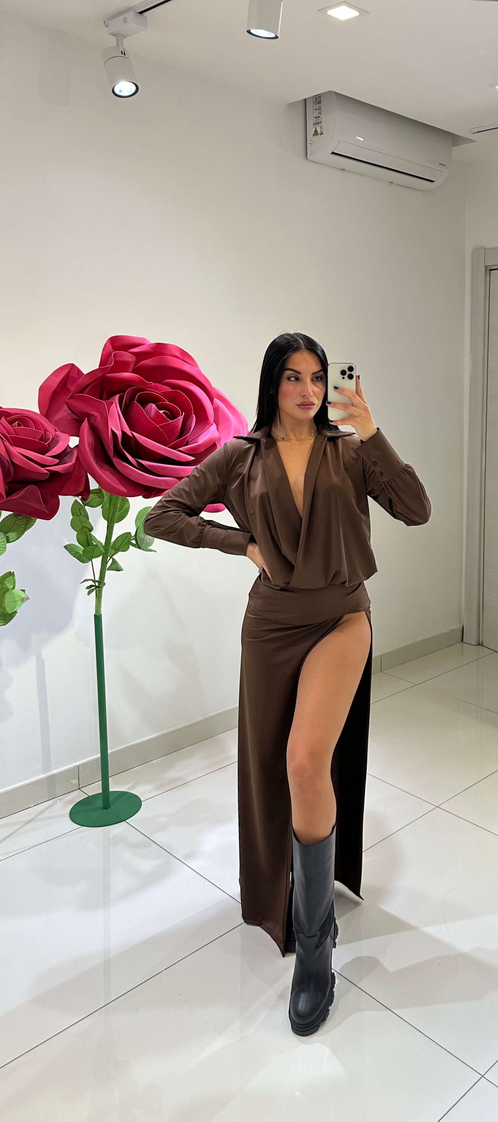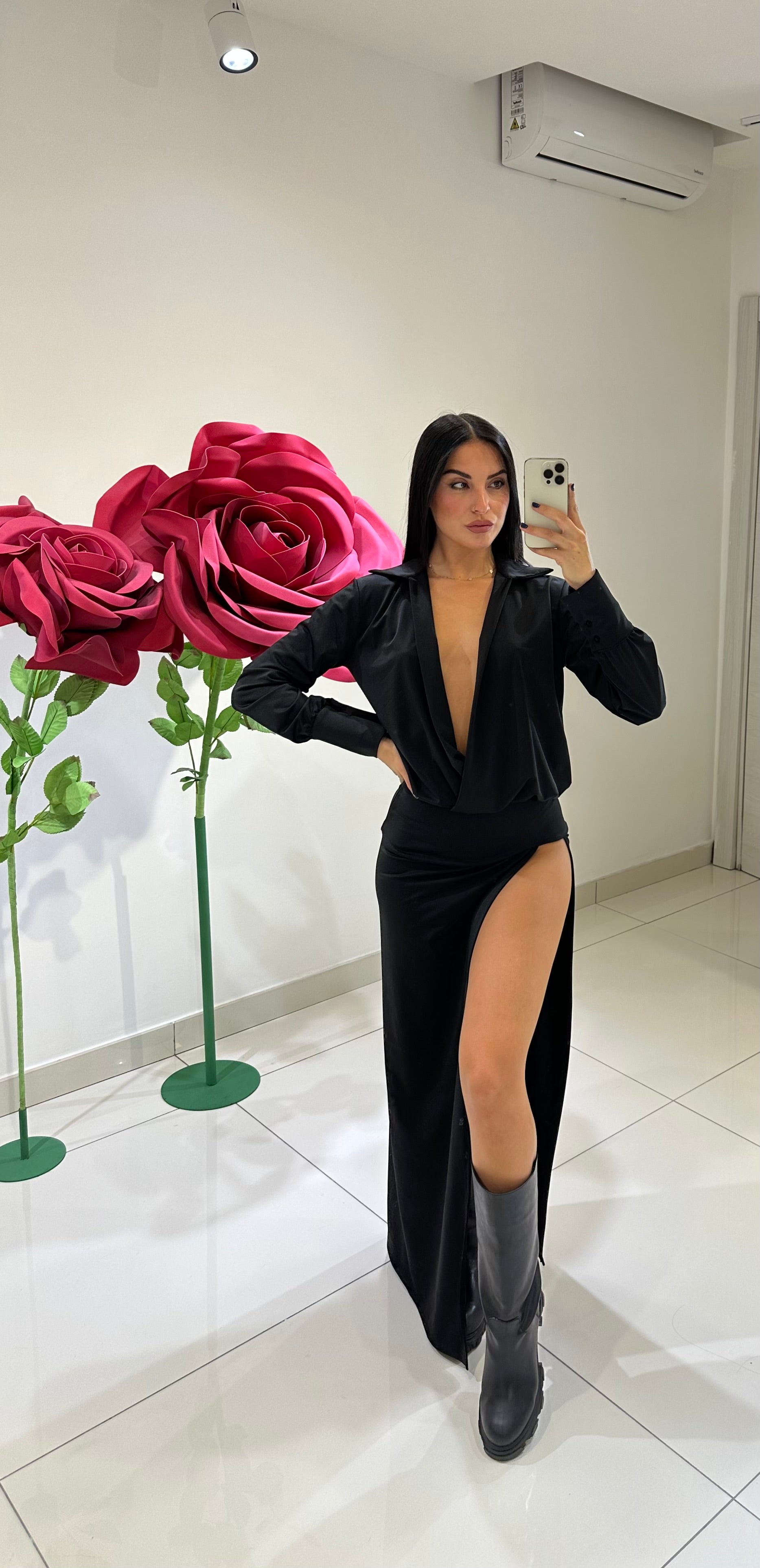 ABITO IN LYCRA CON PROFONDO SCOLLO MORBIDO, COLLETTO, GONNA LUNGA CON PROFONDO SPACCO LATERALE. IN VARI COLORI
