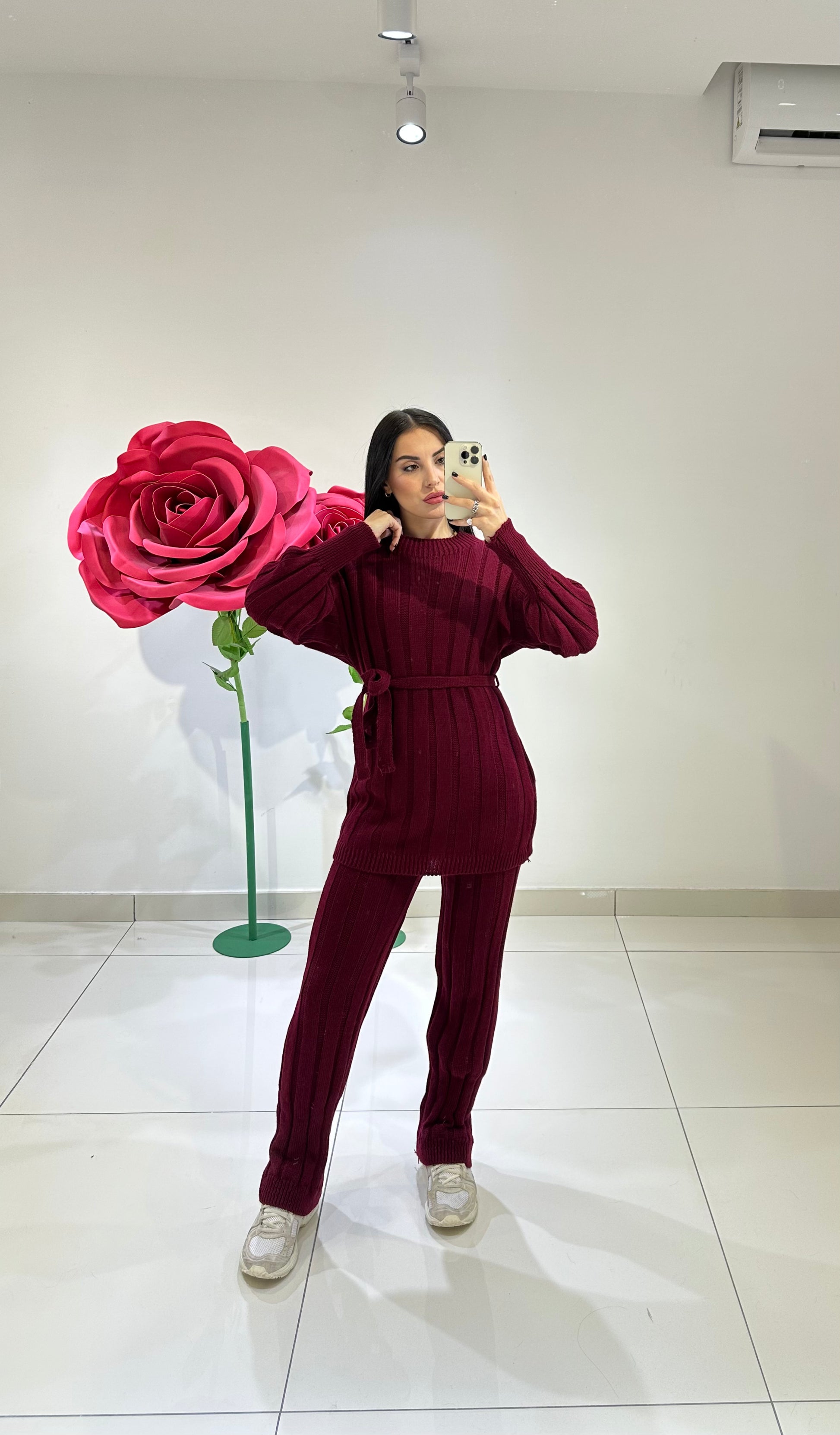 COORDSET IN LANA A COSTA LARGA, MAGLIONE GIROCOLLO CON CINTURA E PANTALONE GAMBA DRITTA A VITA ALTA CON ELASTICO. IN VARI COLORI